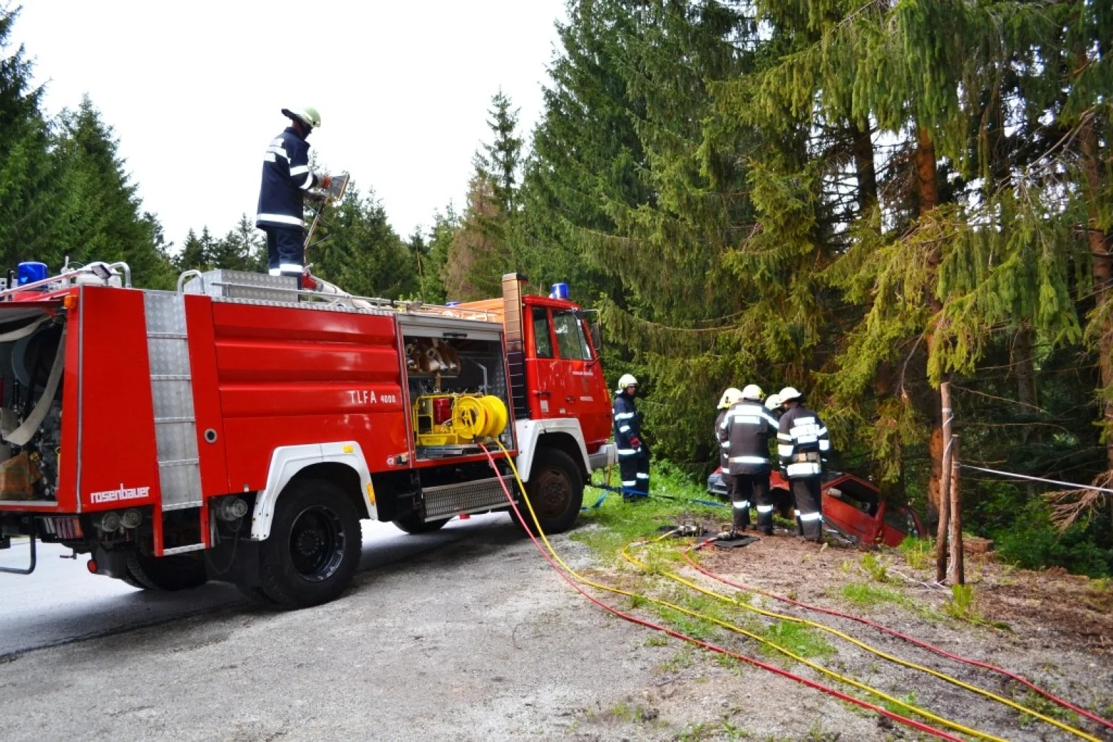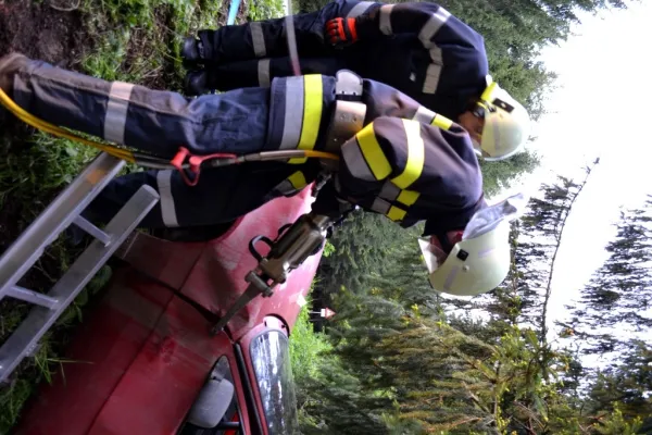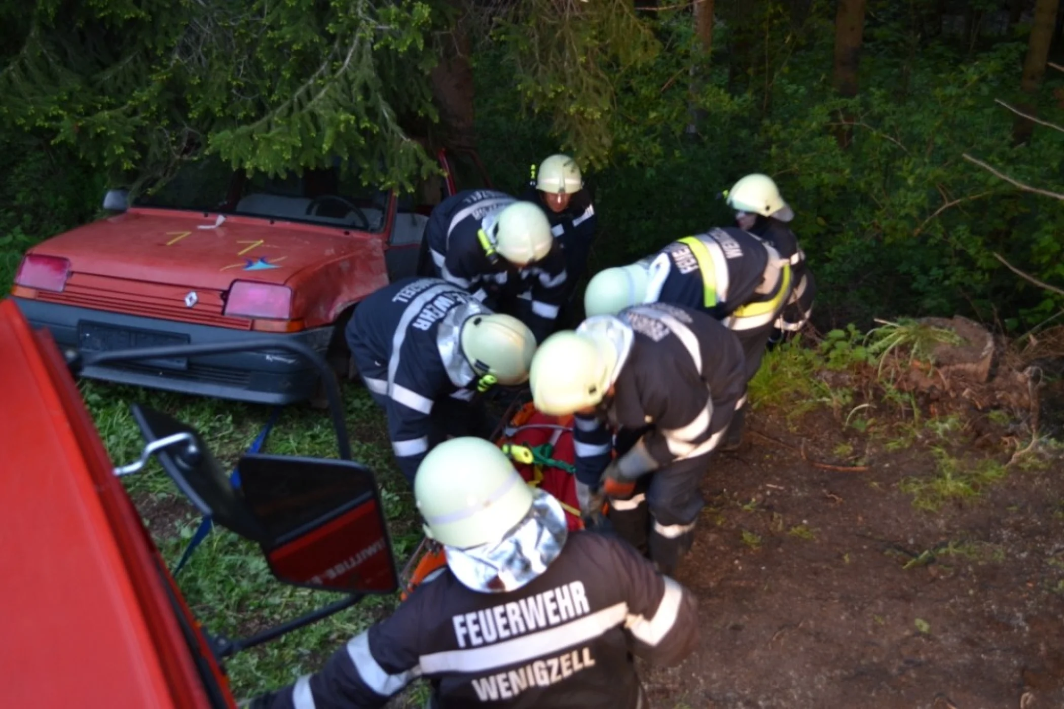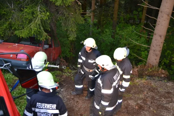 Ein PKW kam aus ungeklärter Ursache in der Kurve von der Fahrbahn ab und stürzte mit dem Heck eine Böschung hinunter, der Lenker welcher im PKW saß war bewusstlos und eingeklemmt, das Fahrzeug drohte die Böschung hinunter zu stürzen. Aufgaben der FF Wenigzell waren: