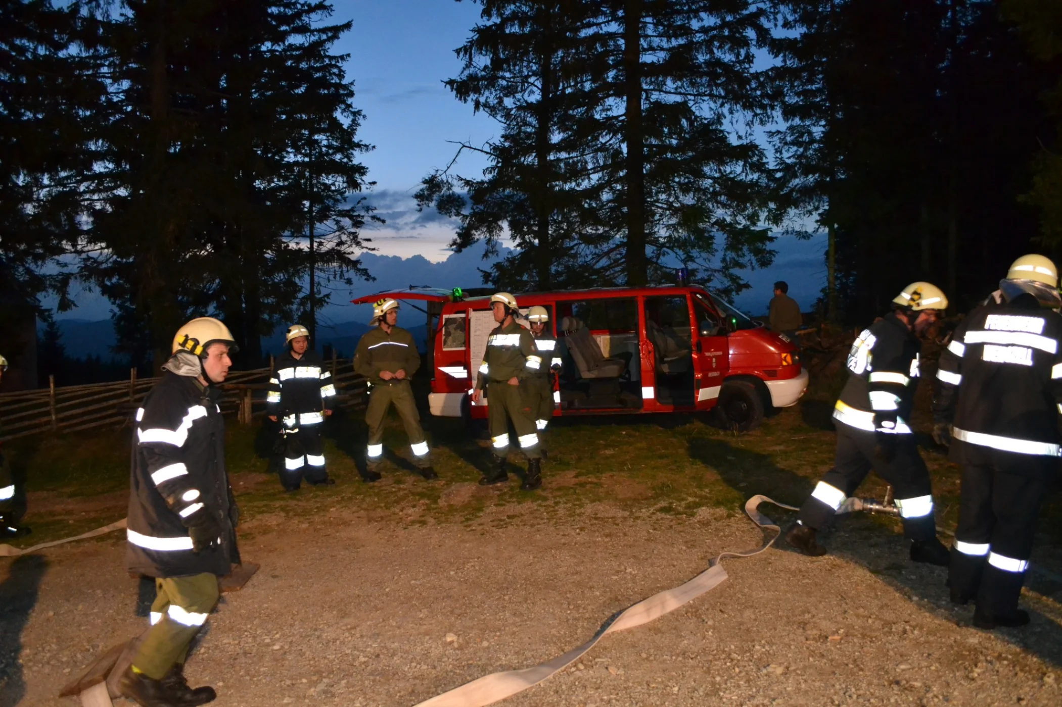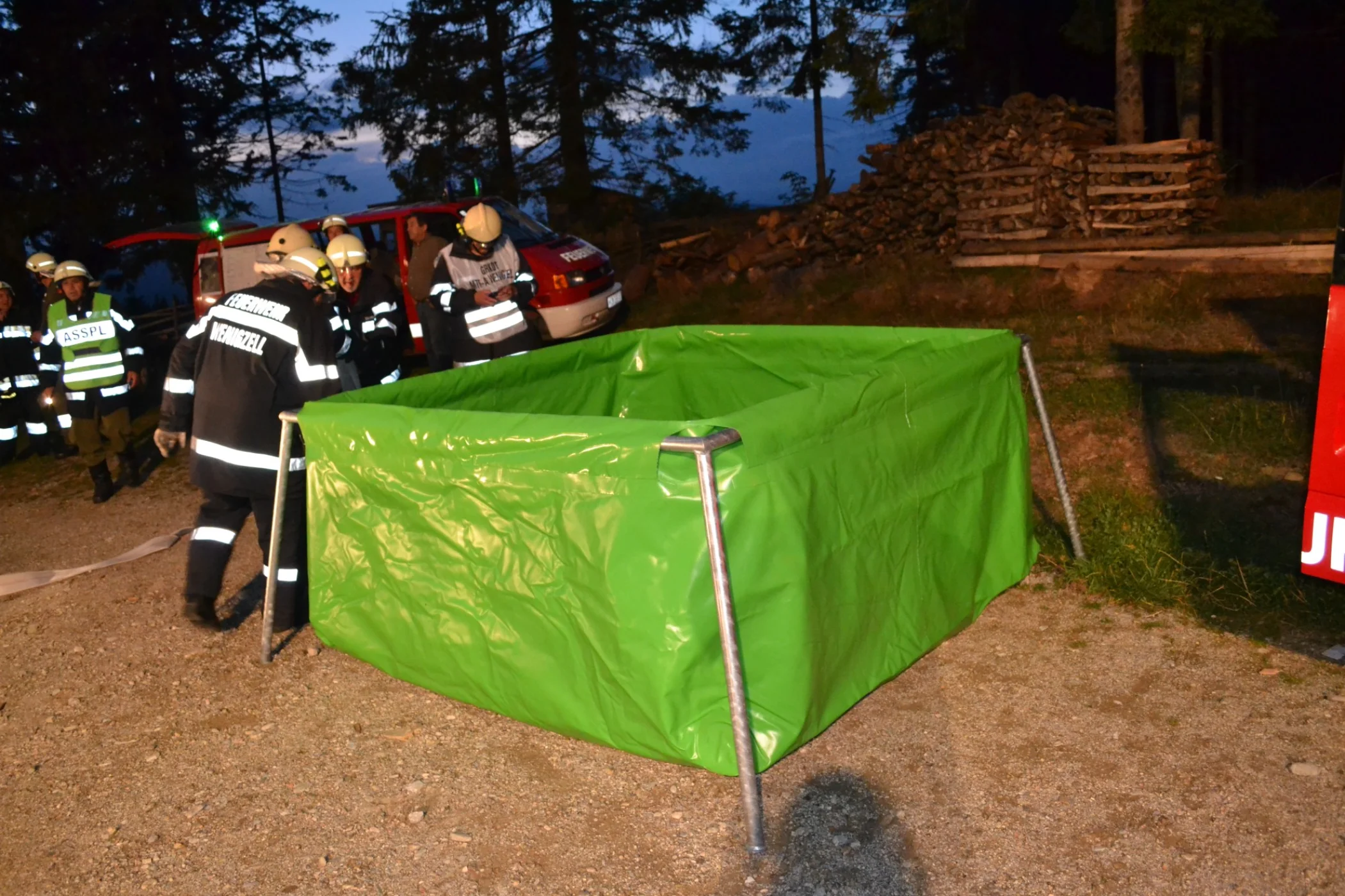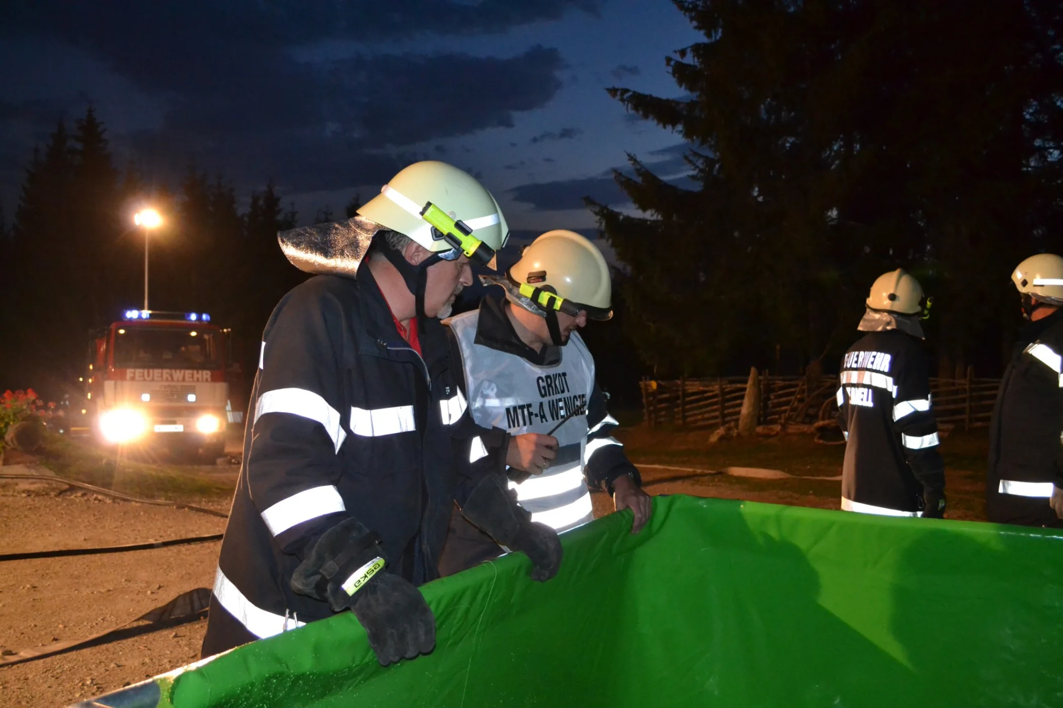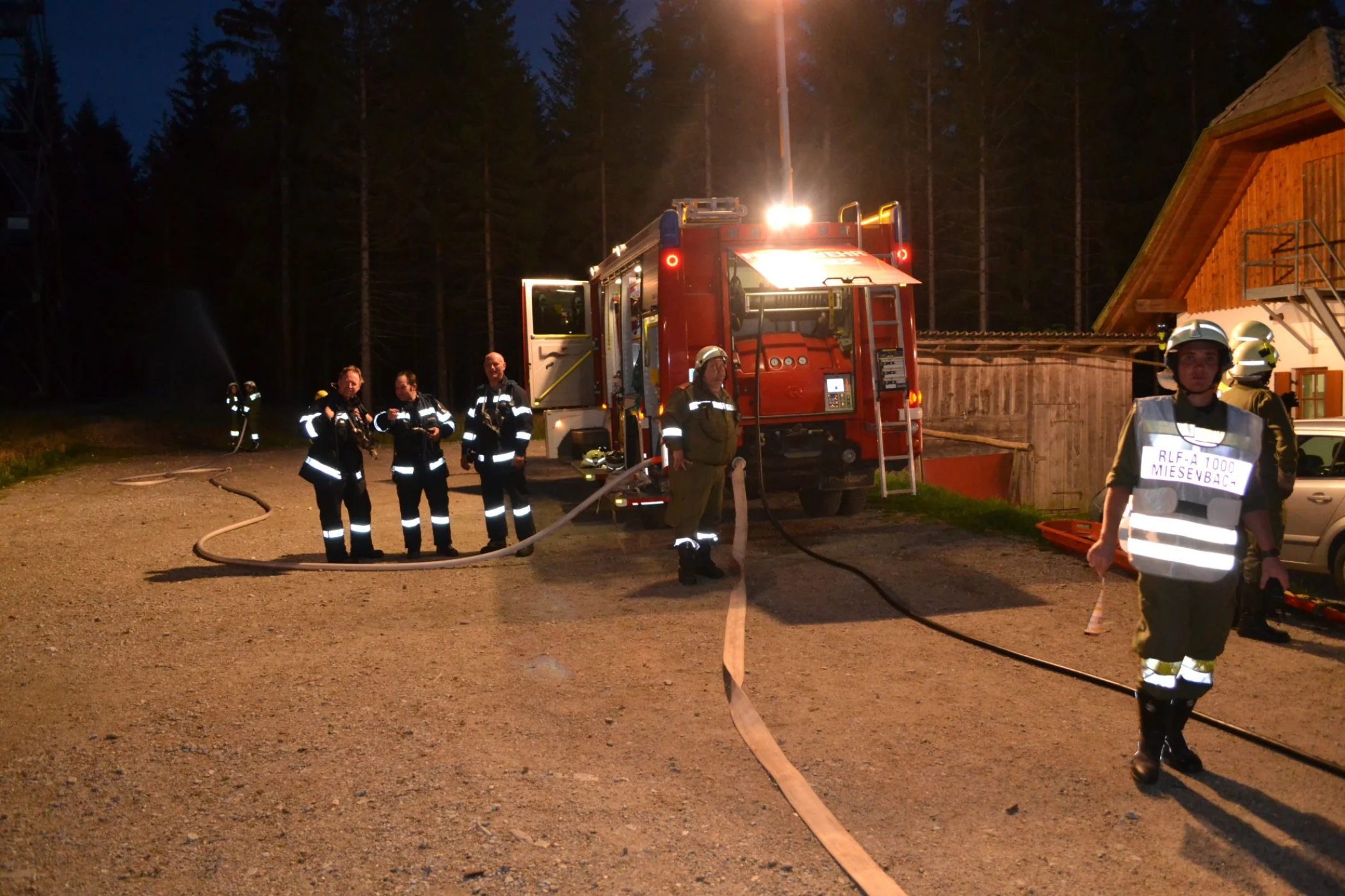 Als Übungsannahme war ein Brand auf der Wildwiesenhütte, mehrere Personen sind vermisst, der Brand droht auf den angrenzenden Wald überzugreifen. Der Einsatzort ist der höchstgelegene Punkt der Gemeinde Miesenbach mit 1256 m Seehöhe. Als nächstliegende Löschwasserversorgung befindet sich ein Löschteich beim Gasthaus Weber. Während die FF-Miesenbach mit der Brandbekämpfung unter schwerem Atemschutz begann, errichteten wir in Zusammenarbeit mit den Feuerwehren Birkfeld und Strallegg die Zubringleitung vom Löschteich auf die Wildwiese. Da 190m Höhenuntschied zu überwinden waren, kamen dabei drei Tragkraftspritzen zum Einsatz. Rund 900m B-Schlauch wurden auf dem steilen Gelände des ehemaligen Schilifts händisch verlegt. Als Löschwasserreserven standen das TLF 3000 Birkfeld und TLF 4000 Strallegg bereit. Während die Zubringleitung aufgebaut wurde, begann die Mannschaft des MTFA Wenigzell ihren neuen Faltbehälter aufzubauen, sodass das Wasser dann so rasch als möglich auf die einzelnen TLF´s und Pumpen aufgeteilt werden konnte. Durch das steile Gelände und die eintretende Dunkelheit waren alle Feuerwehrkameraden sehr gefordert, um ca. 21:00 Uhr konnte schließlich Brand aus gegeben werden.