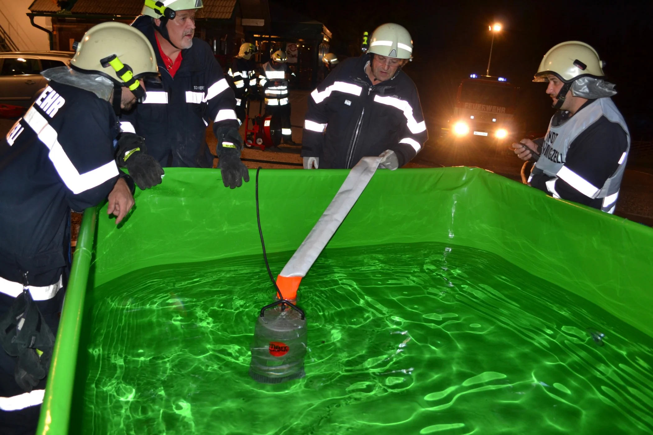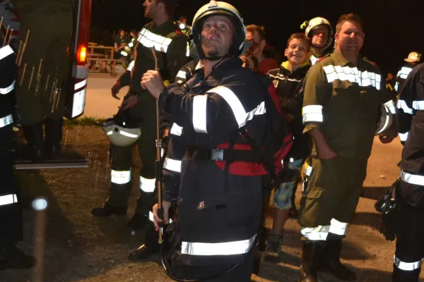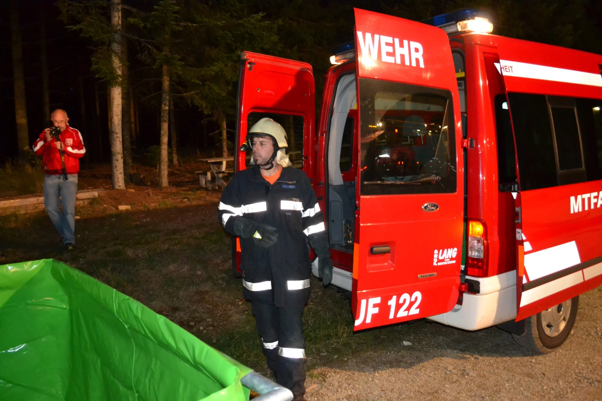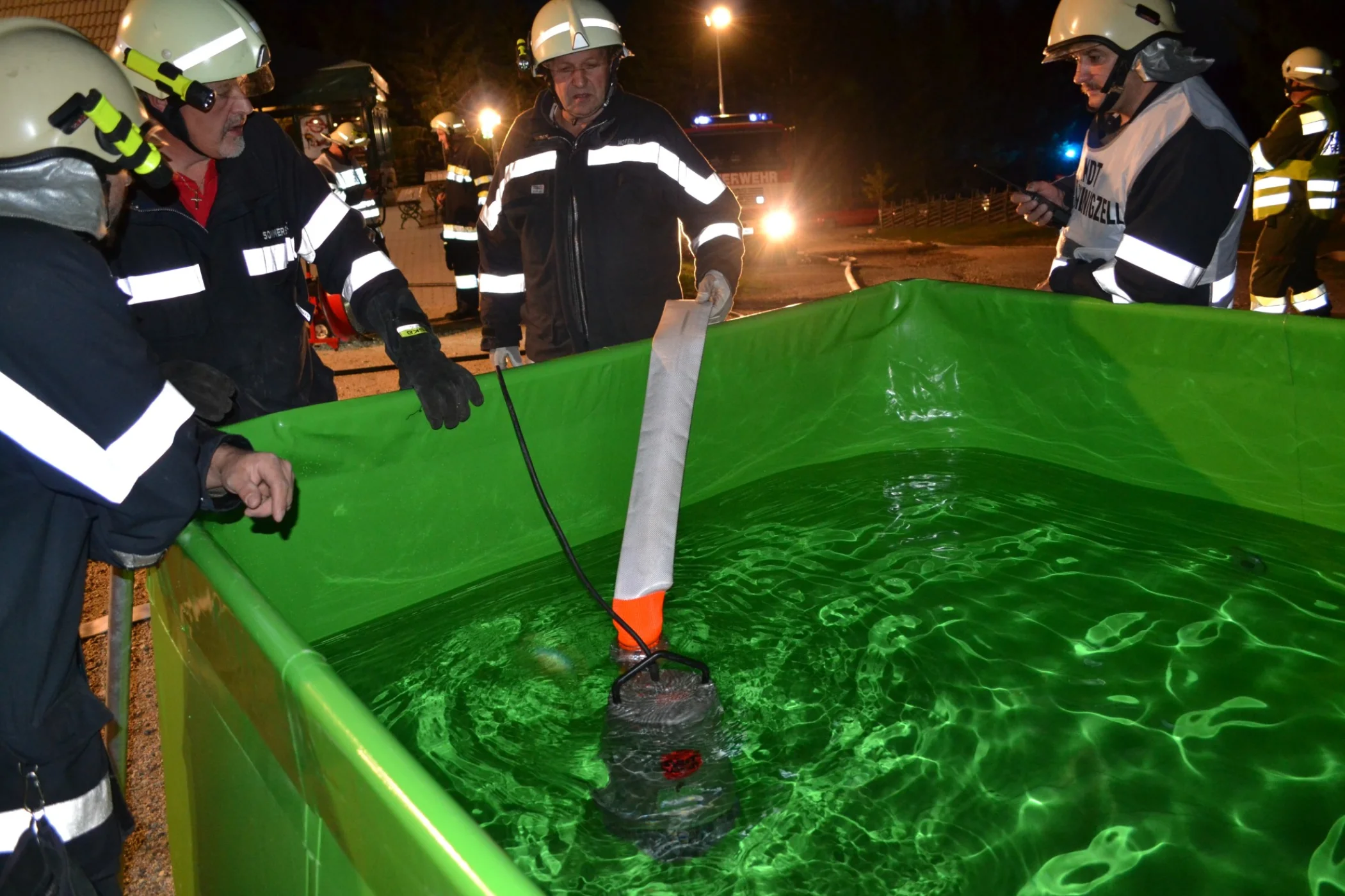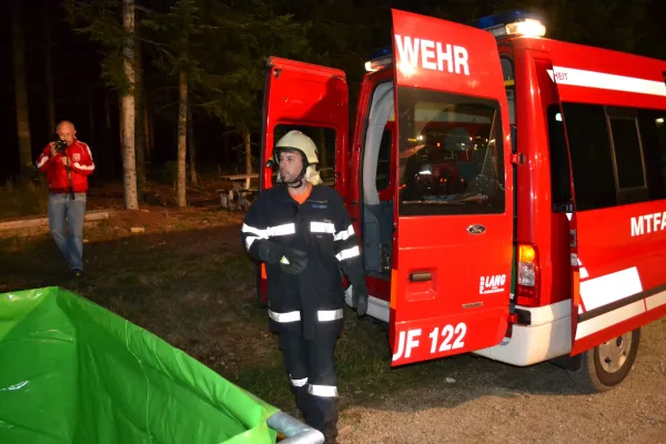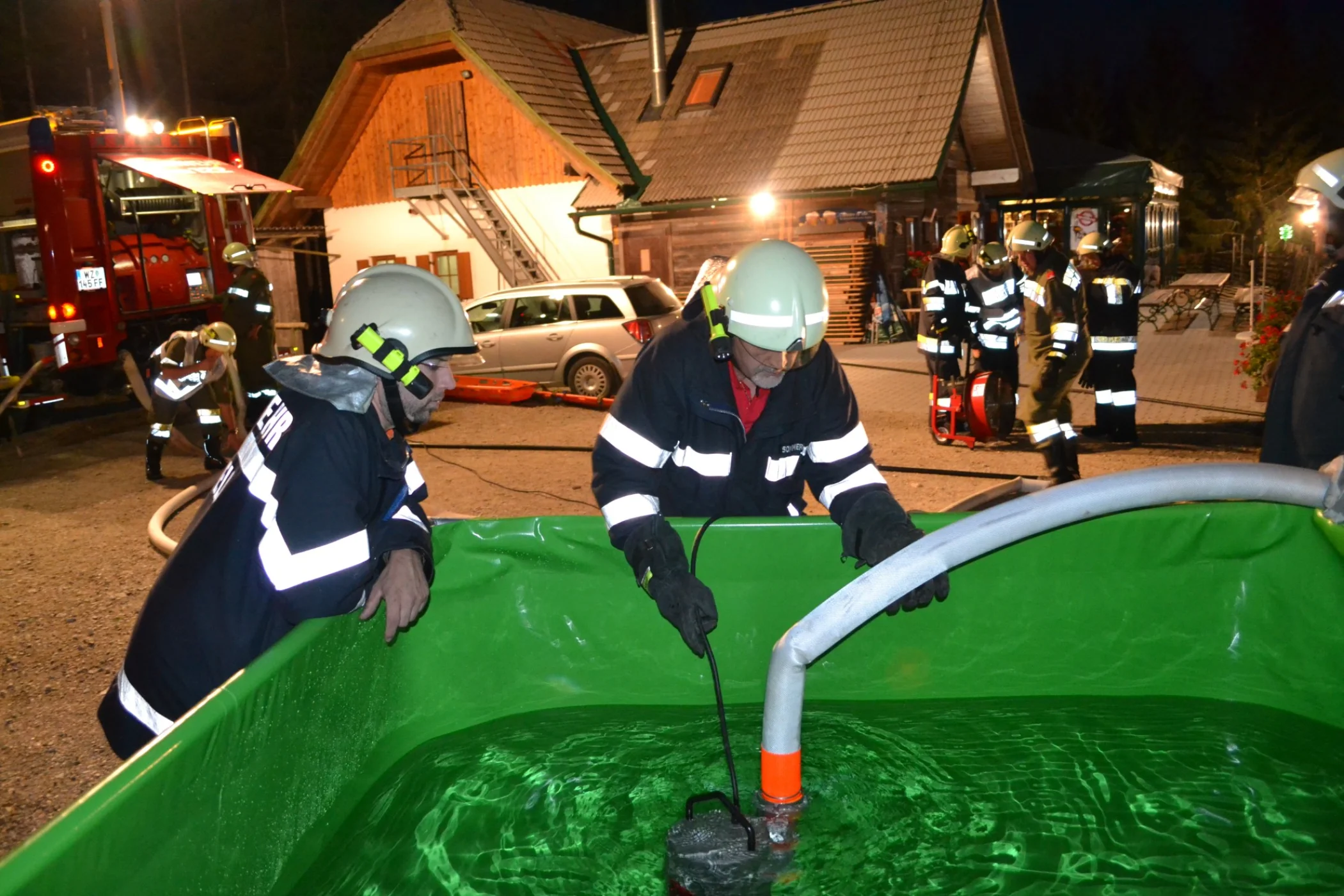 Als Übungsannahme war ein Brand auf der Wildwiesenhütte, mehrere Personen sind vermisst, der Brand droht auf den angrenzenden Wald überzugreifen. Der Einsatzort ist der höchstgelegene Punkt der Gemeinde Miesenbach mit 1256 m Seehöhe. Als nächstliegende Löschwasserversorgung befindet sich ein Löschteich beim Gasthaus Weber. Während die FF-Miesenbach mit der Brandbekämpfung unter schwerem Atemschutz begann, errichteten wir in Zusammenarbeit mit den Feuerwehren Birkfeld und Strallegg die Zubringleitung vom Löschteich auf die Wildwiese. Da 190m Höhenuntschied zu überwinden waren, kamen dabei drei Tragkraftspritzen zum Einsatz. Rund 900m B-Schlauch wurden auf dem steilen Gelände des ehemaligen Schilifts händisch verlegt. Als Löschwasserreserven standen das TLF 3000 Birkfeld und TLF 4000 Strallegg bereit. Während die Zubringleitung aufgebaut wurde, begann die Mannschaft des MTFA Wenigzell ihren neuen Faltbehälter aufzubauen, sodass das Wasser dann so rasch als möglich auf die einzelnen TLF´s und Pumpen aufgeteilt werden konnte. Durch das steile Gelände und die eintretende Dunkelheit waren alle Feuerwehrkameraden sehr gefordert, um ca. 21:00 Uhr konnte schließlich Brand aus gegeben werden.