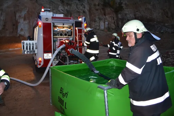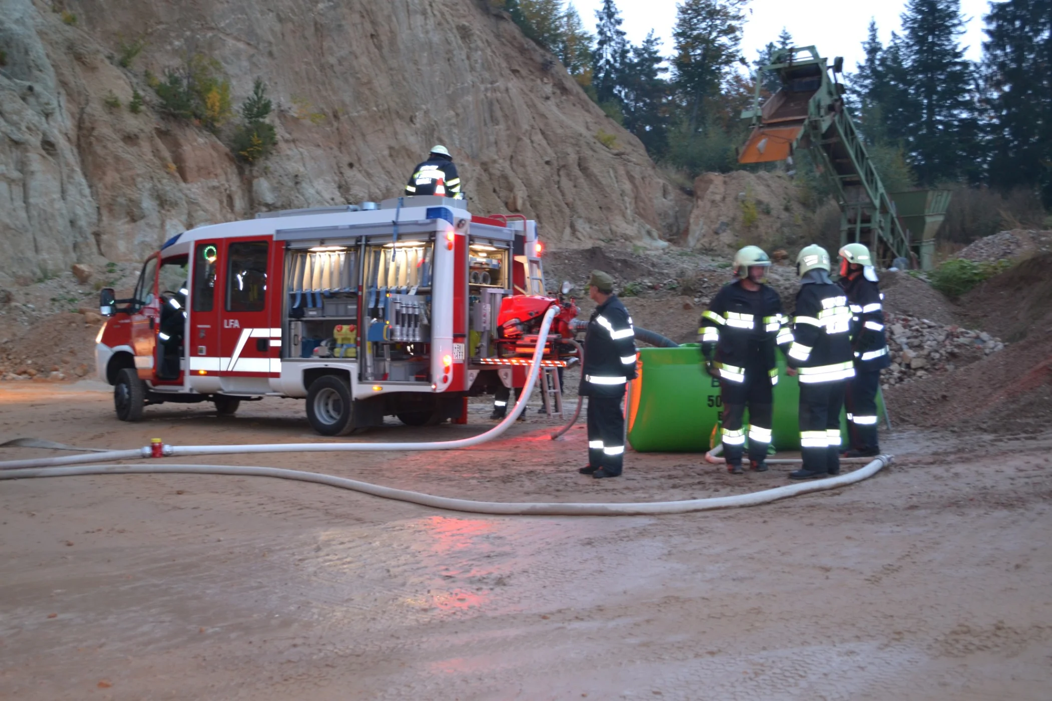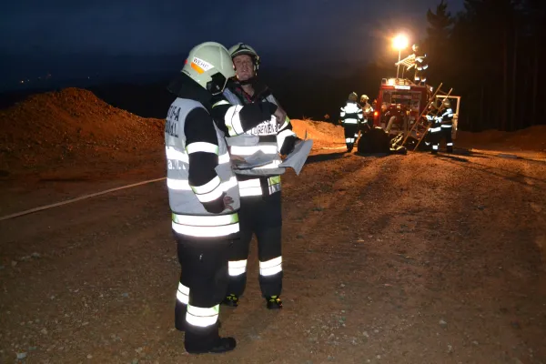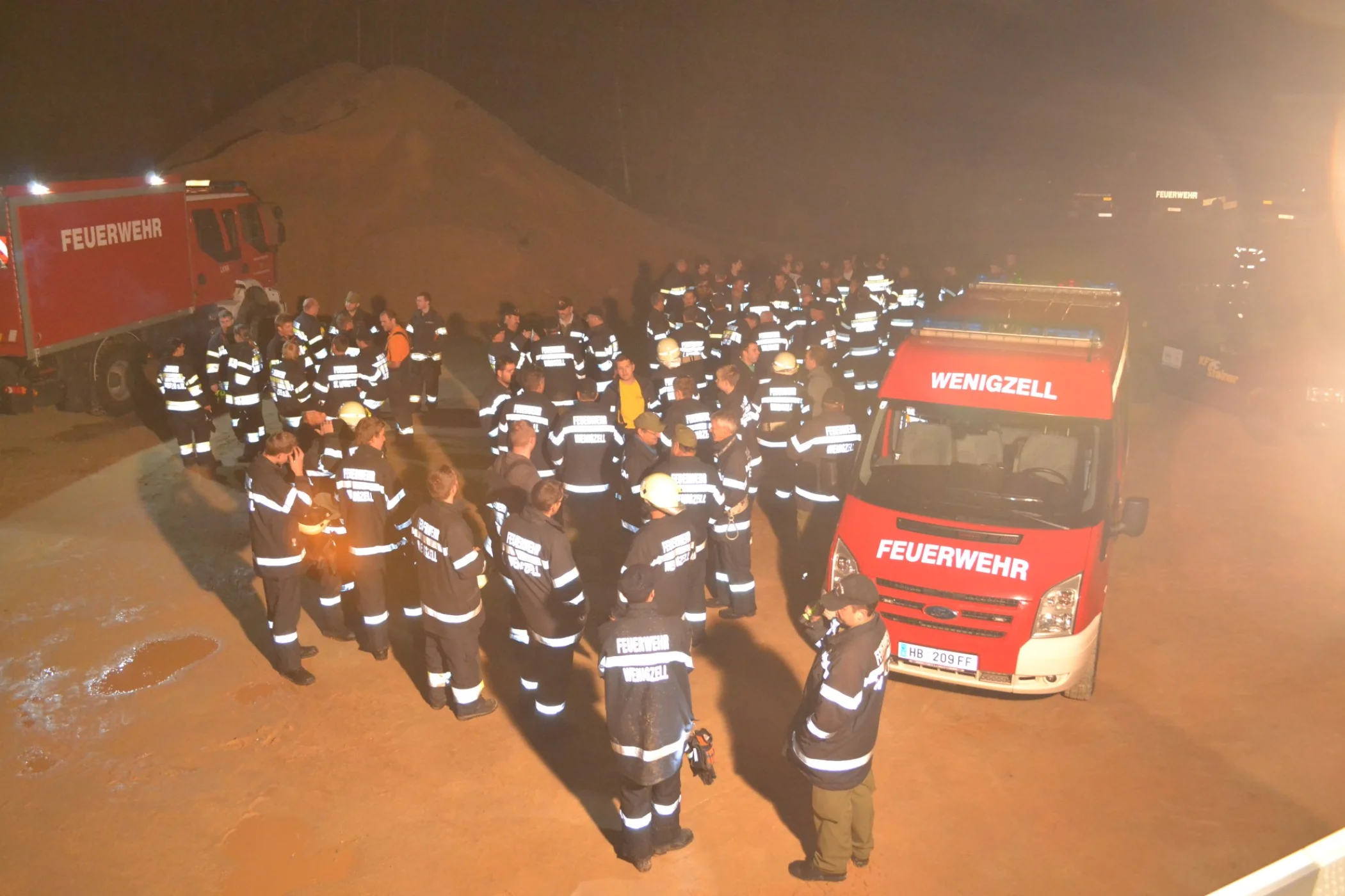 Sofort wurde über Florian Hartberg ein Abschnittsalarm hinausgesendet, wonach die Feuerwehren, St. Jakob im Walde, Waldbach, Mönichwald, St. Lorenzen a. Wechsel, Rohrbach a.d. Lafnitz, Eichberg und Vorau im Minutentakt bei der Schottergrube eintrafen. Während die Mannschaft des LFA Wenigzell mit dem Aufbau des Faltbehälters und mit dem Errichten der Zubringleitung auf den Schotterberg beschäftigt war, wurde mittels TLFA-4000 Wenizell, TLFA 3000 St. Jakob i. Walde, TLFA 2000 Eichberg und TLFA 2000 Vorau ein Pendelverkehr eingerichtet, sodass der Faltbehälter immer mit Wasser versorgt werden konnte. Auf ca. halber Höhe des Schotterberges wurde die Tragkraftspritze der FF Waldbach im Relaisbetrieb an die TS der FF Wenigzell angeschlossen. Von der TS Waldbach wurde dann das Wasser entlang einer B-Druckschlauchleitung ganz nach oben gepumpt und wieder in einen Faltbehälter eingelassen, von welchem die Tragkraftspritze Mönichwald gespeist wurde, welche dann die Strahlrohre ganz am Gipfel der Schottergrube mit Wasser versorgte. Während die Schlauchleitung aufgebaut wurde, begann man mittels LKWA St. Lorenzen a. Wechsel, die Trupps welche bereits mit Waldbrandbekämpfungsrucksäcken, Feuerpatschen, Motorsägen etc. ausgerüstet waren, auf den Gipfel hinauf zu befördern.