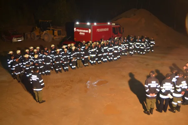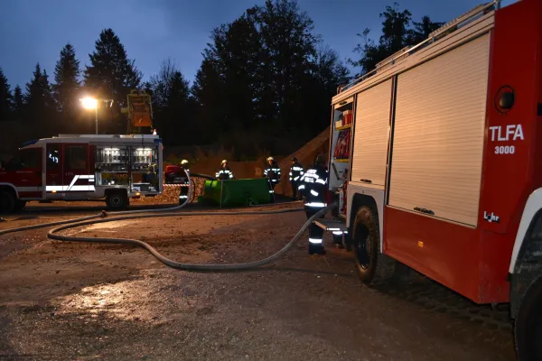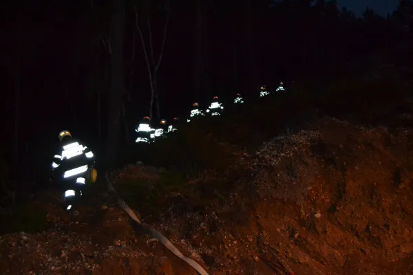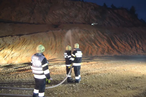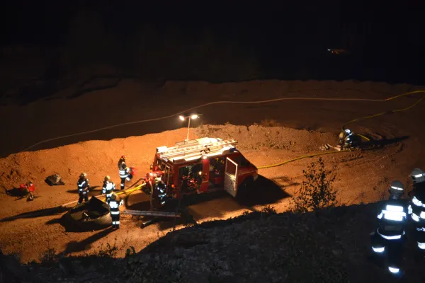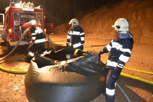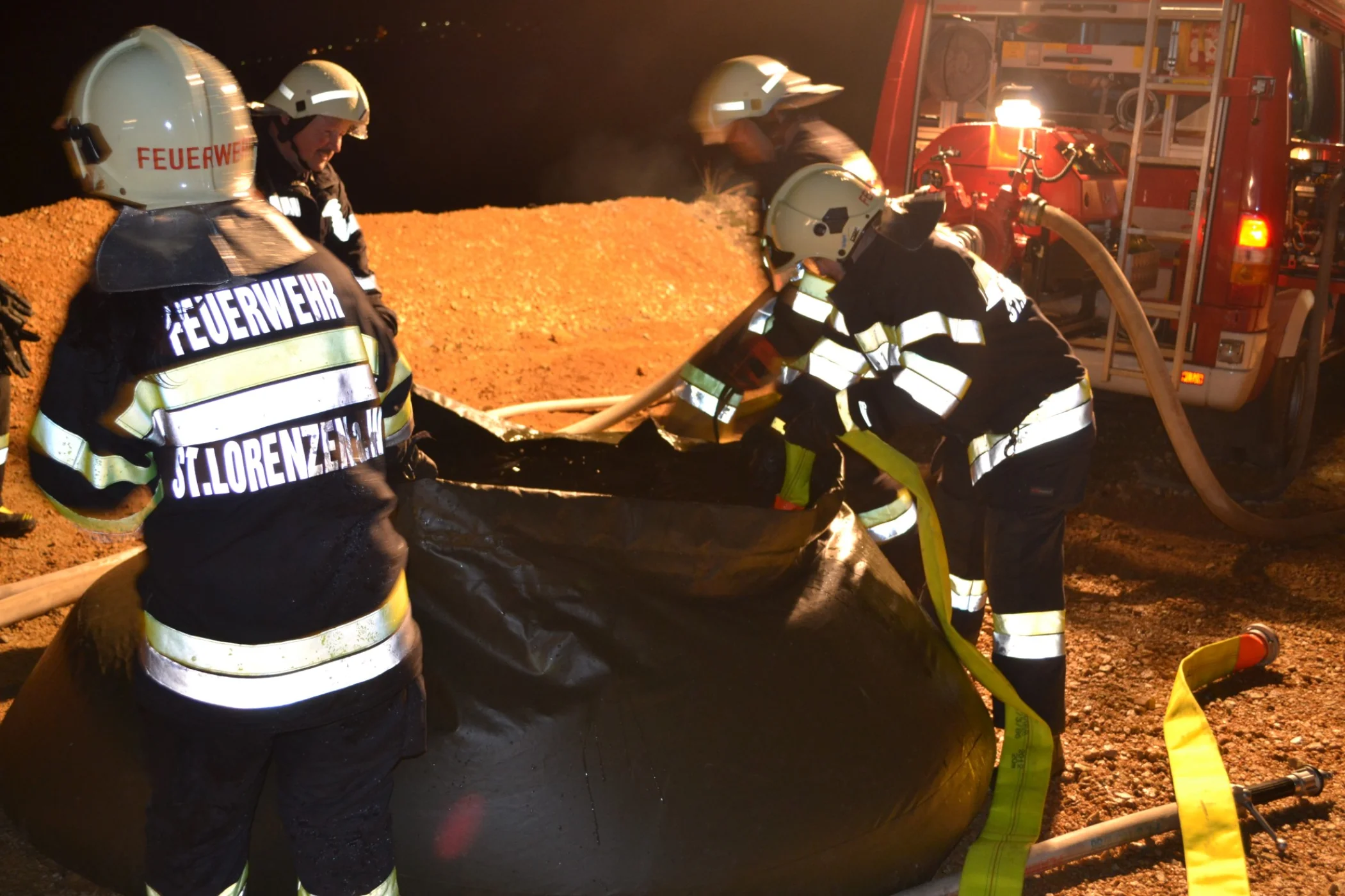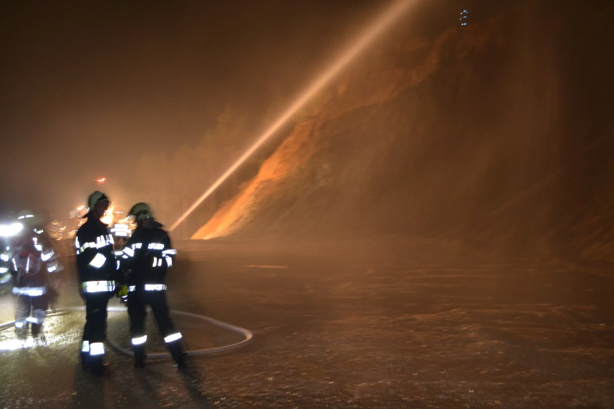 Sofort wurde über Florian Hartberg ein Abschnittsalarm hinausgesendet, wonach die Feuerwehren, St. Jakob im Walde, Waldbach, Mönichwald, St. Lorenzen a. Wechsel, Rohrbach a.d. Lafnitz, Eichberg und Vorau im Minutentakt bei der Schottergrube eintrafen. Während die Mannschaft des LFA Wenigzell mit dem Aufbau des Faltbehälters und mit dem Errichten der Zubringleitung auf den Schotterberg beschäftigt war, wurde mittels TLFA-4000 Wenizell, TLFA 3000 St. Jakob i. Walde, TLFA 2000 Eichberg und TLFA 2000 Vorau ein Pendelverkehr eingerichtet, sodass der Faltbehälter immer mit Wasser versorgt werden konnte. Auf ca. halber Höhe des Schotterberges wurde die Tragkraftspritze der FF Waldbach im Relaisbetrieb an die TS der FF Wenigzell angeschlossen. Von der TS Waldbach wurde dann das Wasser entlang einer B-Druckschlauchleitung ganz nach oben gepumpt und wieder in einen Faltbehälter eingelassen, von welchem die Tragkraftspritze Mönichwald gespeist wurde, welche dann die Strahlrohre ganz am Gipfel der Schottergrube mit Wasser versorgte. Während die Schlauchleitung aufgebaut wurde, begann man mittels LKWA St. Lorenzen a. Wechsel, die Trupps welche bereits mit Waldbrandbekämpfungsrucksäcken, Feuerpatschen, Motorsägen etc. ausgerüstet waren, auf den Gipfel hinauf zu befördern.