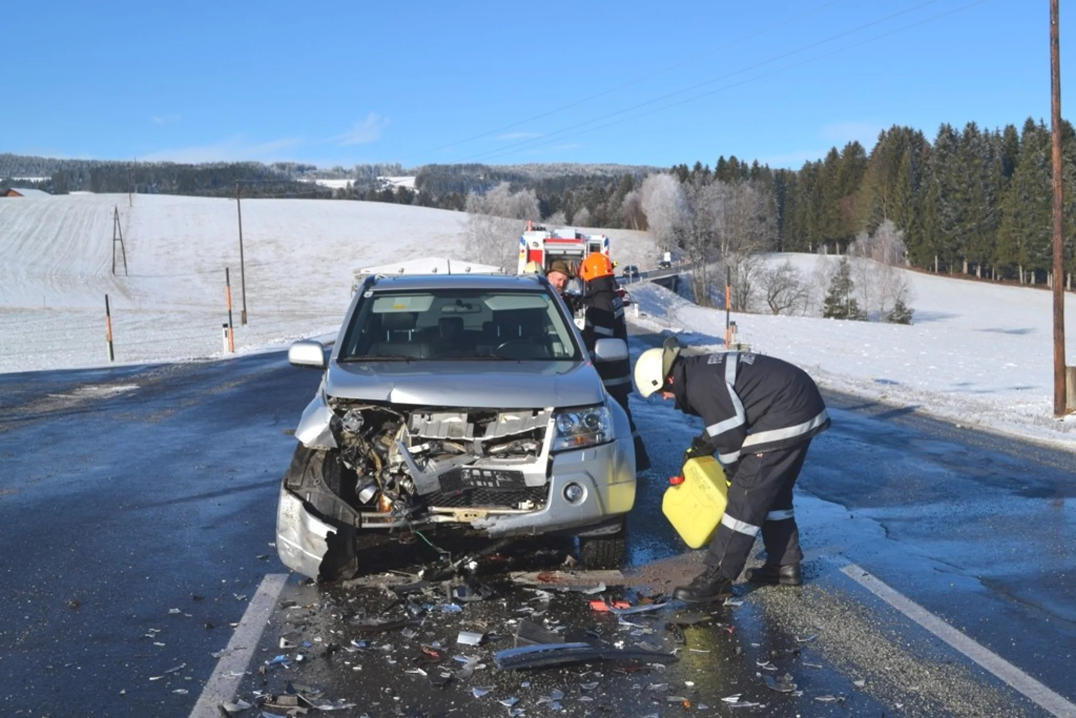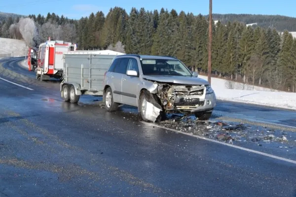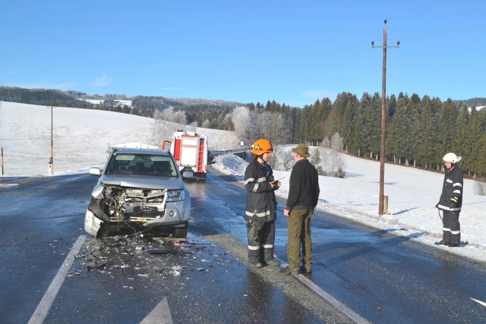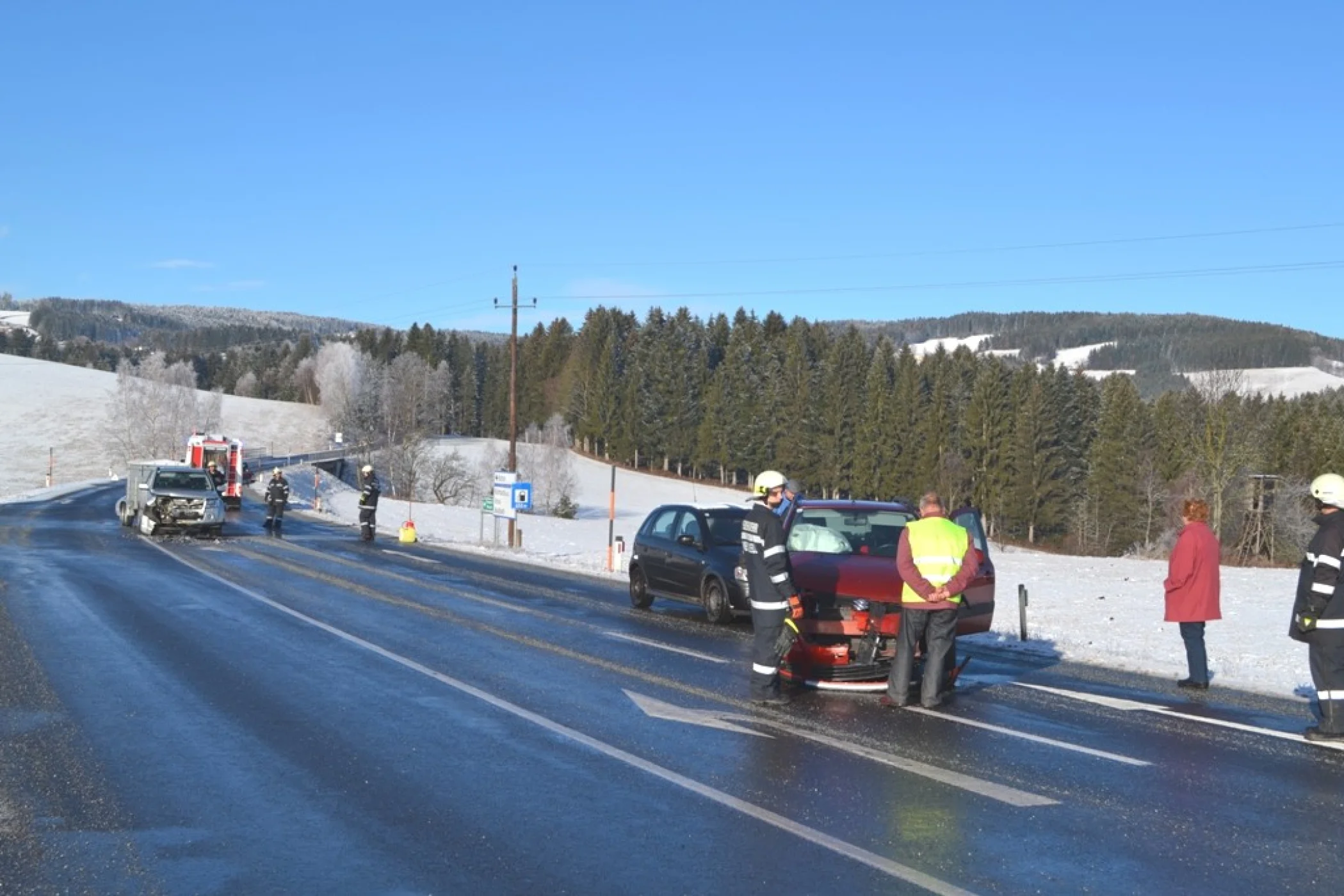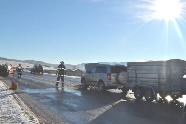 Gleich zu Beginn des neuen Jahres, am 05.01.2016 um 09:50 Uhr wurde die Freiwillige Feuerwehr Wenigzell zu einem Einsatz gerufen. Grund für die Ausrückung war ein Verkehrsunfall bei der Almerkreuzung (L408 zu L415). Aus noch ungeklärter Ursache stießen 2 Autos, davon eines mit einem Anhänger, welcher mit 2 Kälbern beladen war zusammen. Sofort wurde die Straße gesperrt sodass der Unfall von der Polizei aufgenommen werden konnte.