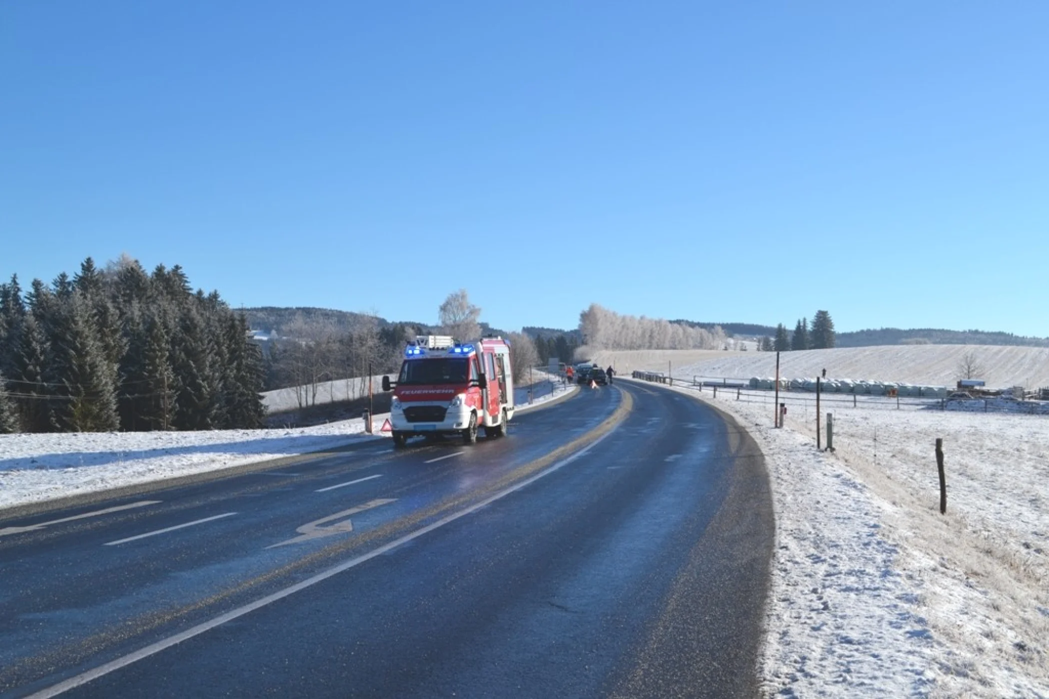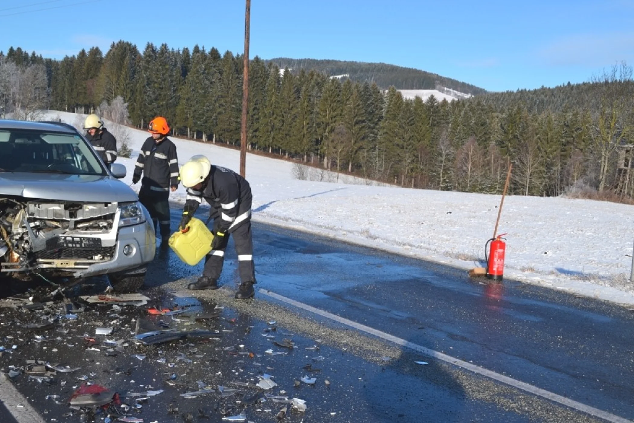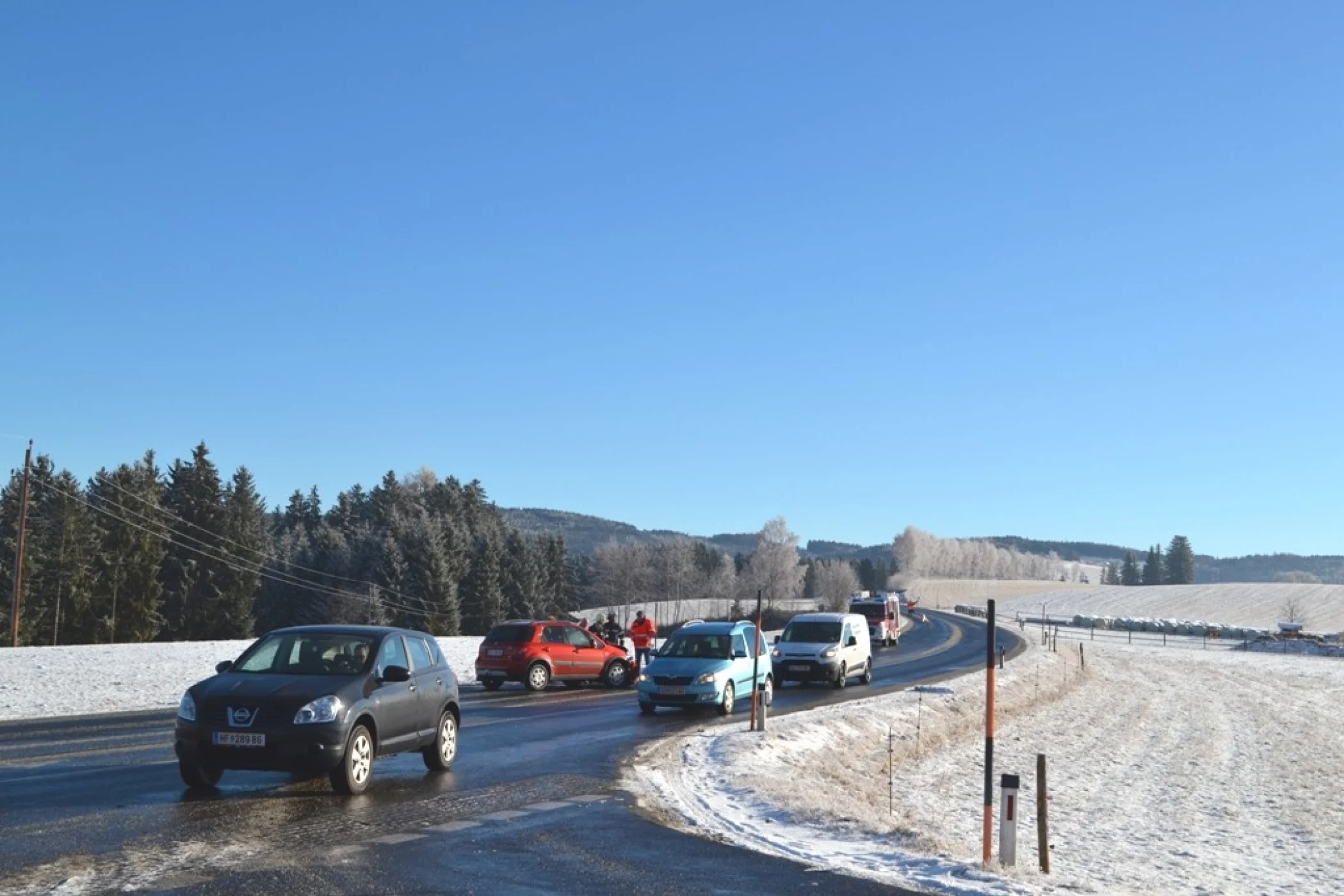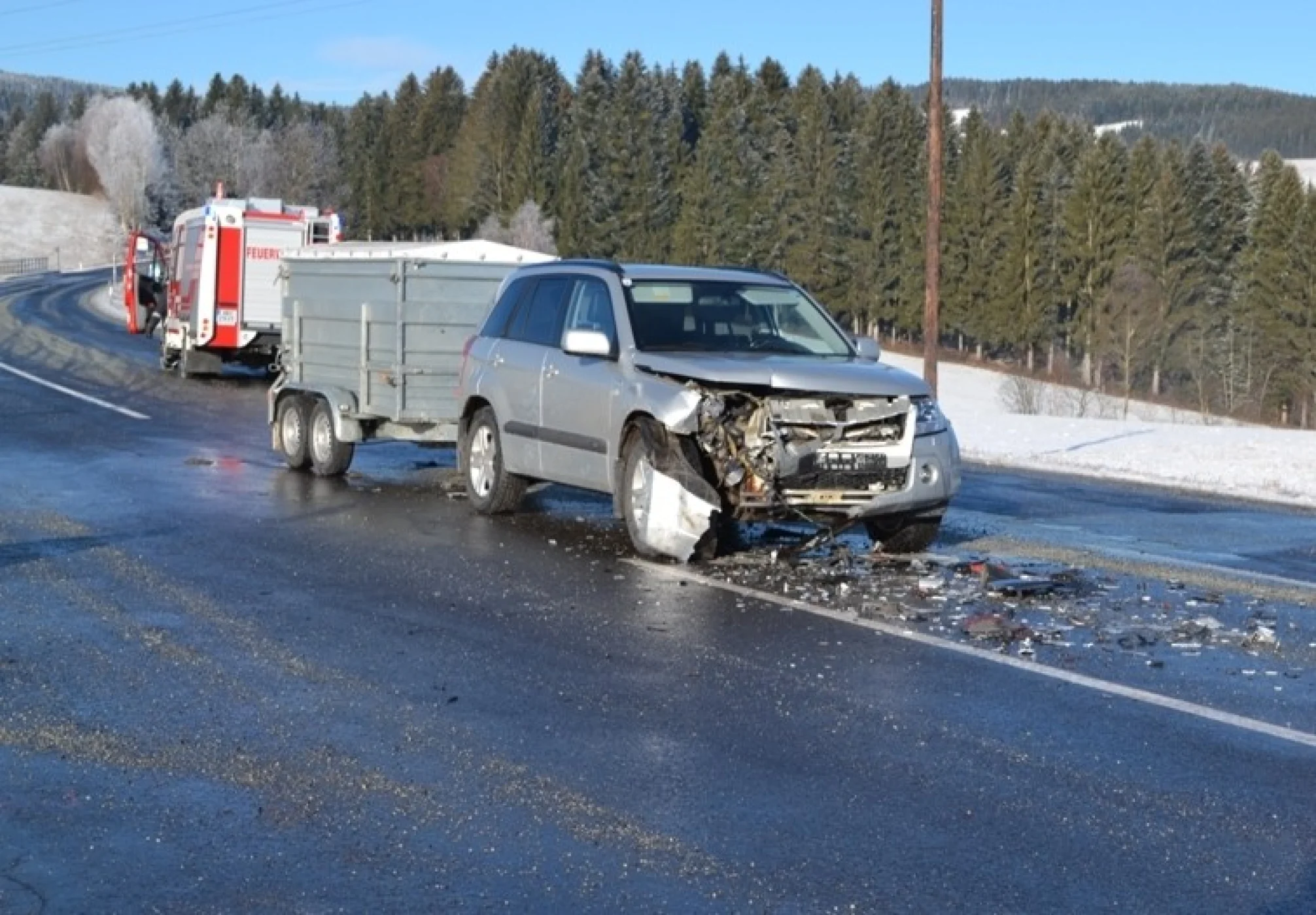 Gleich zu Beginn des neuen Jahres, am 05.01.2016 um 09:50 Uhr wurde die Freiwillige Feuerwehr Wenigzell zu einem Einsatz gerufen. Grund für die Ausrückung war ein Verkehrsunfall bei der Almerkreuzung (L408 zu L415). Aus noch ungeklärter Ursache stießen 2 Autos, davon eines mit einem Anhänger, welcher mit 2 Kälbern beladen war zusammen. Sofort wurde die Straße gesperrt sodass der Unfall von der Polizei aufgenommen werden konnte.