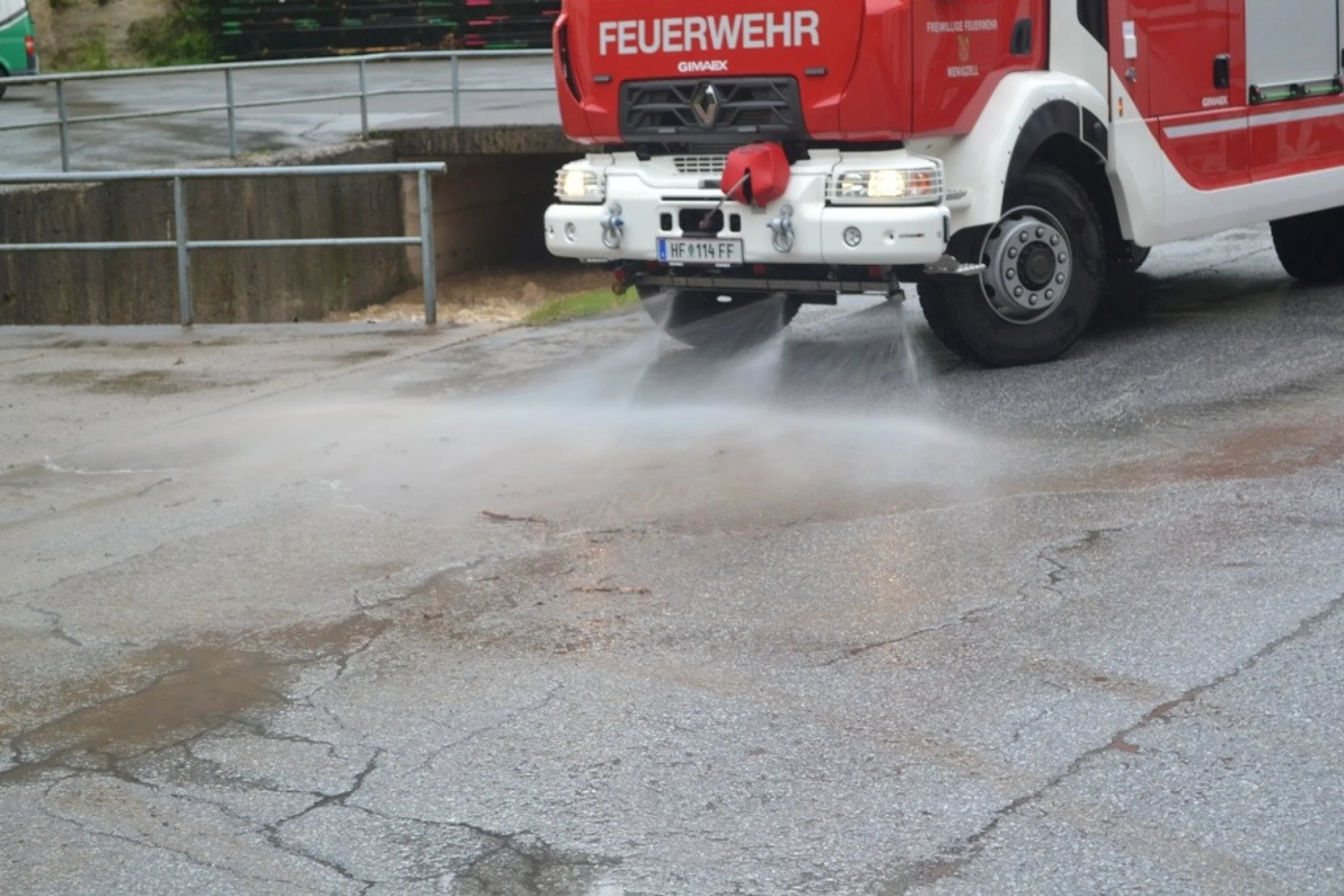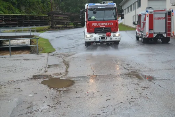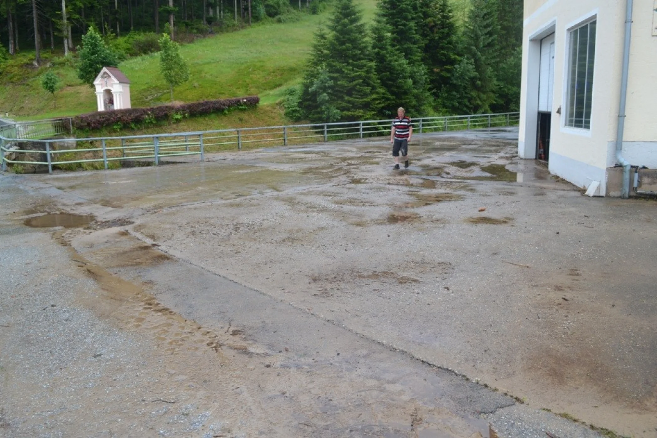 Die Kameraden welche mit dem LFA im Einsatz waren fuhren demnach zur Firma Mayrhofer Maschinenbau wo der „Kraxenbach“ eine Brücke überschwemmte und somit der gesamte Vorplatz mit Schlamm verdreckt war. Nachdem das RLFA-2000/100 mit den Reinigungsarbeiten in der Stocksporthalle fertig war rückte dieses ebenfalls zur Firma Mayrhofer aus, wo mittels Straßenwaschanlage der Schlamm und Dreck ohne größeren Mühen und zur Entlastung der Kameraden weggespritzt werden konnte.