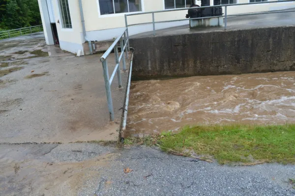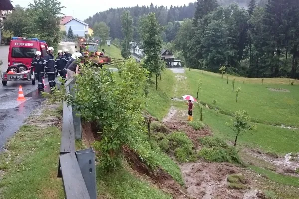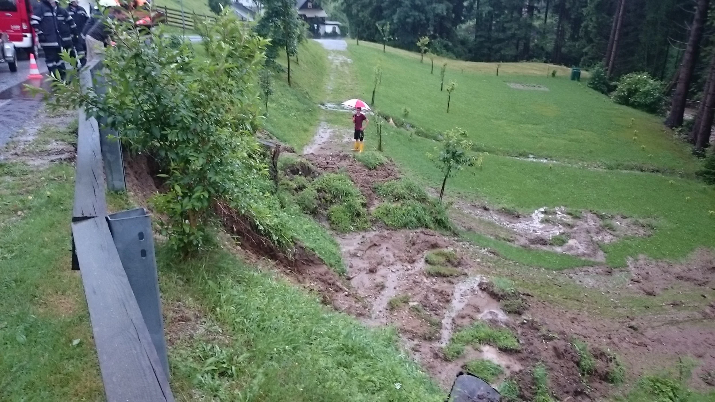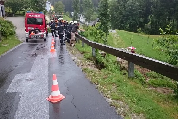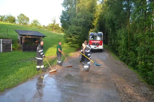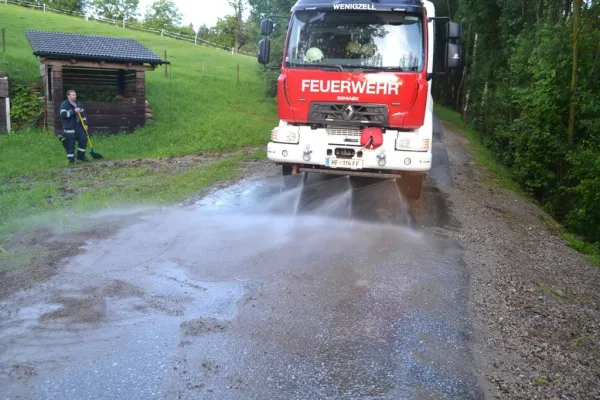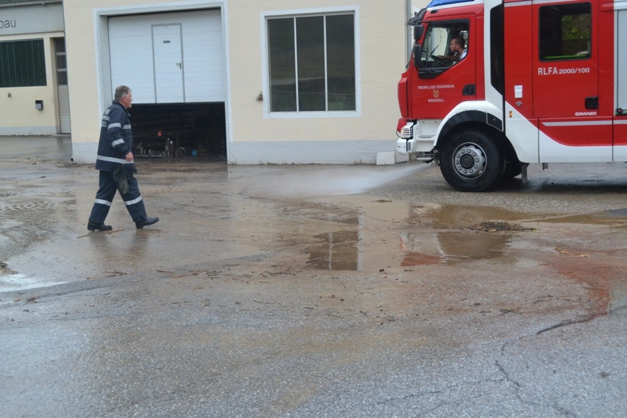 Die Kameraden welche mit dem LFA im Einsatz waren fuhren demnach zur Firma Mayrhofer Maschinenbau wo der „Kraxenbach“ eine Brücke überschwemmte und somit der gesamte Vorplatz mit Schlamm verdreckt war. Nachdem das RLFA-2000/100 mit den Reinigungsarbeiten in der Stocksporthalle fertig war rückte dieses ebenfalls zur Firma Mayrhofer aus, wo mittels Straßenwaschanlage der Schlamm und Dreck ohne größeren Mühen und zur Entlastung der Kameraden weggespritzt werden konnte.