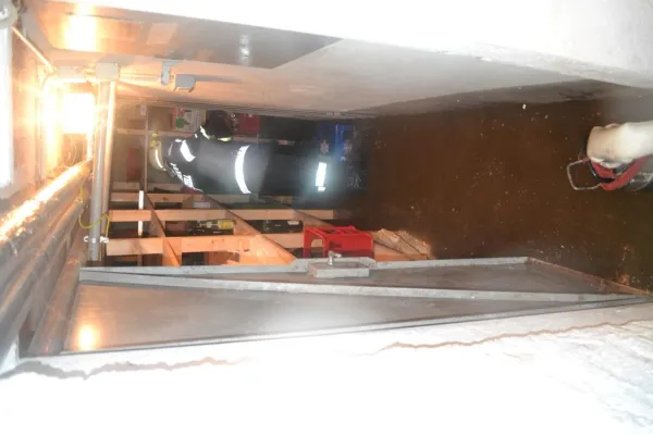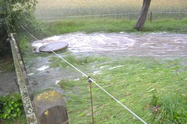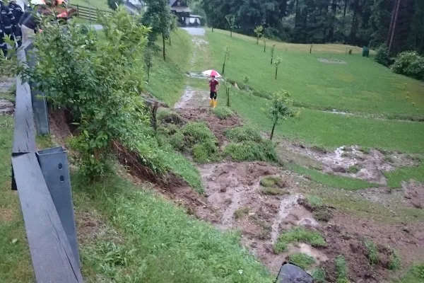 Als wir mit den Auspumparbeiten mittels Tauchpumpen und Tragkraftspritzen von RLFA-2000/100 und LFA beschäftigt waren, wurden wir bereits zu einem weiteren Einsatz alarmiert. In der Nähe des Heimatmuseums war der Teil einer Böschung aufgrund der Nässe abgerutscht, die Besatzung des MTFA übernahm diesen Einsatz und sicherte die Böschung.