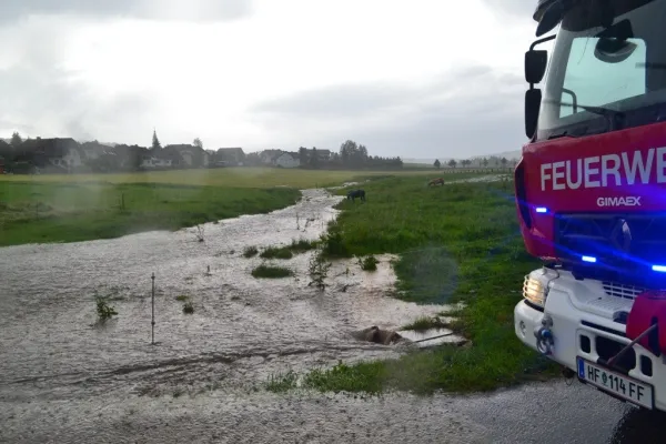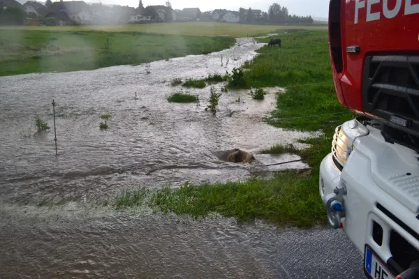 Als wir mit den Auspumparbeiten beim Einfamilienhaus fertig waren, rückte das RLFA-2000/100 zur Stocksporthalle ab, diese wurde aufgrund des Starkregens wieder überschwemmt und mittels HD-Rohr hinaus gewaschen.