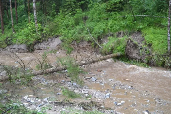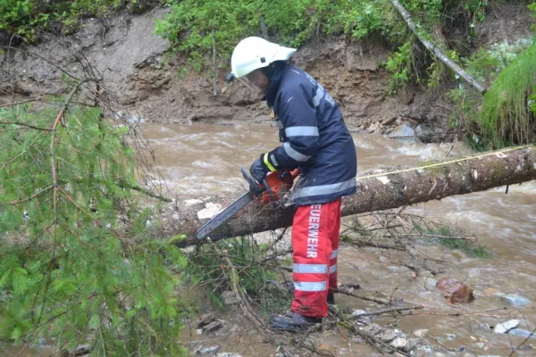 Auf der Fahrt nach Hause, wurde von der Besatzung des LFA noch ein Baum, welcher bereits aufgrund des weichen Bodens entwurzelt wurde und somit im Bachbett hängen blieb aufgearbeitet und mittels Seilwinde des RLFA-2000/100 herausgezogen.