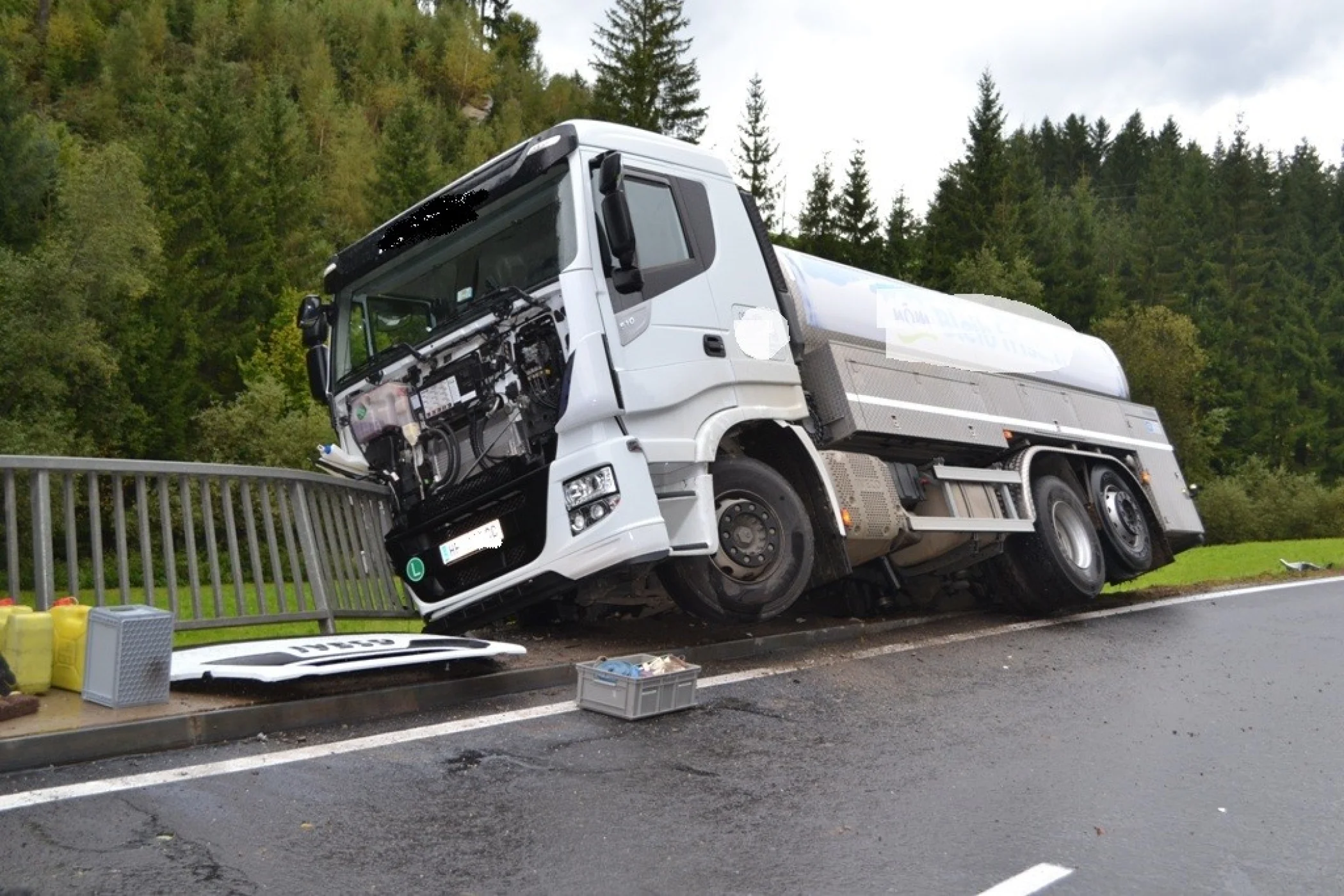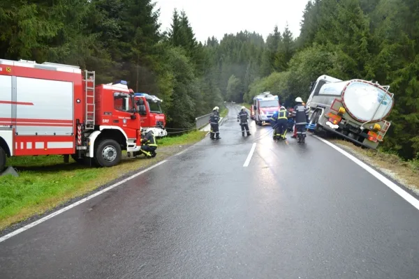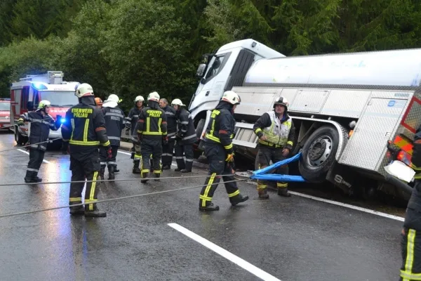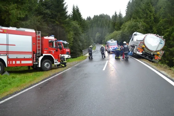 Am Dienstag dem 19.09.2017 wurden wir kurz nach 15:30 Uhr zu einer LKW Bergung auf die L 408 Höhe Sagbauer gerufen. Ein Milchtransporter war aus bisher ungeklärter Ursache auf das Bankett hinaus gekommen, blieb in einem Brückengeländer hängen und drohte eine steile Böschung hinunterzufallen.