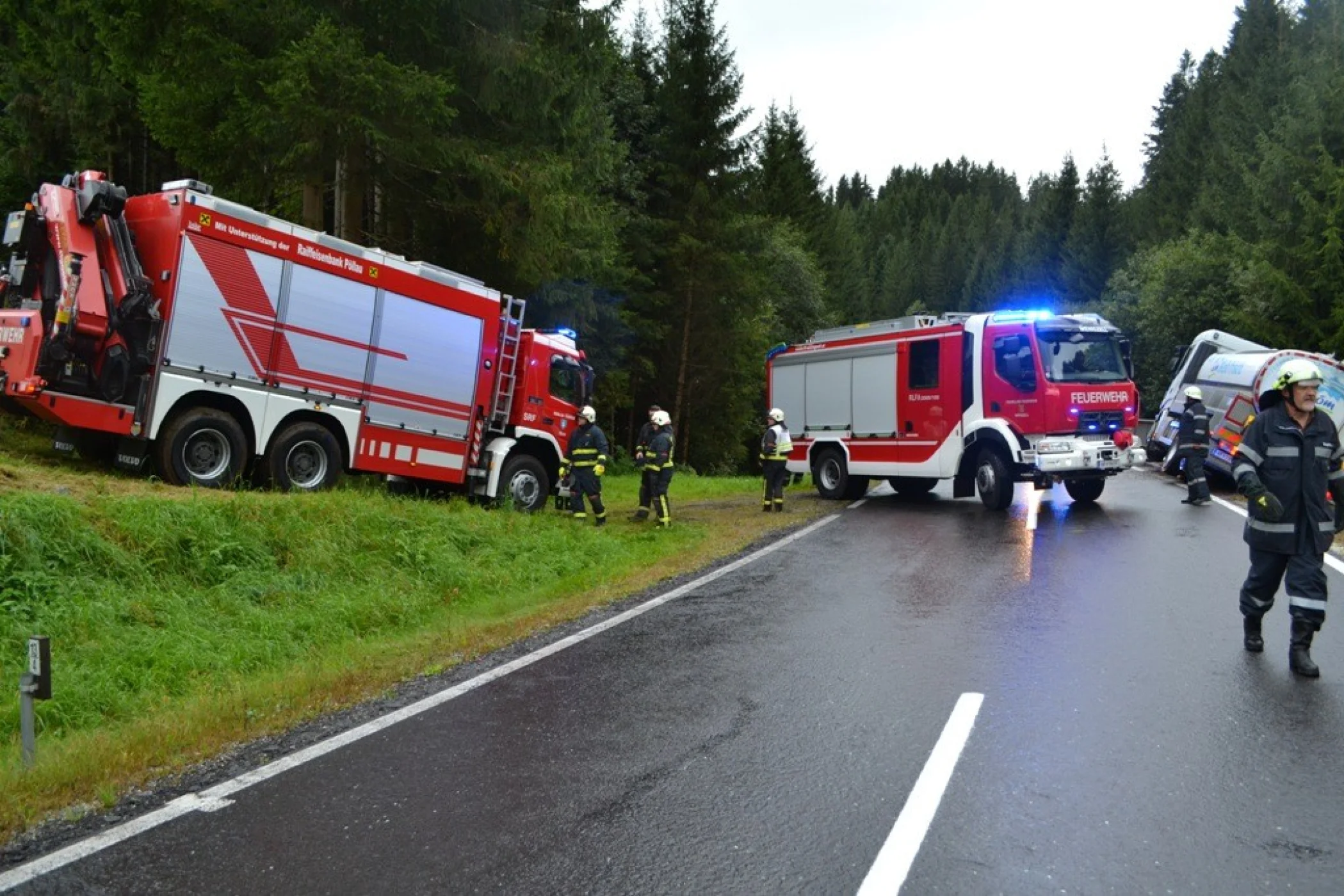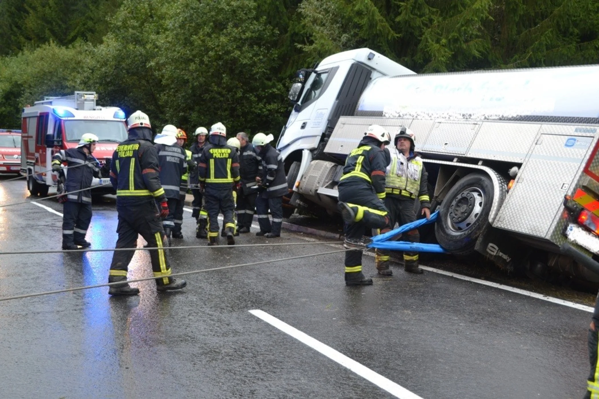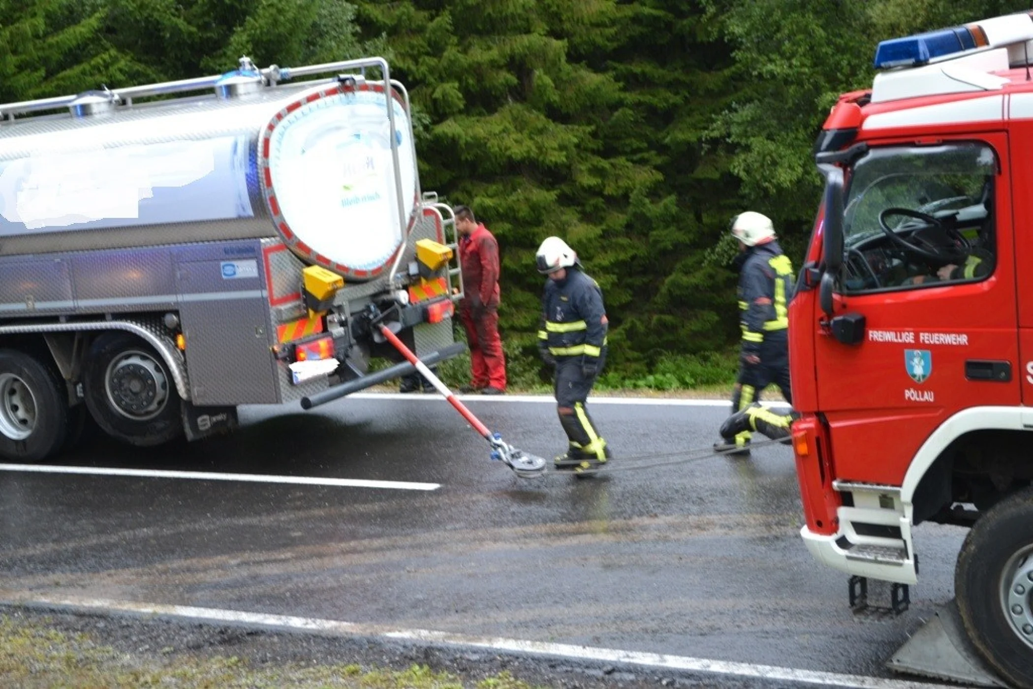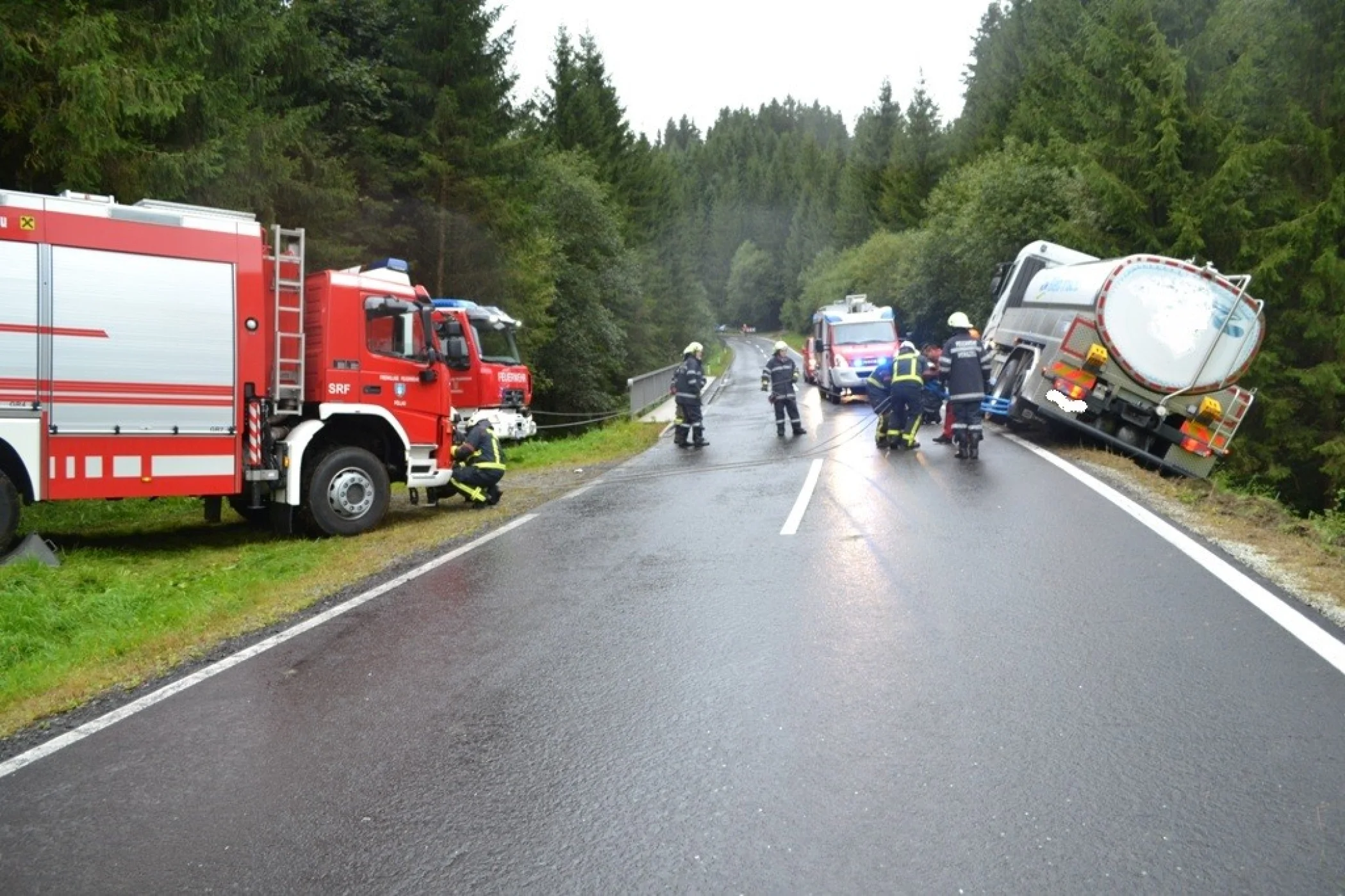 Als wir an der Einsatzstelle ankamen sperrten wir die Straße und sicherten den LKW vom Umfallen, der Kraftfahrer konnte sich bereits unverletzt selbst aus dem LKW befreien. Sofort wurde der Einsatzleitung klar, dass der LKW nicht mit eigenem Mitteln geborgen werden konnte. Aufgrund dessen, wurde über Florian Steiermark das SRF Pöllau nachalarmiert, welches wenige Minuten später am Unfallort eintrafen. Nach einer Komplettsperre der L408 im Unfallgebiet konnten wir mit unserem RLFA/2000-100 und dem SRF Pöllau, verunfallten LKW Stück für Stück auf die Straße zurückbringen. Der Milchwagen wurde an einer sicheren Stelle abgestellt und einem Abschleppunternehmen übergeben. Anschließend wurde die Straße gereinigt und die ausgelaufenen Betriebsmitteln gebunden, ehe wir um ca. 18:00 Uhr ins Rüsthaus einrücken und unsere Einsatzbereitschaft herstellen konnten
