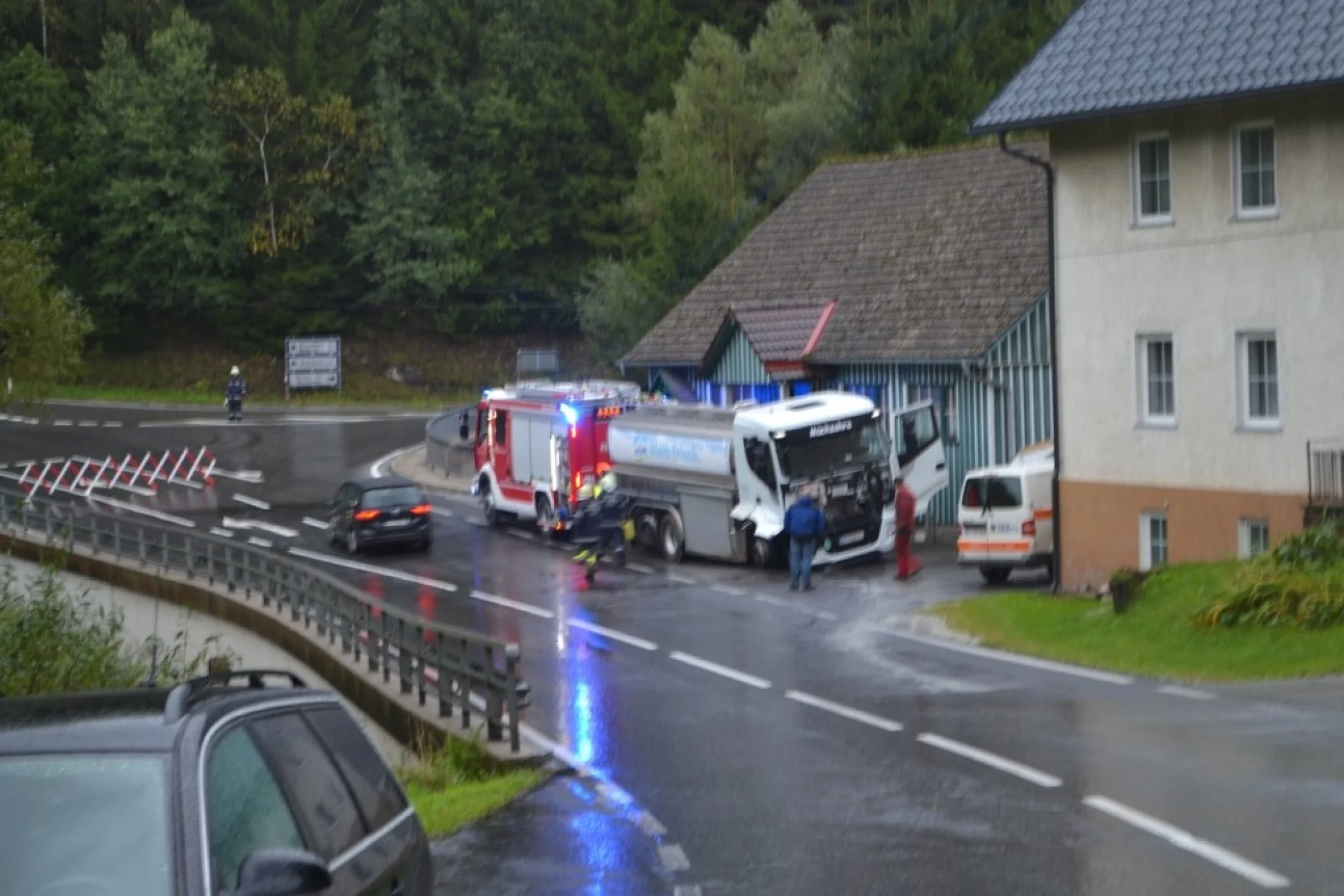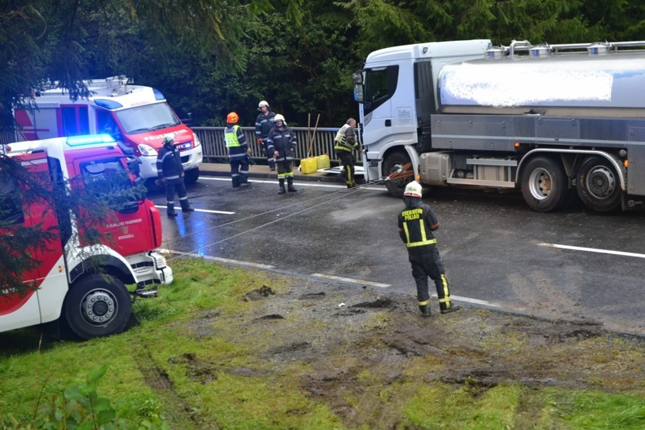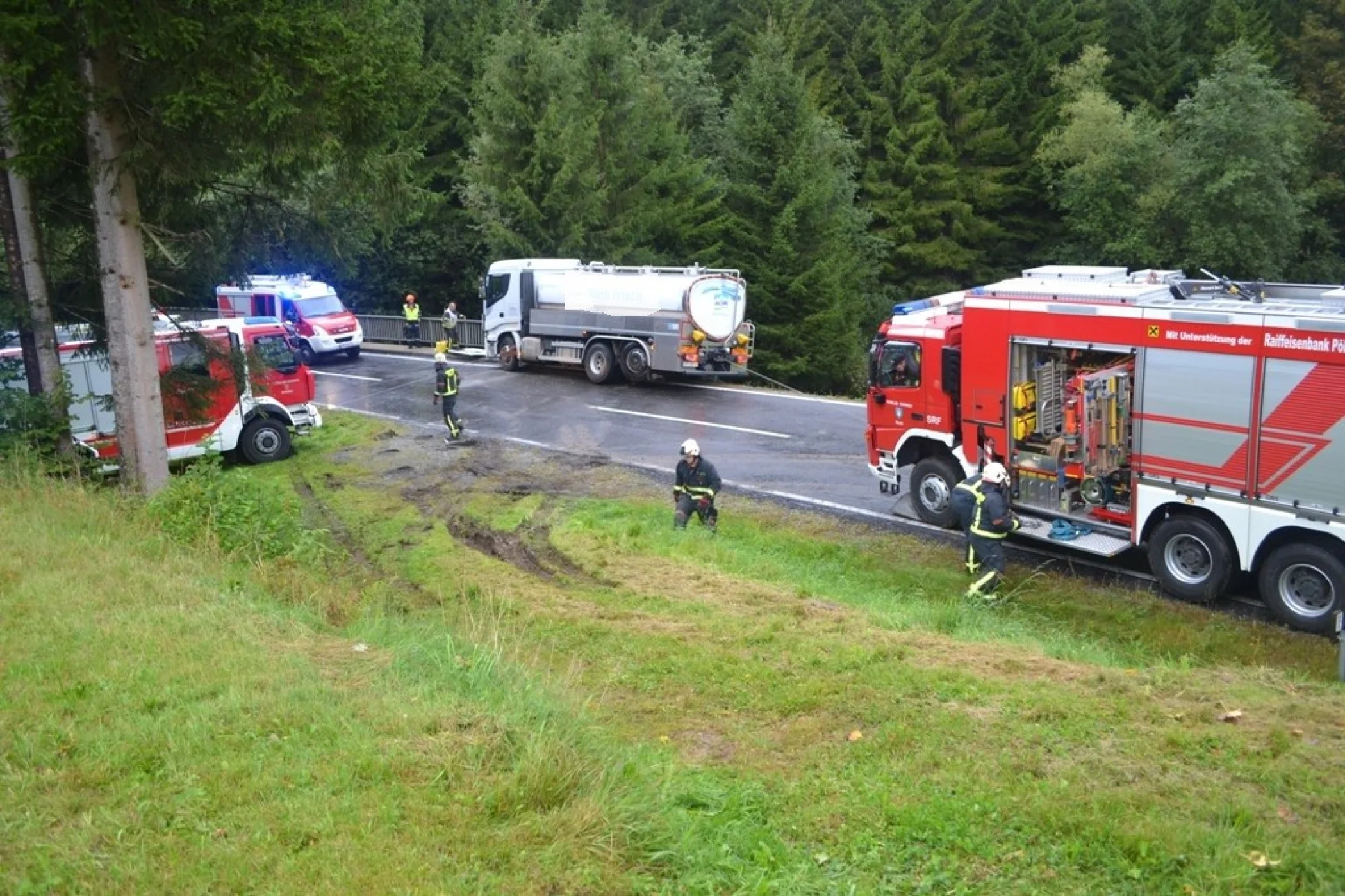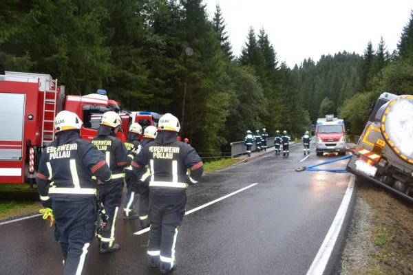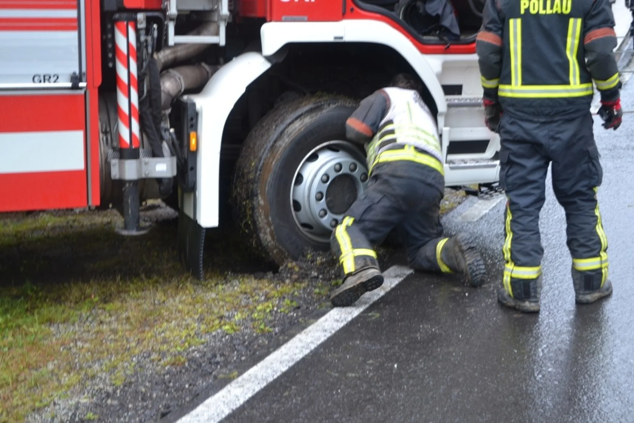 Als wir an der Einsatzstelle ankamen sperrten wir die Straße und sicherten den LKW vom Umfallen, der Kraftfahrer konnte sich bereits unverletzt selbst aus dem LKW befreien. Sofort wurde der Einsatzleitung klar, dass der LKW nicht mit eigenem Mitteln geborgen werden konnte. Aufgrund dessen, wurde über Florian Steiermark das SRF Pöllau nachalarmiert, welches wenige Minuten später am Unfallort eintrafen. Nach einer Komplettsperre der L408 im Unfallgebiet konnten wir mit unserem RLFA/2000-100 und dem SRF Pöllau, verunfallten LKW Stück für Stück auf die Straße zurückbringen. Der Milchwagen wurde an einer sicheren Stelle abgestellt und einem Abschleppunternehmen übergeben. Anschließend wurde die Straße gereinigt und die ausgelaufenen Betriebsmitteln gebunden, ehe wir um ca. 18:00 Uhr ins Rüsthaus einrücken und unsere Einsatzbereitschaft herstellen konnten