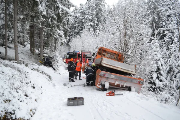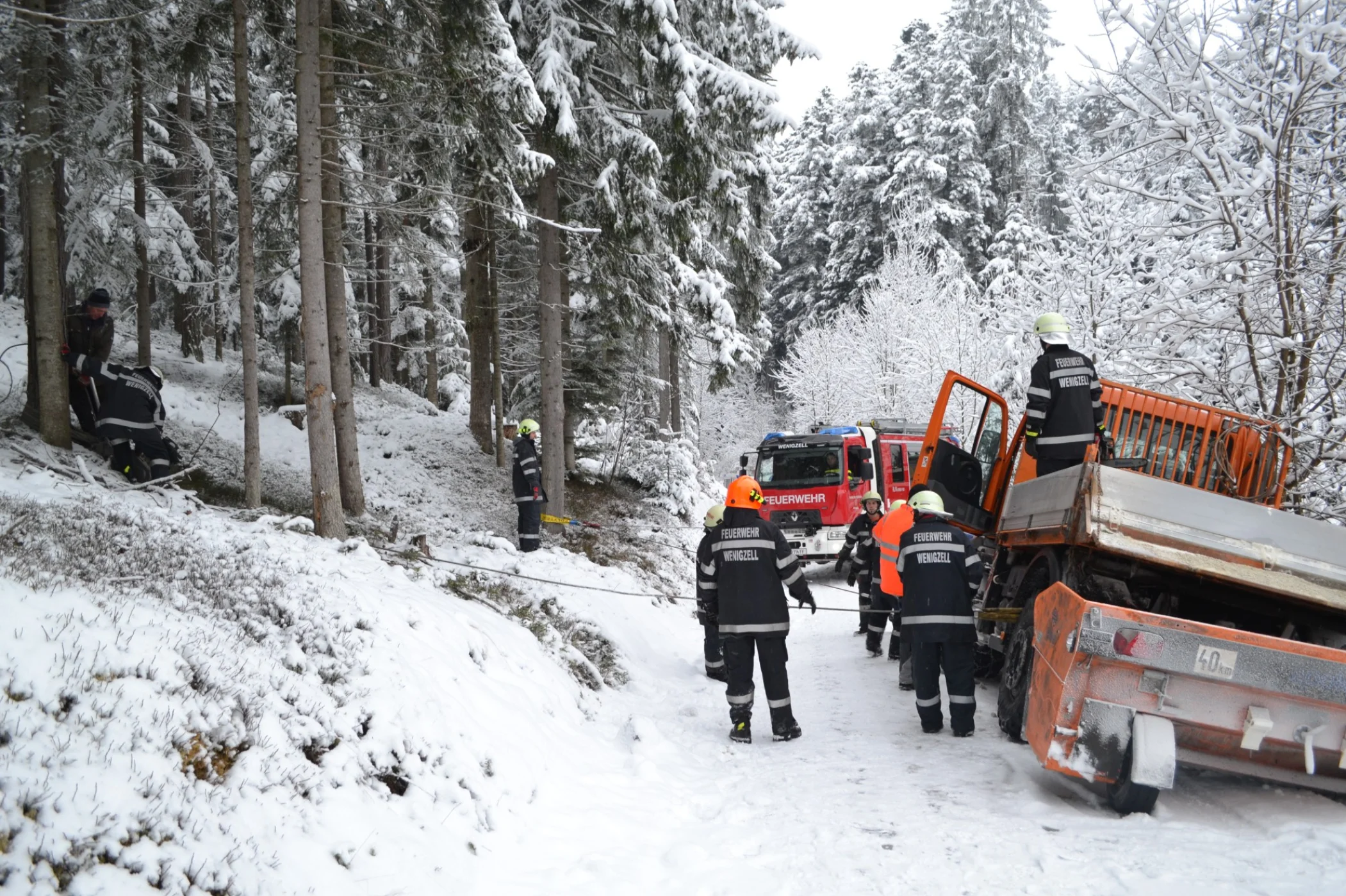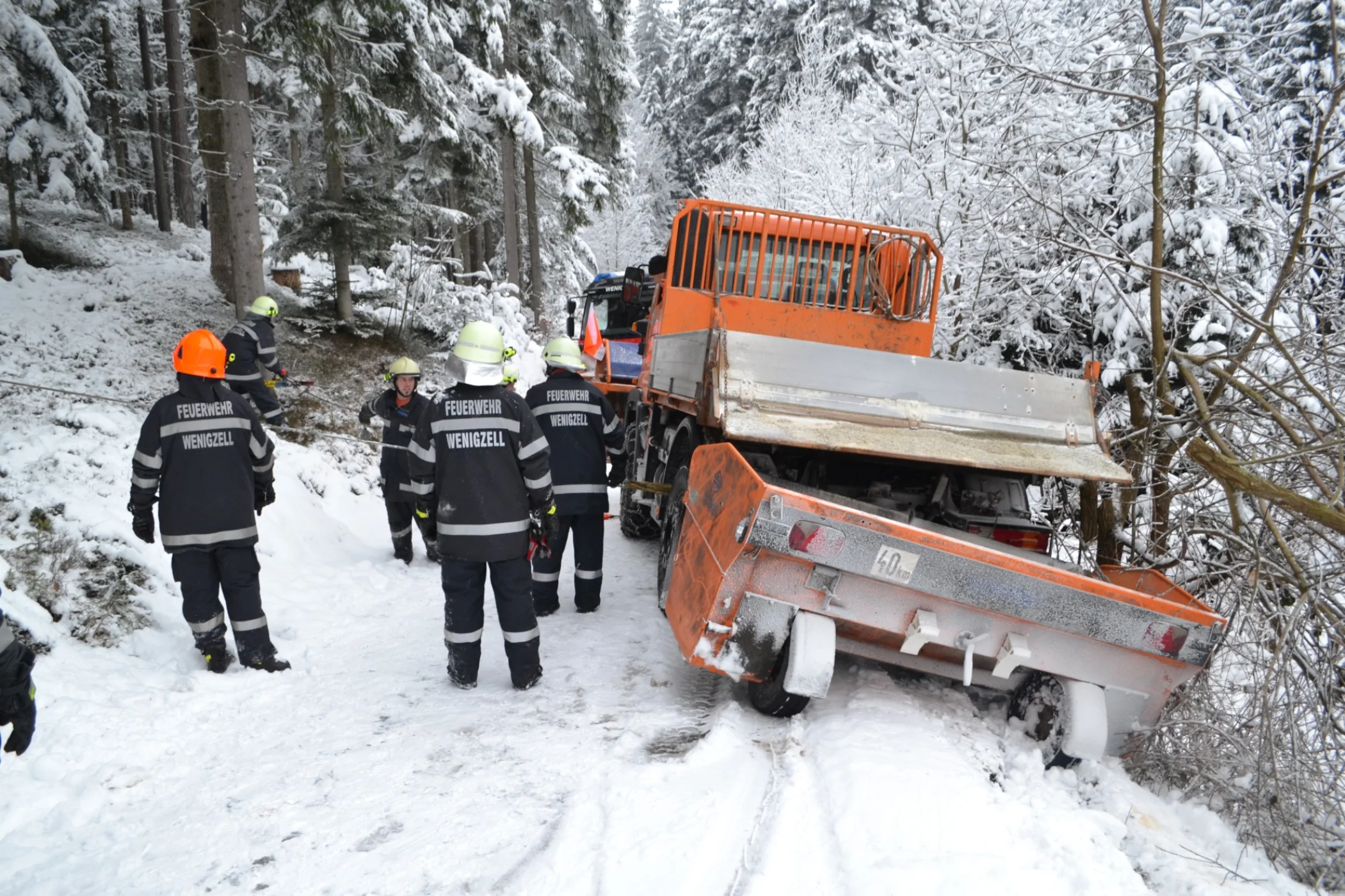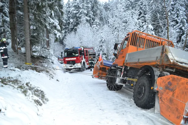 Das Fahrzeug, welches verkehrt zu einem Haus schieben musste - da es beim Haus keine Umkehrmöglichkeit gibt - kam aus bisher ungeklärter Ursache dabei von der Strasse ab. Das Räumfahrzeug wurde mittels Greifzug gesichert und anschließend mit der Seilwinde des RLFA auf die Fahrbahn zurückgezogen. Nach rund einer Stunde waren wir wieder eingerückt und einsatzbereit.