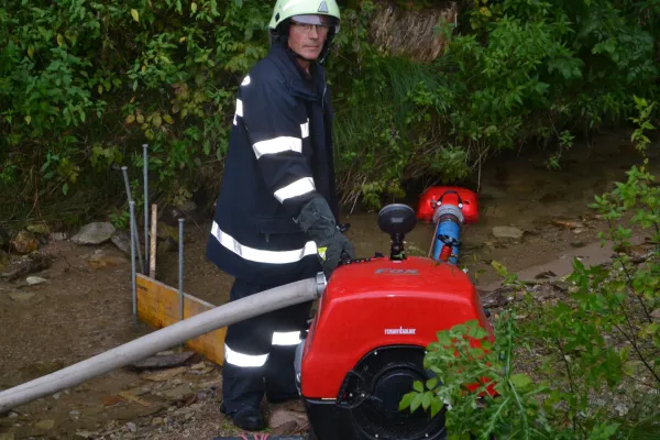 Nach der Erkundung der Lage durch den Einsatzleiter, wurde mittels RFLA-2000/100 sofort zwei Löschleitungen aufgebaut, zur gleichen Zeit ging auch der Atemschutz, welcher sich bereits während der Anfahrt komplett ausgerüstet hatte in das Objekt vor. Währenddessen wurde mit der Mannschaft des LFA´s und des KLFA Puch Haflingers eine rund 400m lange Zubringleitung vom Bruckbach aufgebaut. Nach einer Aufbauzeit von ca. 15 min. konnte bereits an die Tragkraftspritze Wassermarsch gegeben werden. Die übrige Mannschaft unterstützte das RLFA-2000/100 mit weiteren Strahlrohren bei den Löscharbeiten.