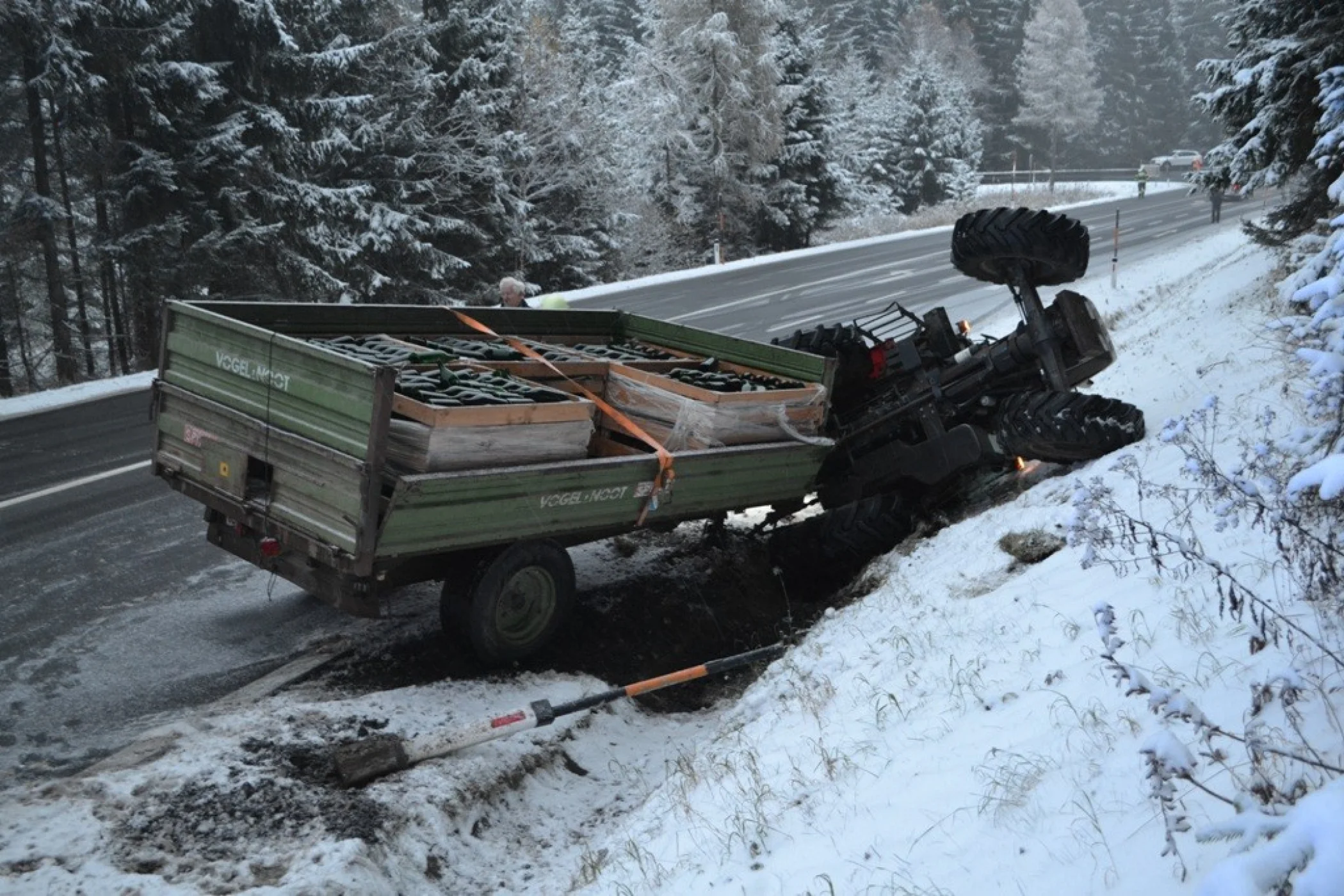 Pünktlich zum ersten Schneefall wurden wir am Montag dem 19.11.2018 gegen 15:45 Uhr zur einer Traktorbergung nahe dem ehemaligen Gasthof „Kreuzwirt“ gerufen. Ein Traktorgespann kam aus bisher ungeklärter Ursache von der Straße ab und landete im Straßengraben.