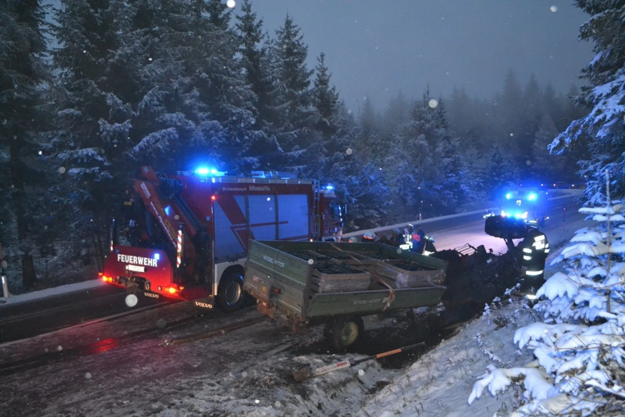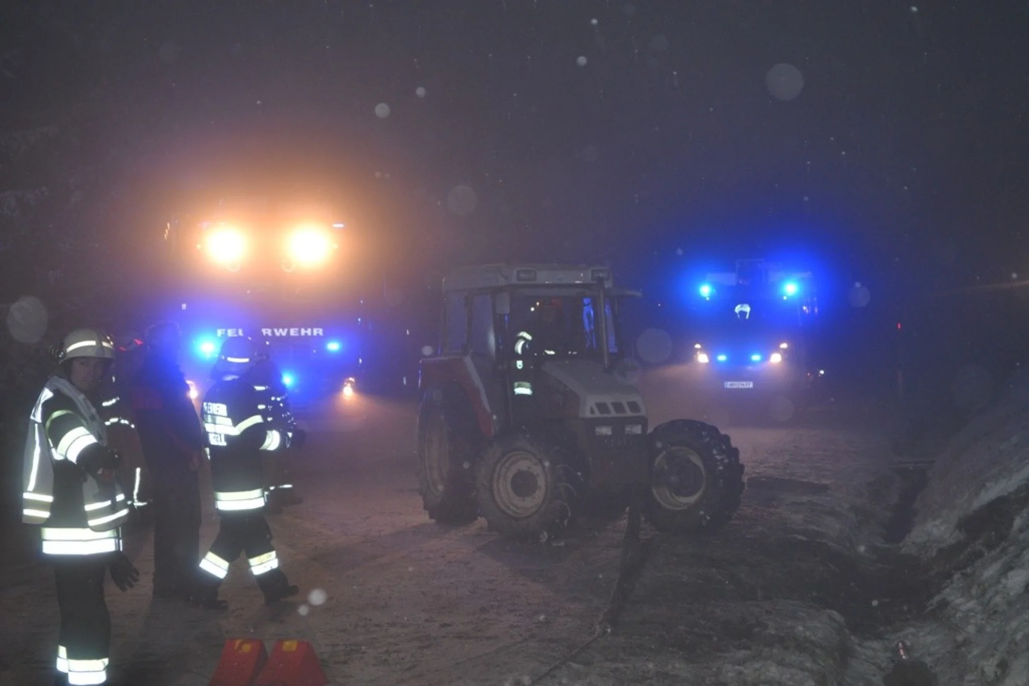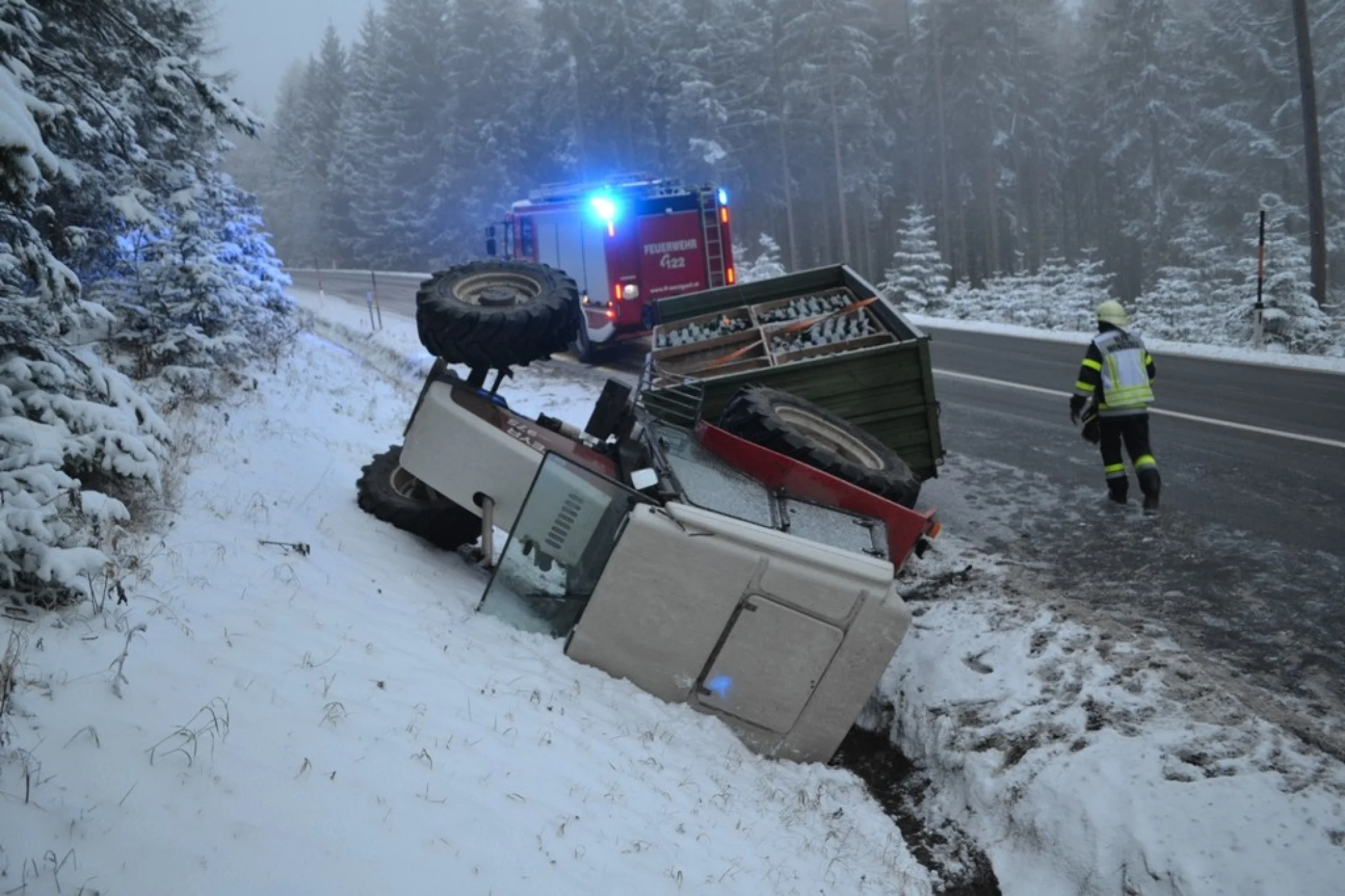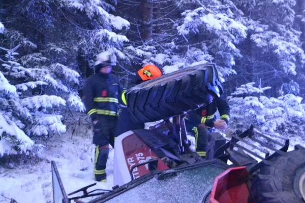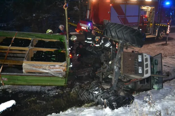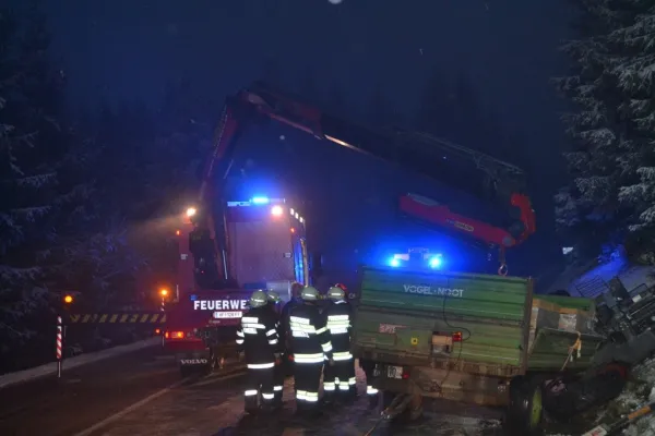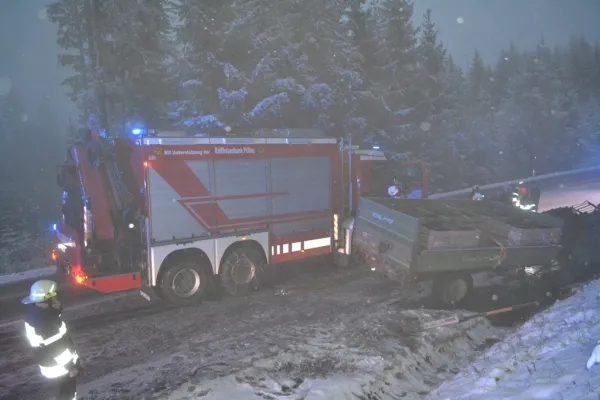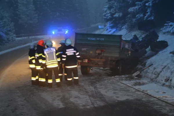 Der Traktor kam auf der Seite zu liegen, der beladene Anhänger ragte noch in die Straße zurück und war unversehrt. Als wir an der Unfallstelle ankamen wurde das Gespann mit der Seilwinde des RLFA2000/100 gesichert sowie der Verkehr geregelt, der Fahrer hatte bereits unverletzt den Traktor verlassen können und wurde von unserem Feuerwehrsanitäter versorgt, aufgrund der immer heftiger werdenden Schneefälle und der Schneefahrbahn war höchste Vorsicht am Einsatzort Priorität Nummer 1. Schließlich stellte sich heraus, dass wir die Bergung des Traktors nicht alleine durchführen konnten, somit wurde über Florian Steiermark das SRF Pöllau nachalarmiert, welches nach wenigen Minuten eintraf. Nach dem Sperren der Straße für den gesamten Verkehr wurde in Zusammenarbeit mit den Kameraden der FF Pöllau das Traktorgespann geborgen und gesichert abgestellt werden. Nach ca. 2 Stunden Einsatzdauer konnten wir ins Rüsthaus einrücken und Einsatzbereit melden.