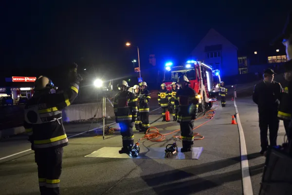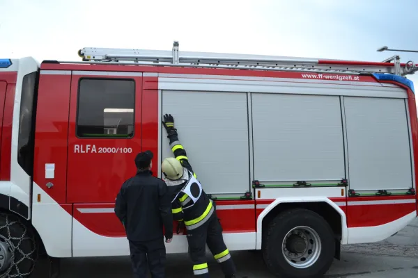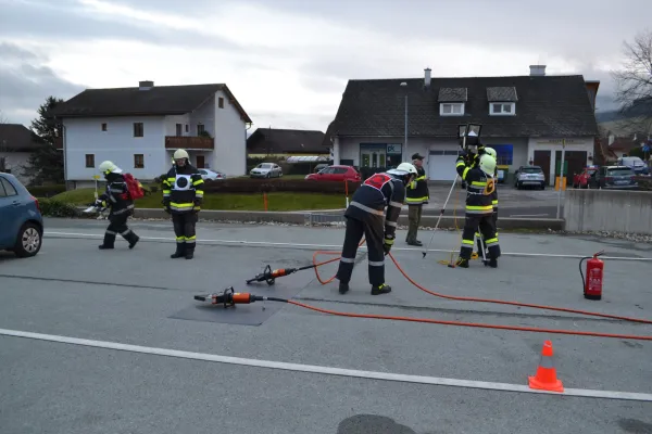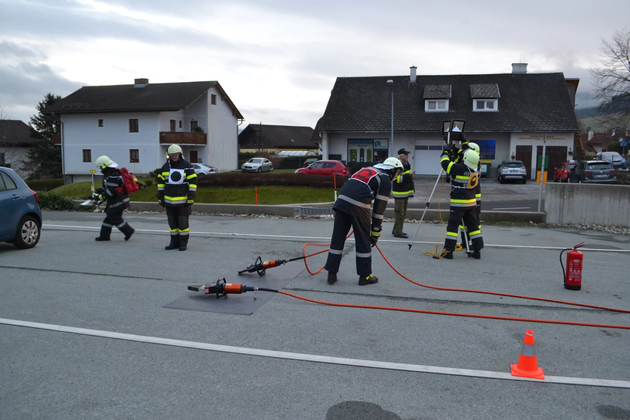 Die Prüfung gliederte sich in zwei Teile, wobei es im ersten Teil ums Wissen über die Gerätschaften des RLFA 2000/100 ging. Jeder Prüfungsteilnehmer bekam zwei Kärtchen mit jeweils einem Gerät, welches im RLFA-2000/100 untergebracht ist. Dieses musste bei geschlossenem Rolltor bis auf eine Handbreite genau dem Hauptbewerter gezeigt werden, der Gruppenkommandant musste zusätzlich mehrere Frage zum technischen Einsatz beantworten. Nachdem dieser Part bei allen 3 Gruppen fehlerfrei abgeschlossen werden konnte, startete der zweite Teil. In diesem ging es darum einen Verkehrsunfall mit eingeklemmter Person bei Nacht zu bewältigen, folgende Tätigkeiten mussten durchgeführt werden: