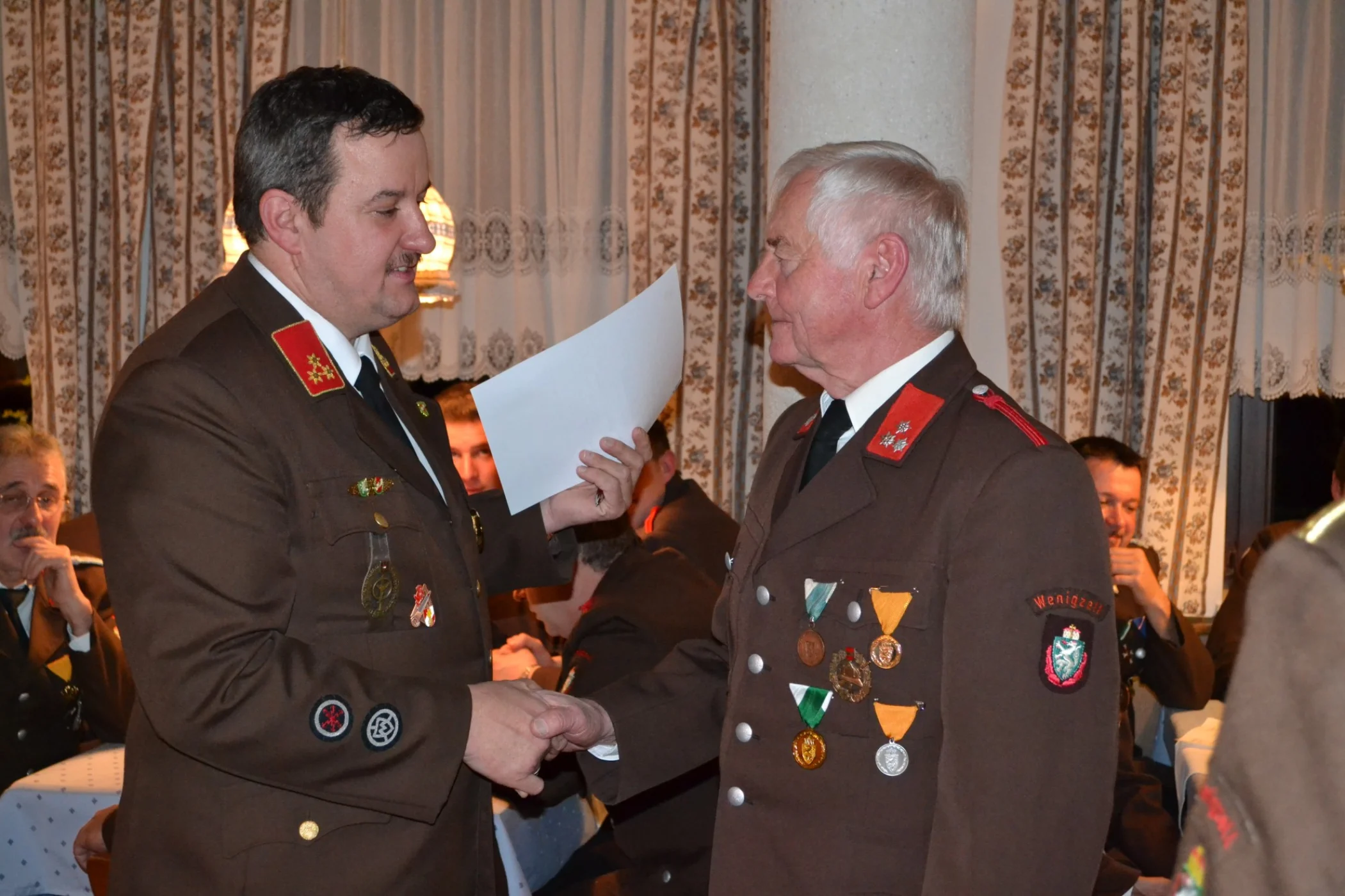 HFM Vinzenz Pötz wurde vom Hauptfeuerwehrmann zum Löschmeister befördert – anschließend stimmte die Wehrversammlung einstimmig zu Vinzenz Pötz zum Ehrenlöschmeister der Feuerwehr Wenigzell zu ernennen