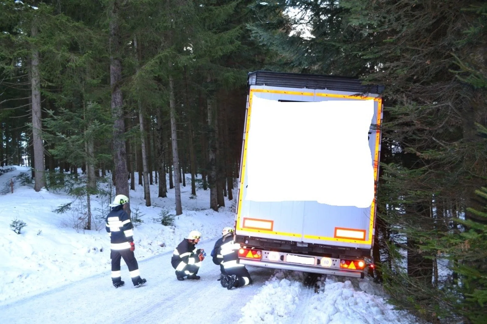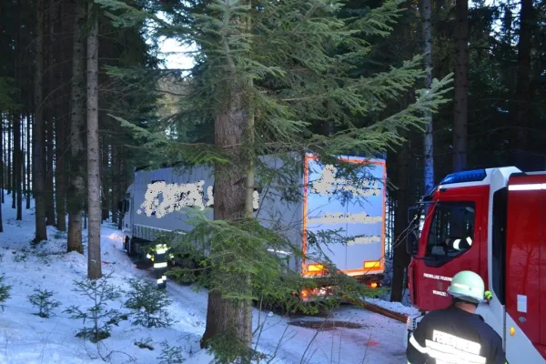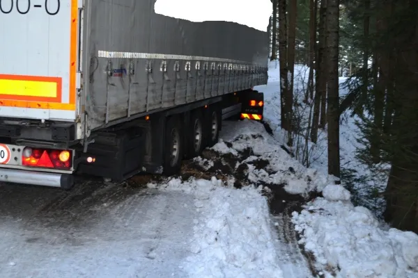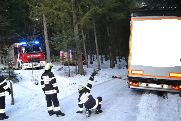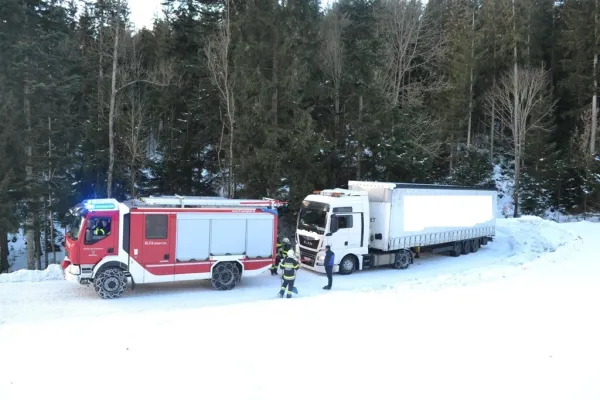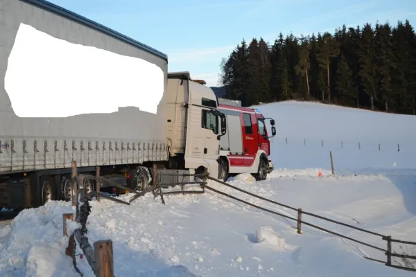 Tag 3 - insgesamt Einsatz Nummer 5. Um 08:00 des 17. Jänners 2019 wurden wir zum Einsatz Nummer 2 des genannten Tages gerufen. Ein vollbeladener Sattelzug kam trotz Schneeketten bei winterlichen Fahrverhältnisse mit dem Aufleger von der Straße ab und konnte sich nicht mehr selber aus dieser Lage befreien.