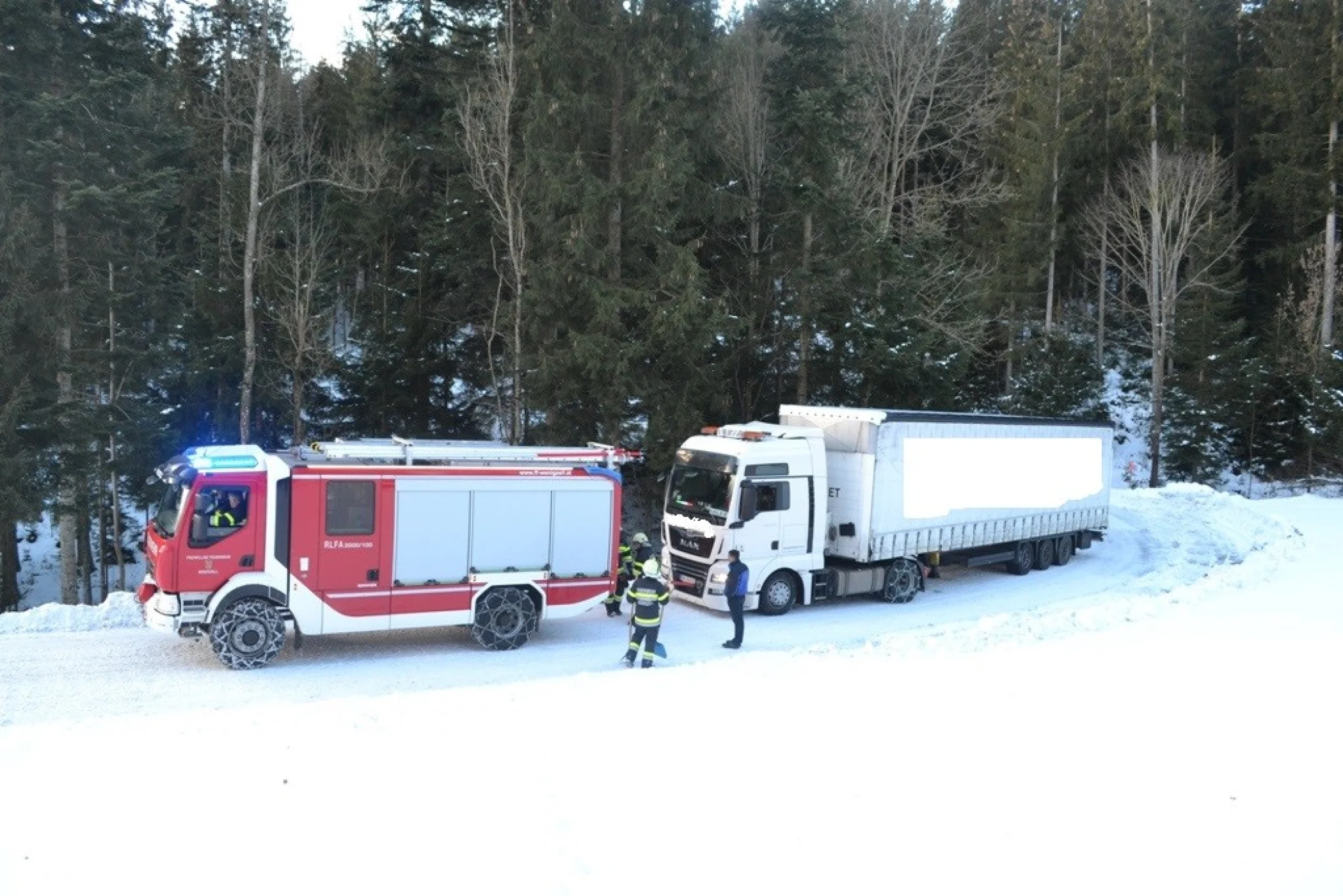 Sofort wurde die Straße für den kompletten Verkehr gesperrt und der Aufleger mit der Seilwinde des RLFA-2000/100 gesichert. Währenddessen begann die Mannschaft des LFA mittels Greifzug die Zugmaschine vor dem Abrutschen zu stabilisieren. Nach kurzer Zeit konnte der Sattelzug wieder komplett auf die Straße zurückgezogen werden. Im Anschluss wurde er mit der Abschleppstange und RLFA-2000/100 die Anhöhung hinaufgschleppt wo der Sattelzug wieder mit der Hinterachse der Zugmaschine abrutschte und hängen blieb. Wieder wurde er mit der Seilwinde geborgen, anschließend konnte er seine Fahrt fortsetzten und nach ca. 2h Stunden im Einsatz, konnten wir unsere Einsatzbereitschaft wieder herstellen