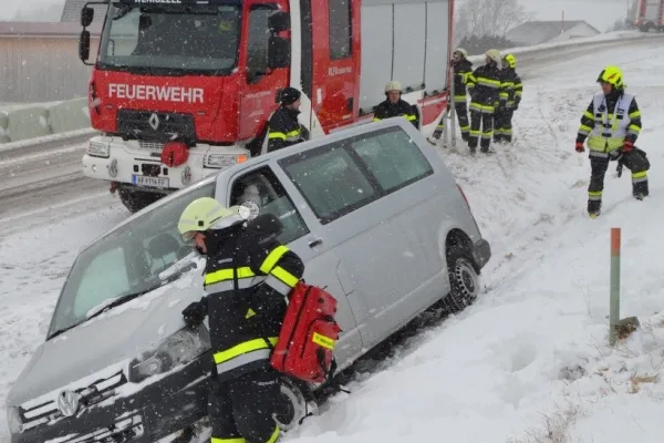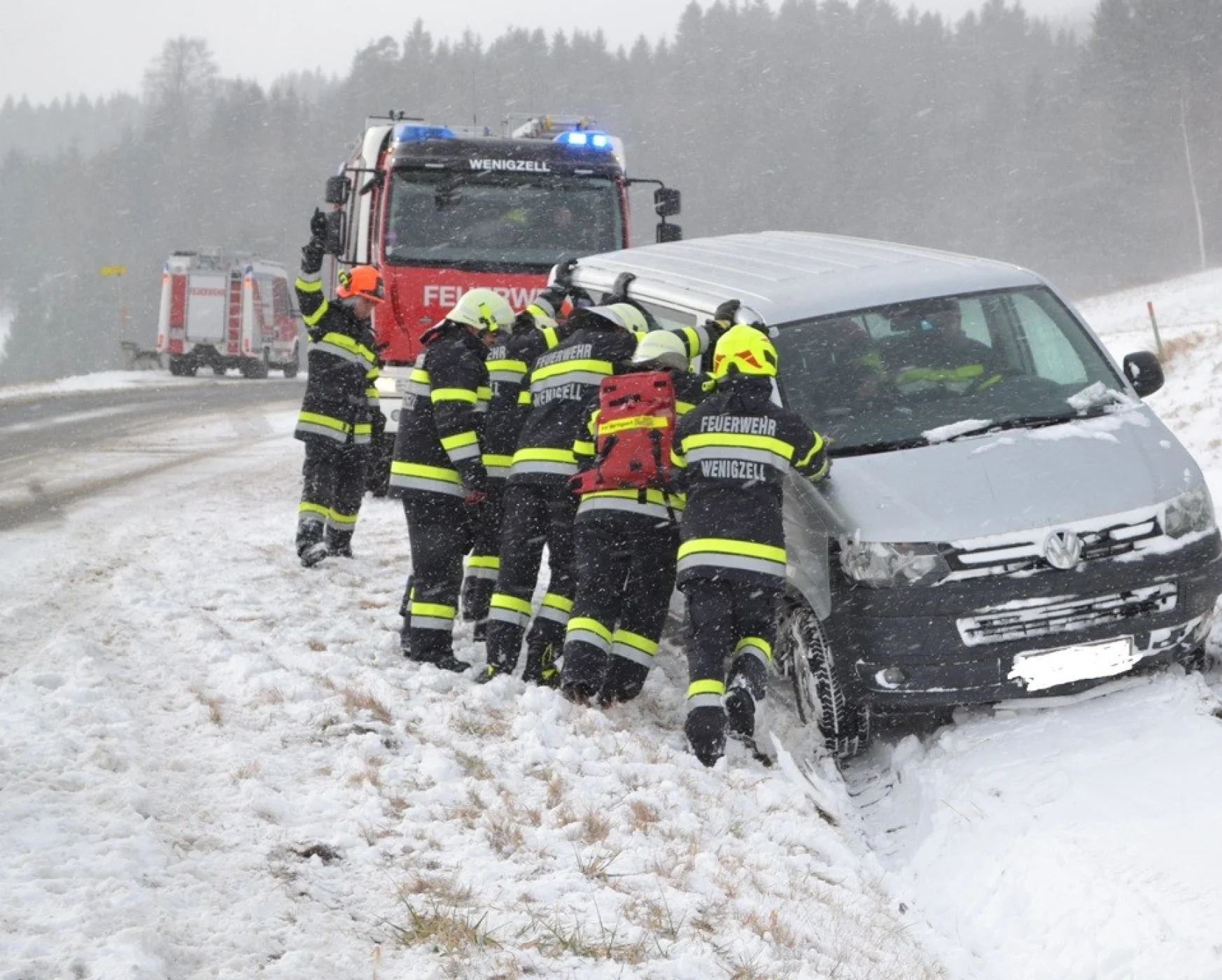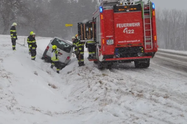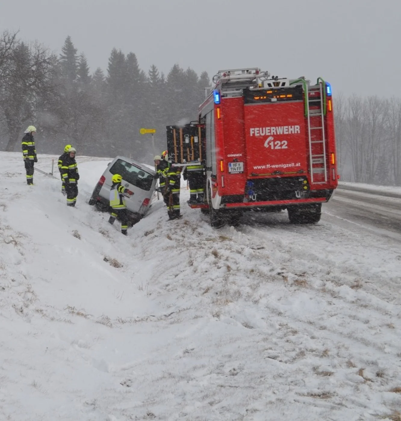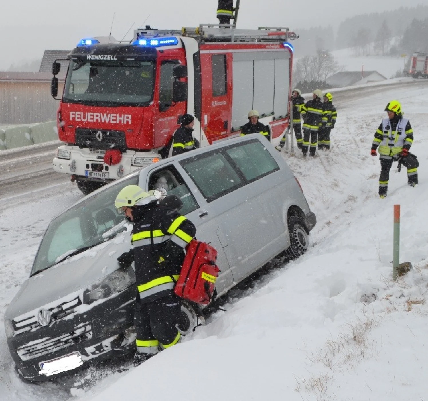 Als wir an der Unfallstelle ankamen, waren noch drei Personen im Fahrzeug, welche aufgrund der Böschung das Auto nicht alleine verlassen konnten. Mittels Steckleiter wurde ein gesicherter Weg auf der rutschigen Böschung aufgebaut und somit konnten die Insassen darunter 2 Kinder und ein Baby unverletzt aus dem Fahrzeug gerettet und in ein Nahe gelegenes Bauernhaus ins warme gebracht werden. Im Anschluss wurde der Kleinbus mittels Seilwinde des RLFA2000/100 aus dem Graben gezogen und sicher abgestellt. Nach rund einer 3/4 Stunde konnten wir wieder ins Rüsthaus einrücken und unsere Einsatzbereitschaft herstellen.
