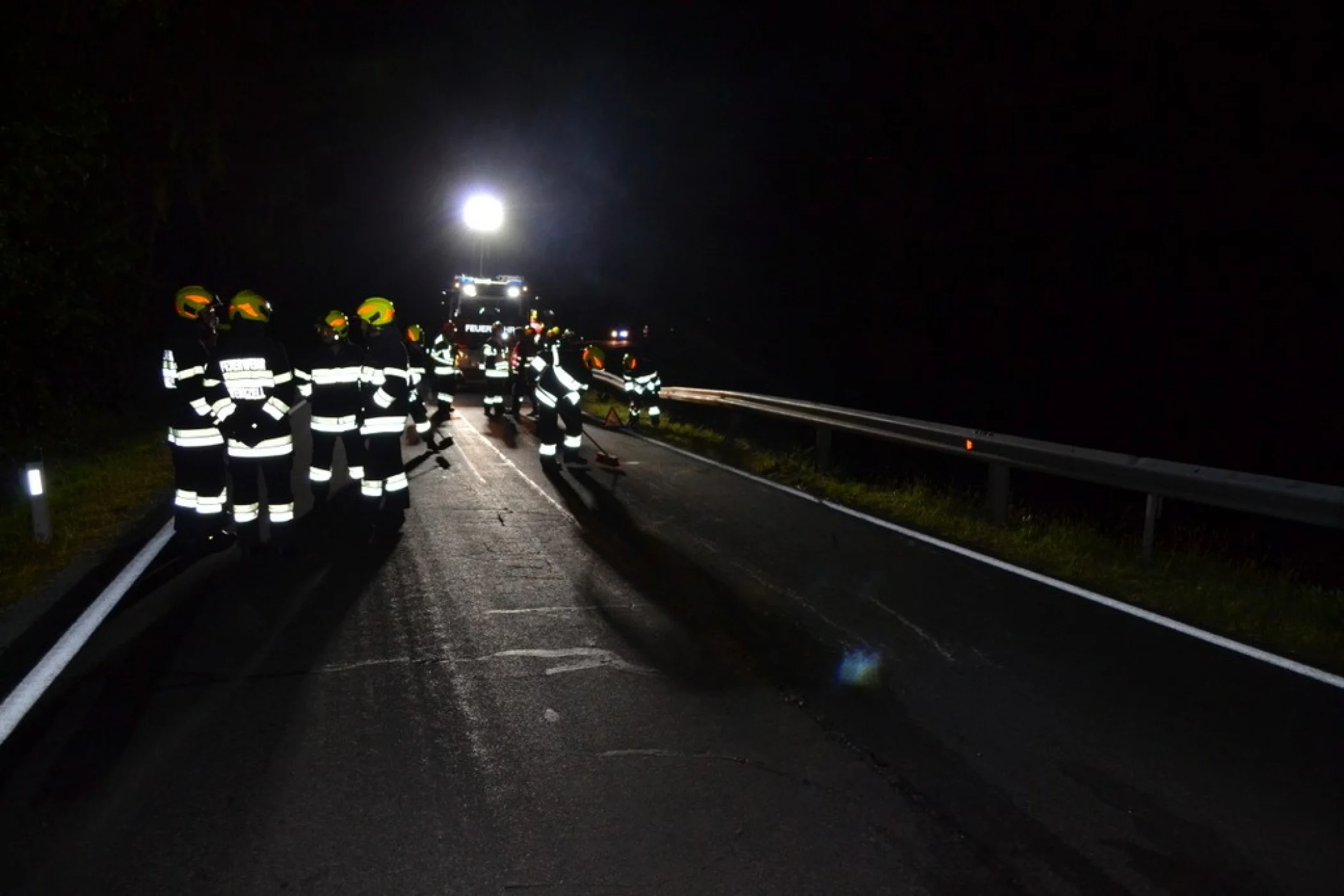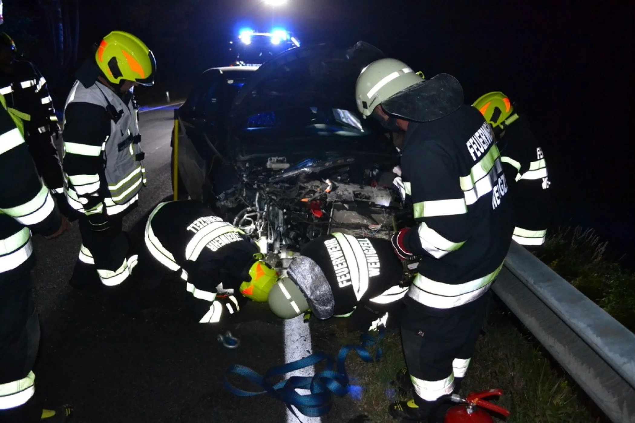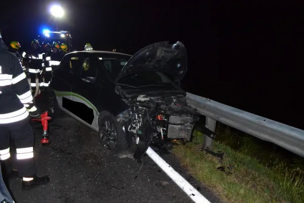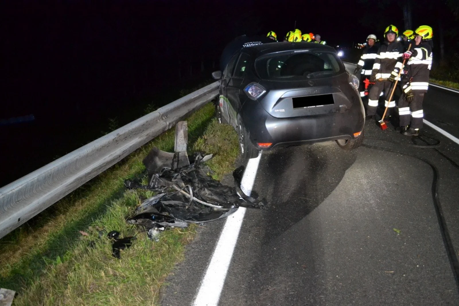 Als wir am Unfallort ankamen, stellte sich heraus, dass aus bisher ungeklärter Ursache, ein PKW gegen die Leitplanke gefahren ist. Das stark beschädigte Elektrofahrzeug konnte seine Fahrt nicht mehr fortsetzen. Sofort sicherten wir die Unfallstelle ab und bauten den Brandschutz auf. Der leicht verletzte Autofahrer wurde von unseren Sanitätern versorgt, musste jedoch nicht ins Krankenhaus gebracht werden. Sofort machten wir das Fahrzeug stromlos indem wir den Not-Stecker gezogen haben. Nachdem das beschädigte KFZ abtransportiert war, reinigten wir die Unfallstelle. Im Anschluss wurde noch die Leitplanke abgesichert, danach rückten wir wieder ins Rüsthaus ein. Um 23:45 Uhr meldeten wir uns zurück und einsatzbereit.
