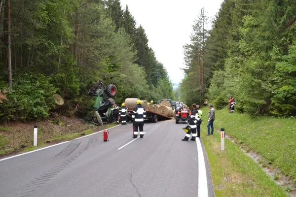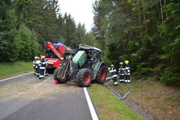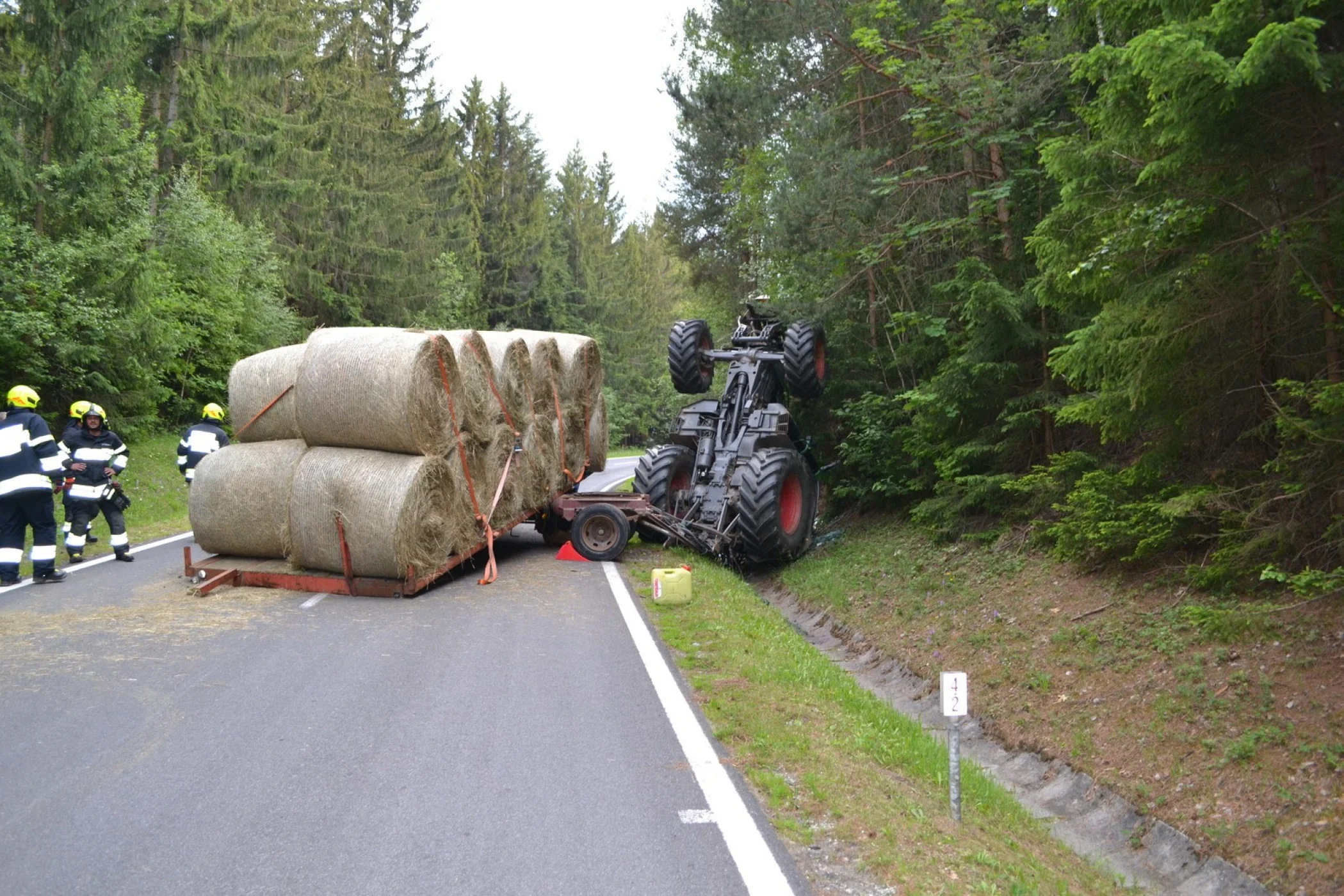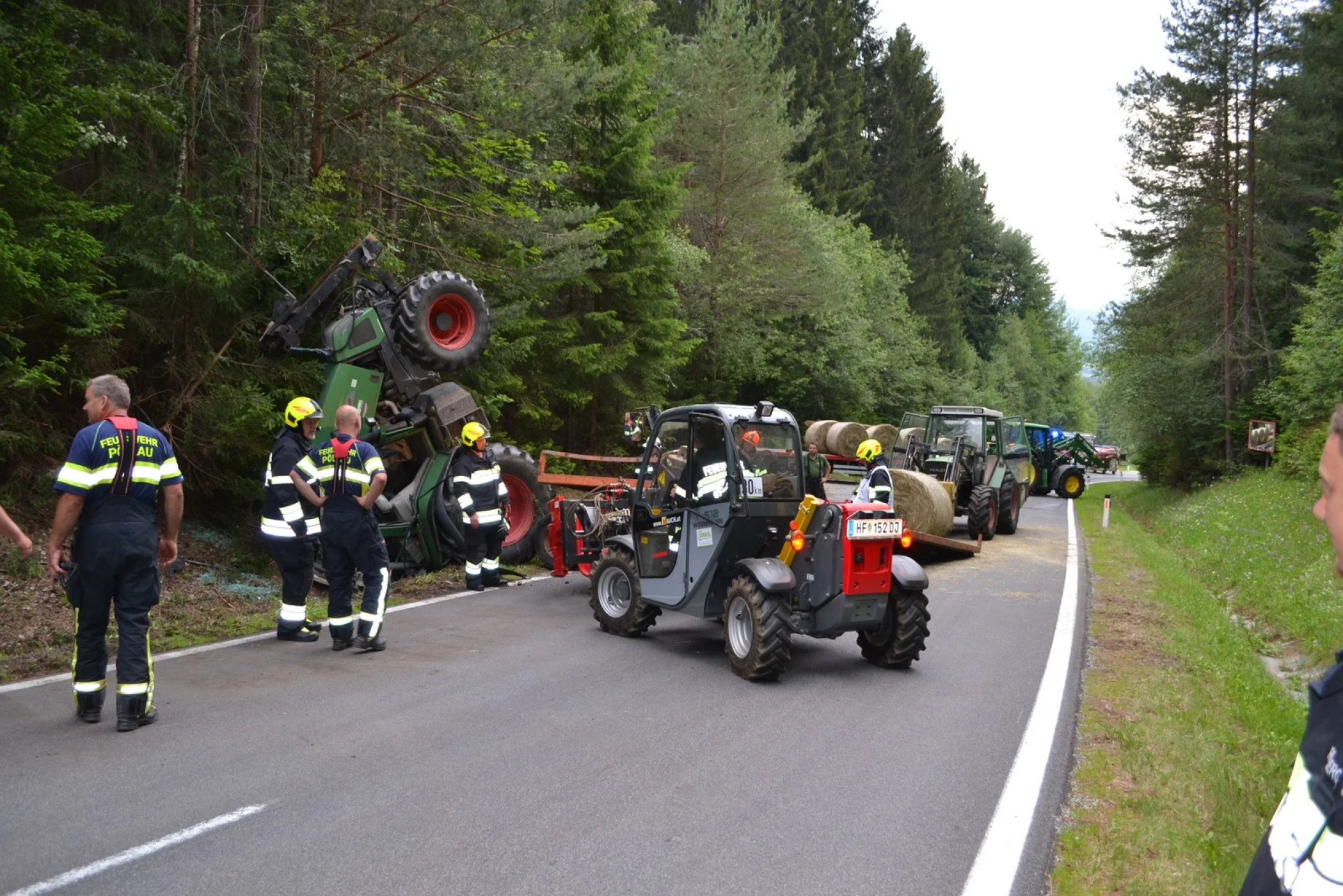 Am Einsatzort angekommen, bot sich uns folgendes Bild: Aus bisher ungeklärter Ursache kam ein Traktorgespann auf der L-415 von der Straße ab und überschlug sich einmal. Die leicht verletzte Person konnte sich selbst aus dem Fahrzeug befreien und wurde bis zum Eintreffen der Rettung von unseren Feuerwehrsanitätern betreut. Unverzüglich bauten wir einen dreifachen Brandschutz auf und errichteten eine örtliche Umleitung für den Verkehr. Zeitgleich ließen wir die FF-Pöllau mit dem SRFA nachalarmieren, welche kurze Zeit später am Einsatzort eintraf. Währenddessen wurde der Ballenwagen von uns entladen und von der Unfallstelle entfernt, auch wurden auslaufende Betriebsstoffe von uns gebunden. Mithilfe des Krans konnte der verunfallte Traktor wieder aufgestellt werden und für den Abtransport vorbereitet werden. Nachdem alle Unfallfahrzeuge abtransportiert wurden und die Einsatzstelle gereinigt war, konnten wir uns nach ca. 2 Stunden wieder zurück und einsatzbereit melden.