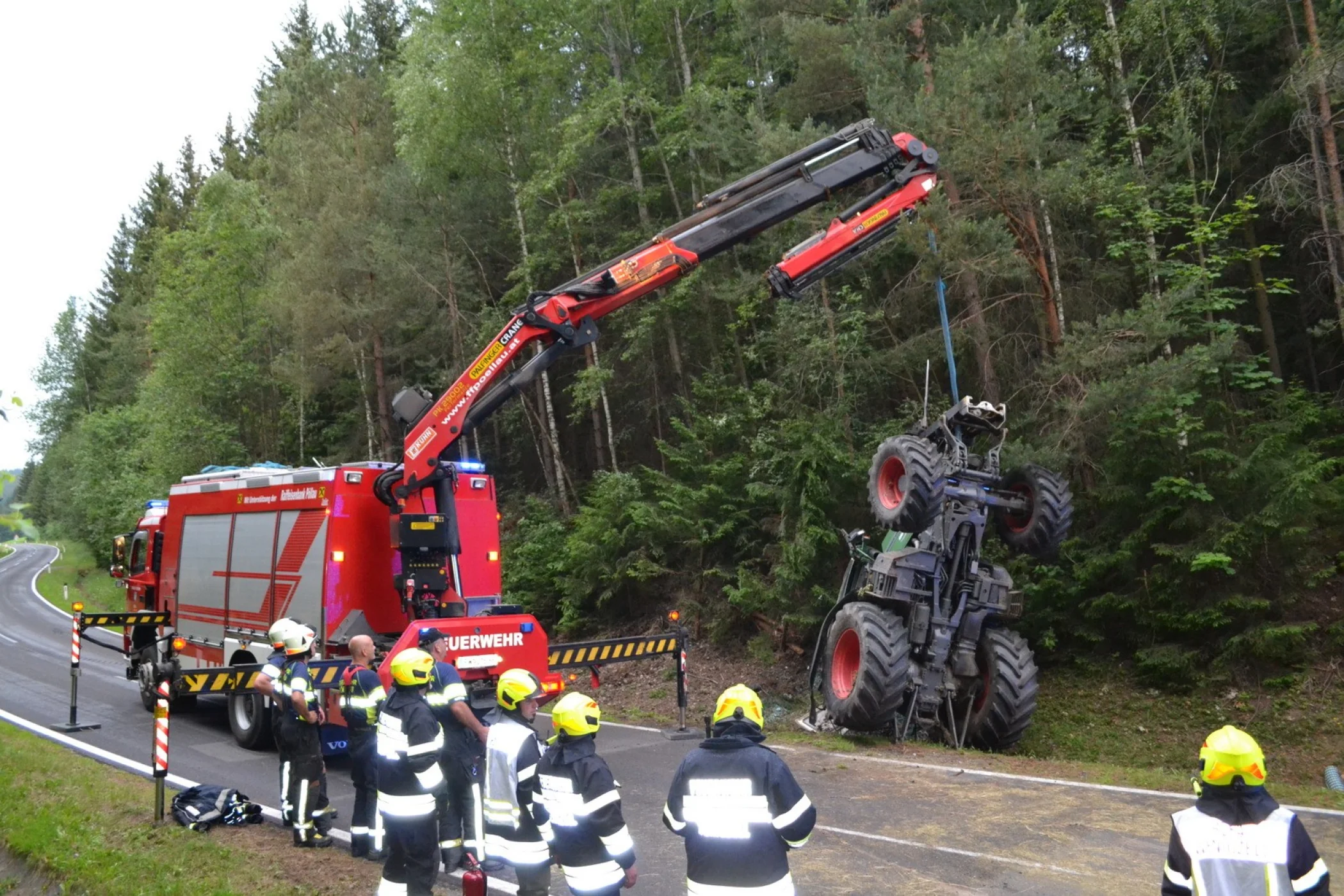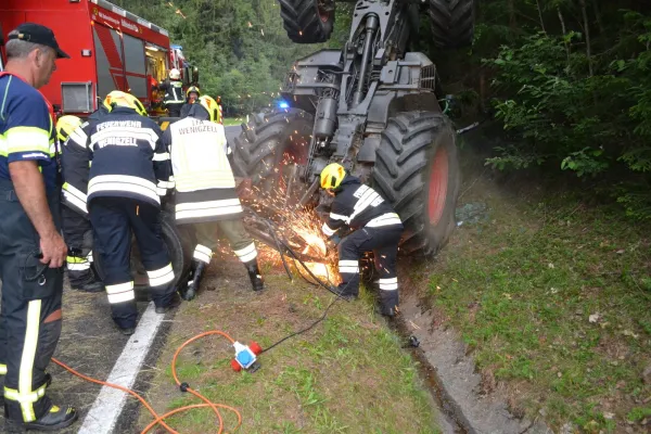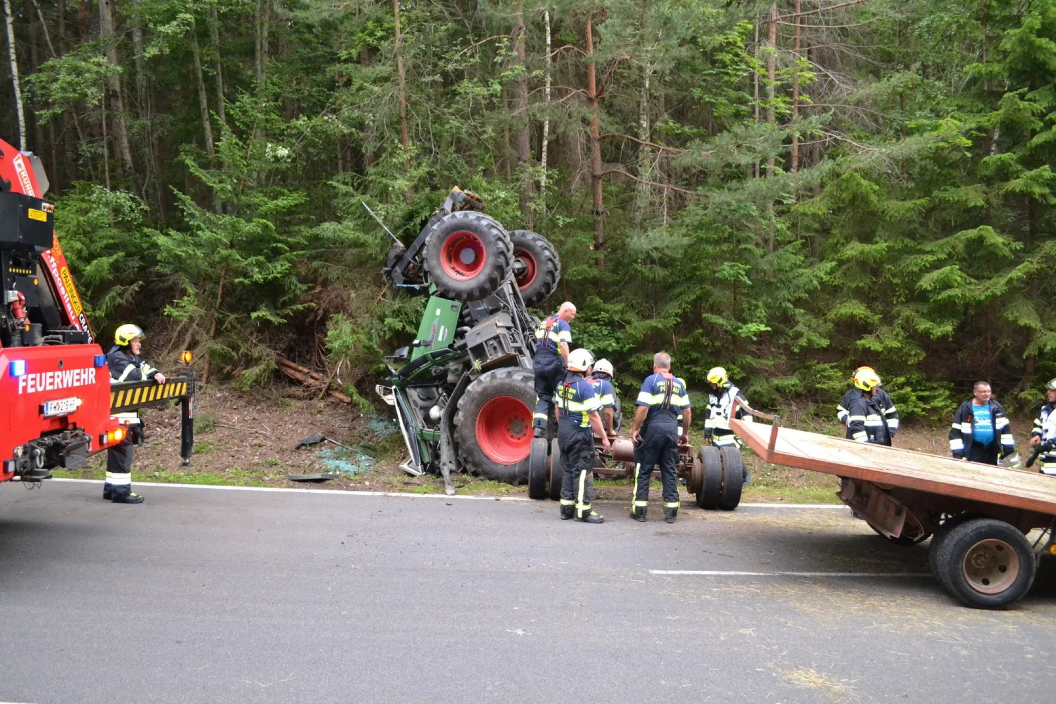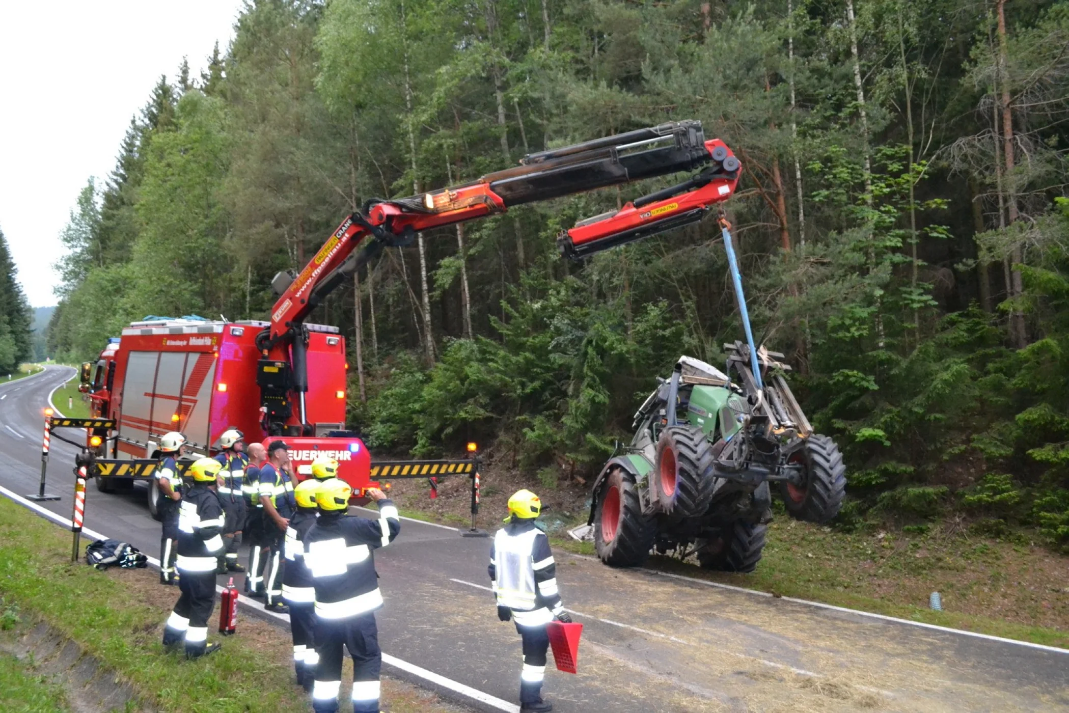 Am Einsatzort angekommen, bot sich uns folgendes Bild: Aus bisher ungeklärter Ursache kam ein Traktorgespann auf der L-415 von der Straße ab und überschlug sich einmal. Die leicht verletzte Person konnte sich selbst aus dem Fahrzeug befreien und wurde bis zum Eintreffen der Rettung von unseren Feuerwehrsanitätern betreut. Unverzüglich bauten wir einen dreifachen Brandschutz auf und errichteten eine örtliche Umleitung für den Verkehr. Zeitgleich ließen wir die FF-Pöllau mit dem SRFA nachalarmieren, welche kurze Zeit später am Einsatzort eintraf. Währenddessen wurde der Ballenwagen von uns entladen und von der Unfallstelle entfernt, auch wurden auslaufende Betriebsstoffe von uns gebunden. Mithilfe des Krans konnte der verunfallte Traktor wieder aufgestellt werden und für den Abtransport vorbereitet werden. Nachdem alle Unfallfahrzeuge abtransportiert wurden und die Einsatzstelle gereinigt war, konnten wir uns nach ca. 2 Stunden wieder zurück und einsatzbereit melden.