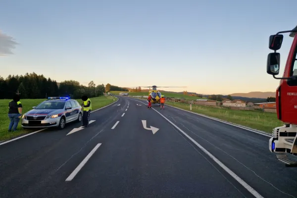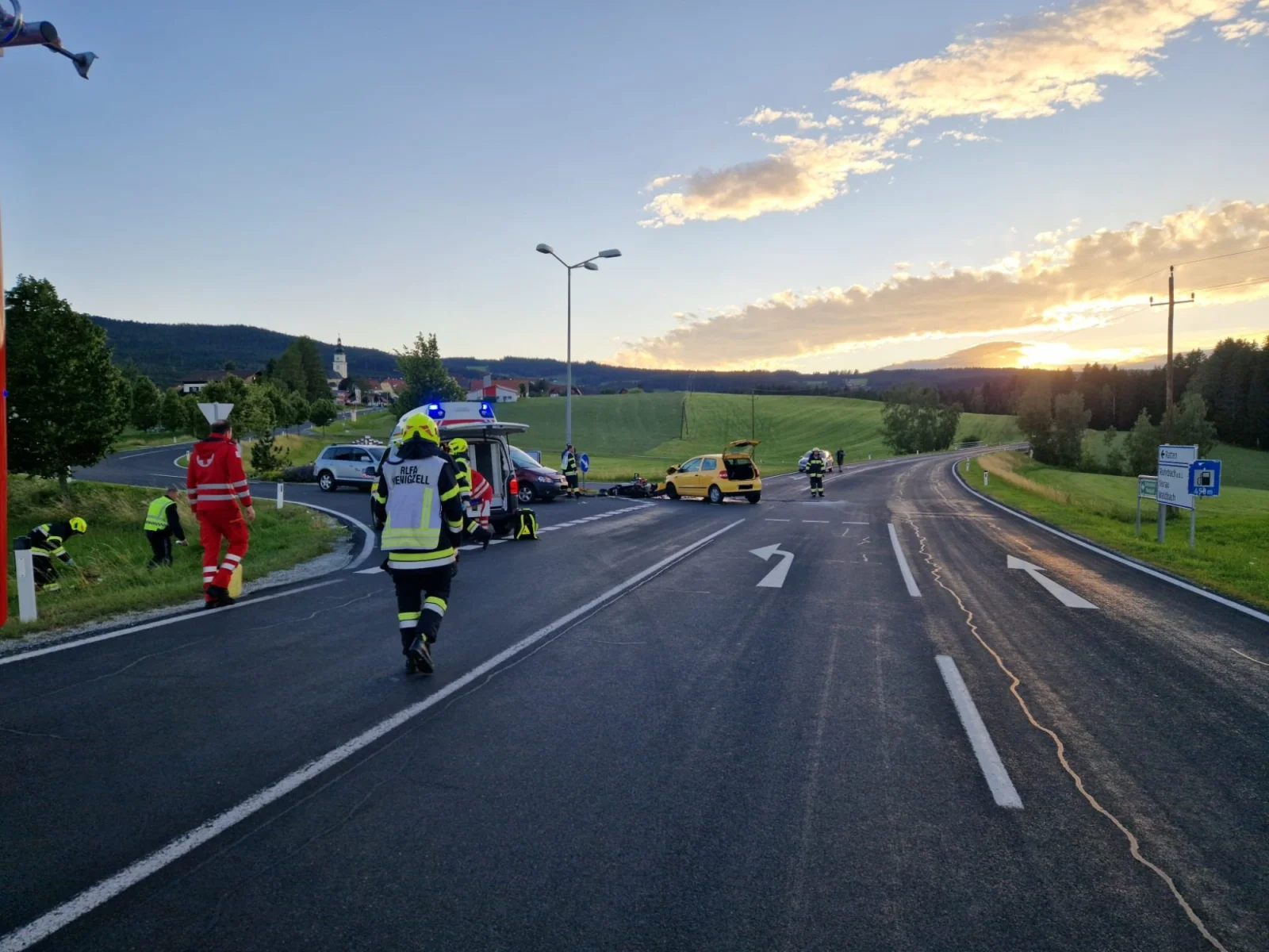 Nachdem wir an der ca. 500m entfernten Einsatzstelle angekommen sind, bot sich uns folgendes Bild: Im Kreuzungsbereich kollidierten aus bisher ungeklärter Ursache ein PKW und ein Motorradfahrer. Dabei stürzte der Motorradfahrer und kam verletzt im Straßengraben zu liegen. Wir sicherten sofort die Unfallstelle ab und bauten den Brandschutz auf. Währenddessen halfen unsere Feuerwehrsanitäter bei der Versorgung der verletzten Person dem Roten Kreuz. Weiters sperrten wir die Straße und bereiteten alles für den Notarzthubschrauber vor, nachdem die verunfallte Person in das Krankenhaus geflogen war, räumten wir die Unfallstelle auf. Danach gaben wir die Straße wieder frei und konnten uns nach ca. 1,5 Stunden wieder zurück und einsatzbereit melden.