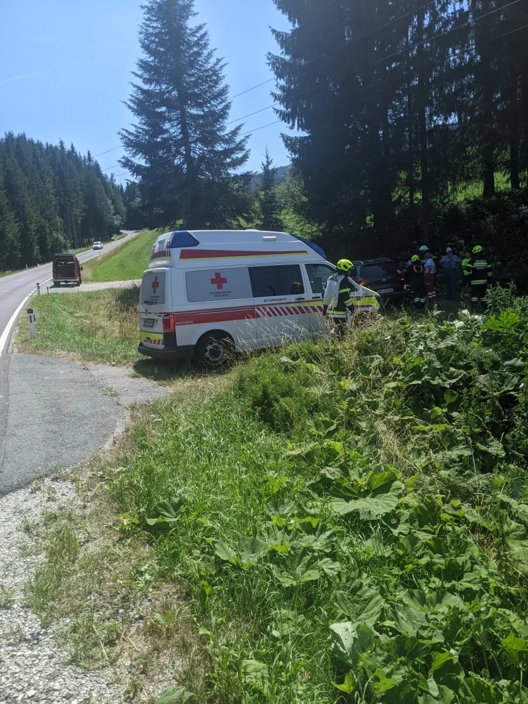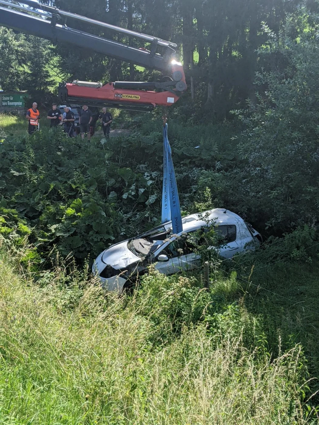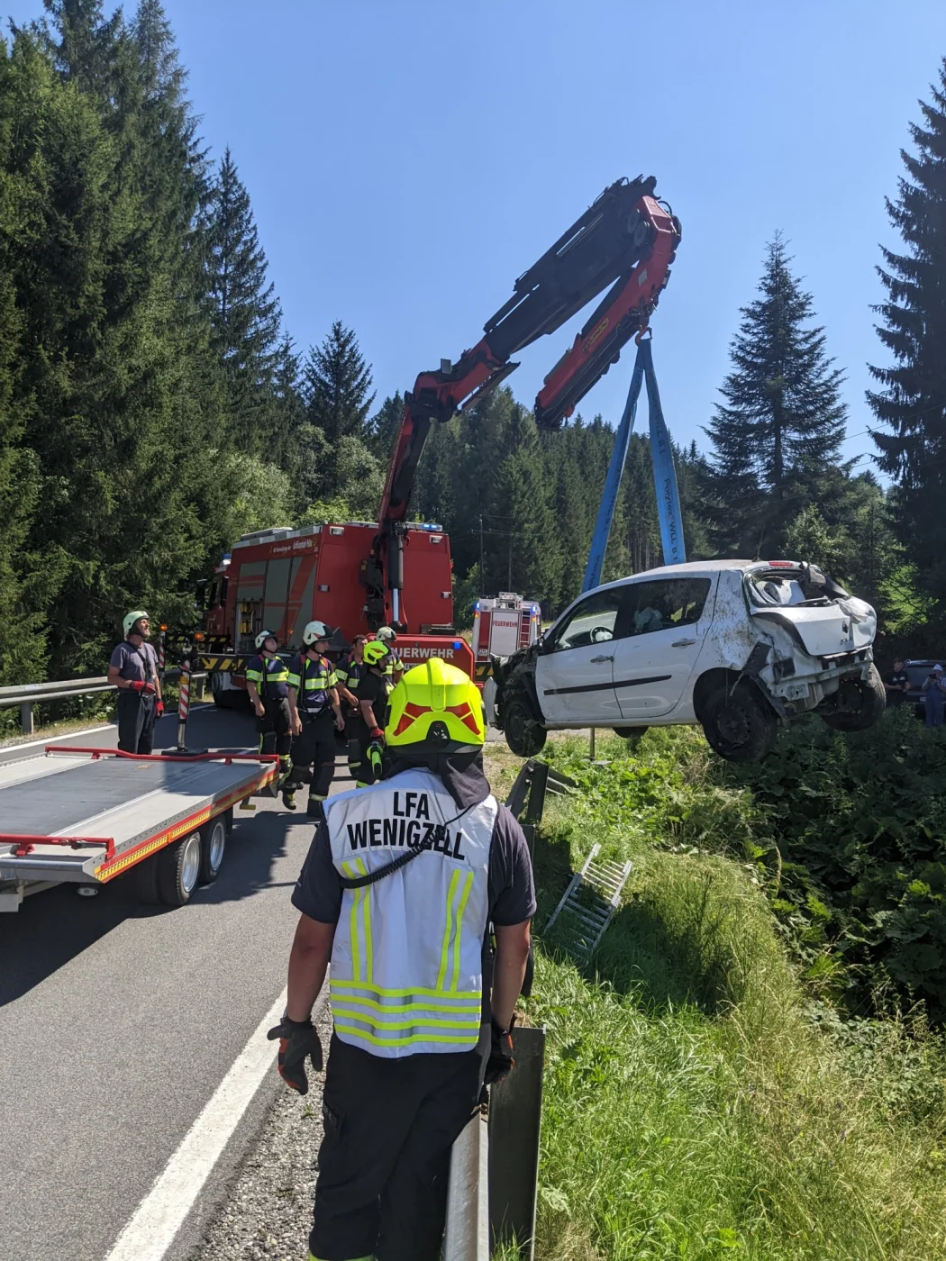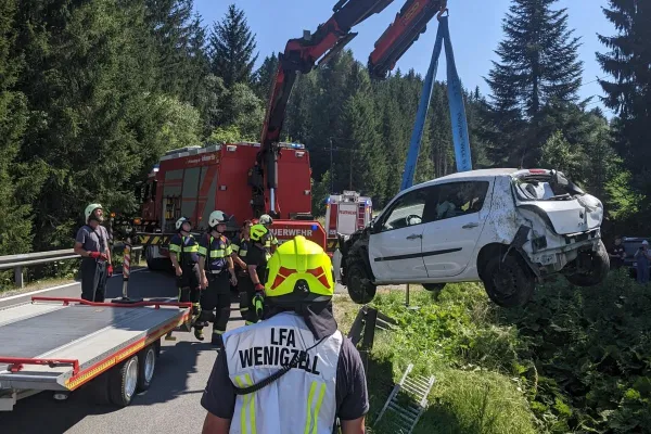 Sofort kümmerten sich unsere Feuerwehrsanitäter um die verletzte Frau, welche bereits das Fahrzeug verlassen konnte und von einem Anrainer betreut wurde, Rotes Kreuz und Polizei wurden bereits mit uns mitalarmiert. Seitens der Feuerwehr Wenigzell wurde der Verkehr geregelt, das Fahrzeug gesichert, Brandschutz aufgebaut, sowie zur Unterstützung für die Bergungsarbeiten das SRF Pöllau nachalarmiert, welches nach wenigen Minuten am Einsatzort eintraf. Nachdem die Polizei die Aufnahmen abgeschlossen hatte, konnte der PKW geborgen und einem Abschleppunternehmen übergeben werden, währenddessen wurde die Verletzte Person bereits mit dem Roten Kreuz abtransportiert.