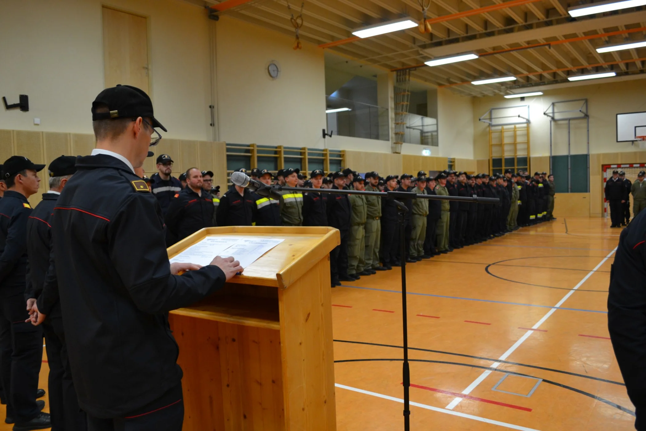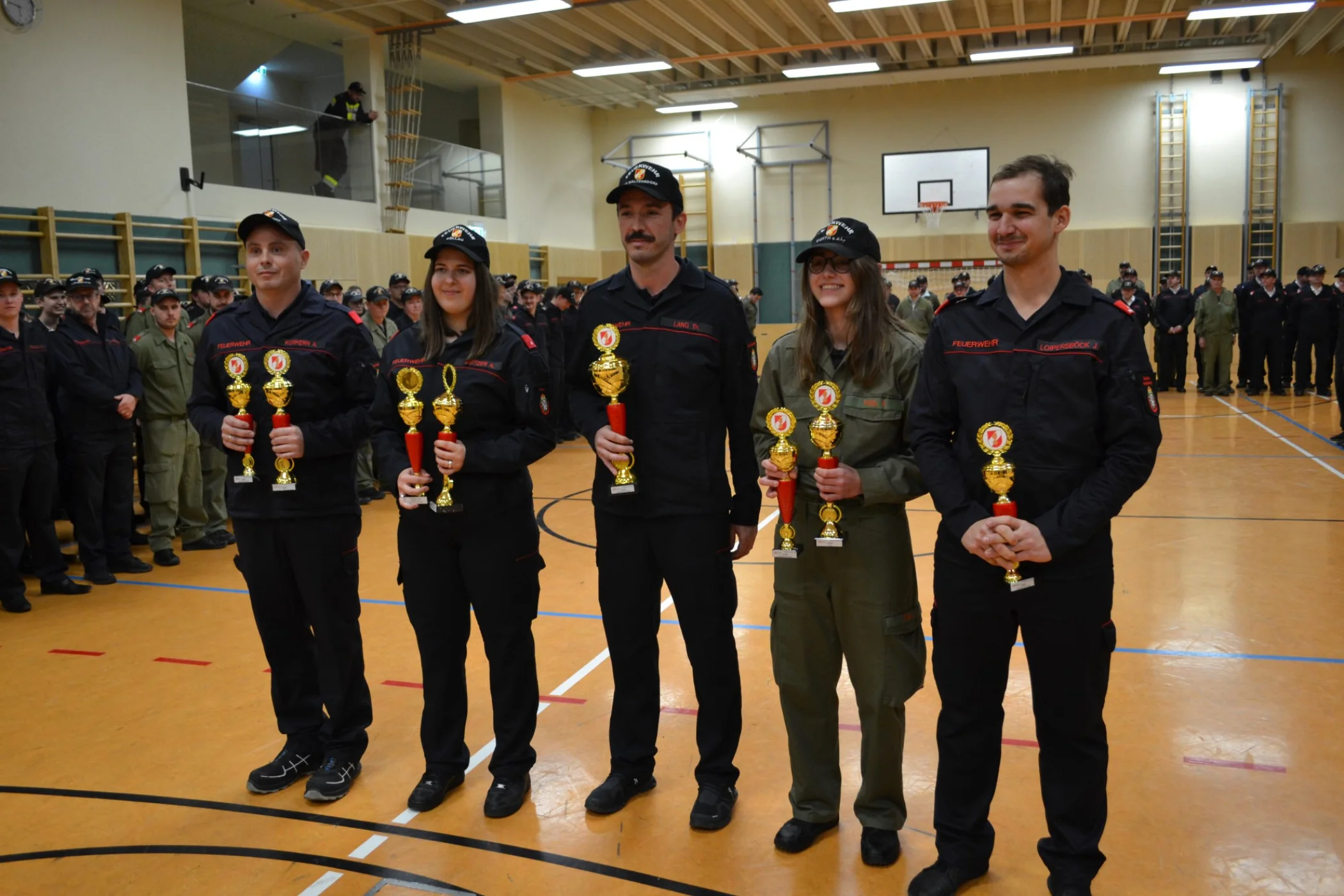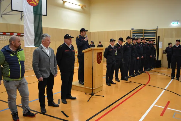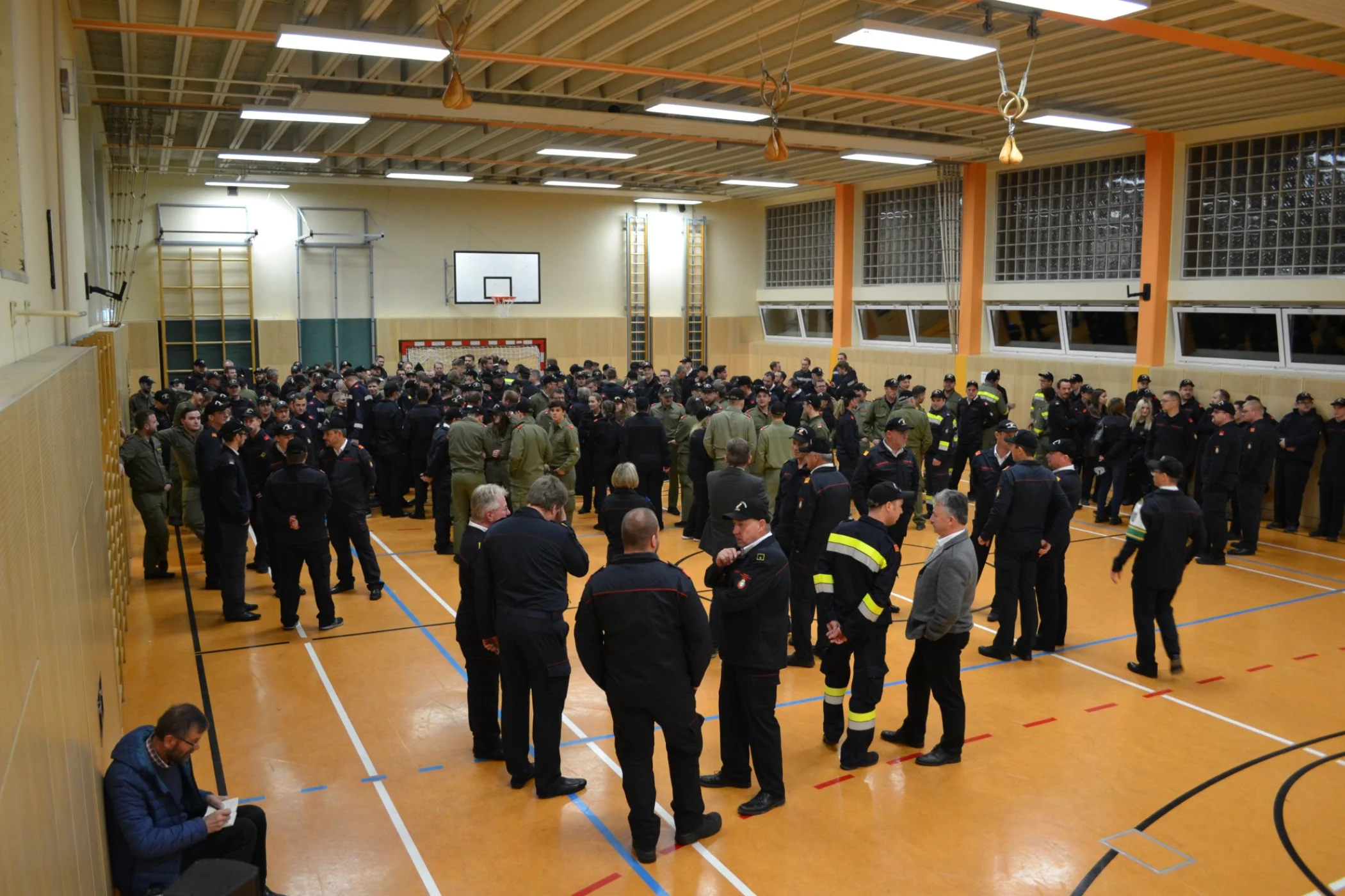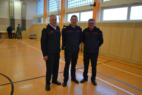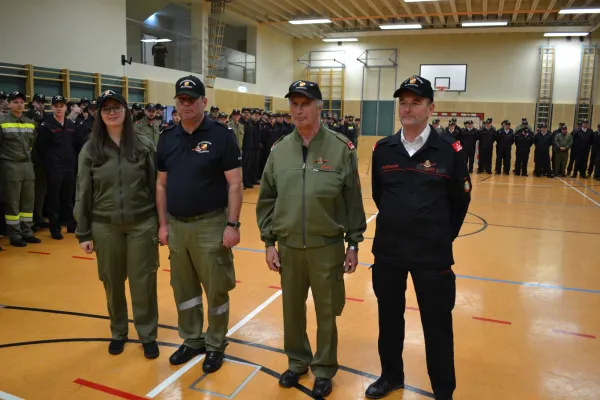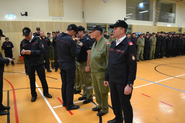 Nachdem alle Teilnehmer den Bewerb beendet hatten, konnten wir um 17:00 Uhr mit der Schlusskundgebung im Turnsaal des Begegnungszentrums anfangen. Die ca. 300 anwesenden Personen wurden von unseren ABI Markus Allmer zum Antreten gebeten. Danach konnte der Funkbeauftragte des BFVs BI d.F. Hannes Haindl die Ehrengäste begrüßen und um ihre Grußworte bitten. Unter den Ehrengästen waren folgende Personen anwesend: