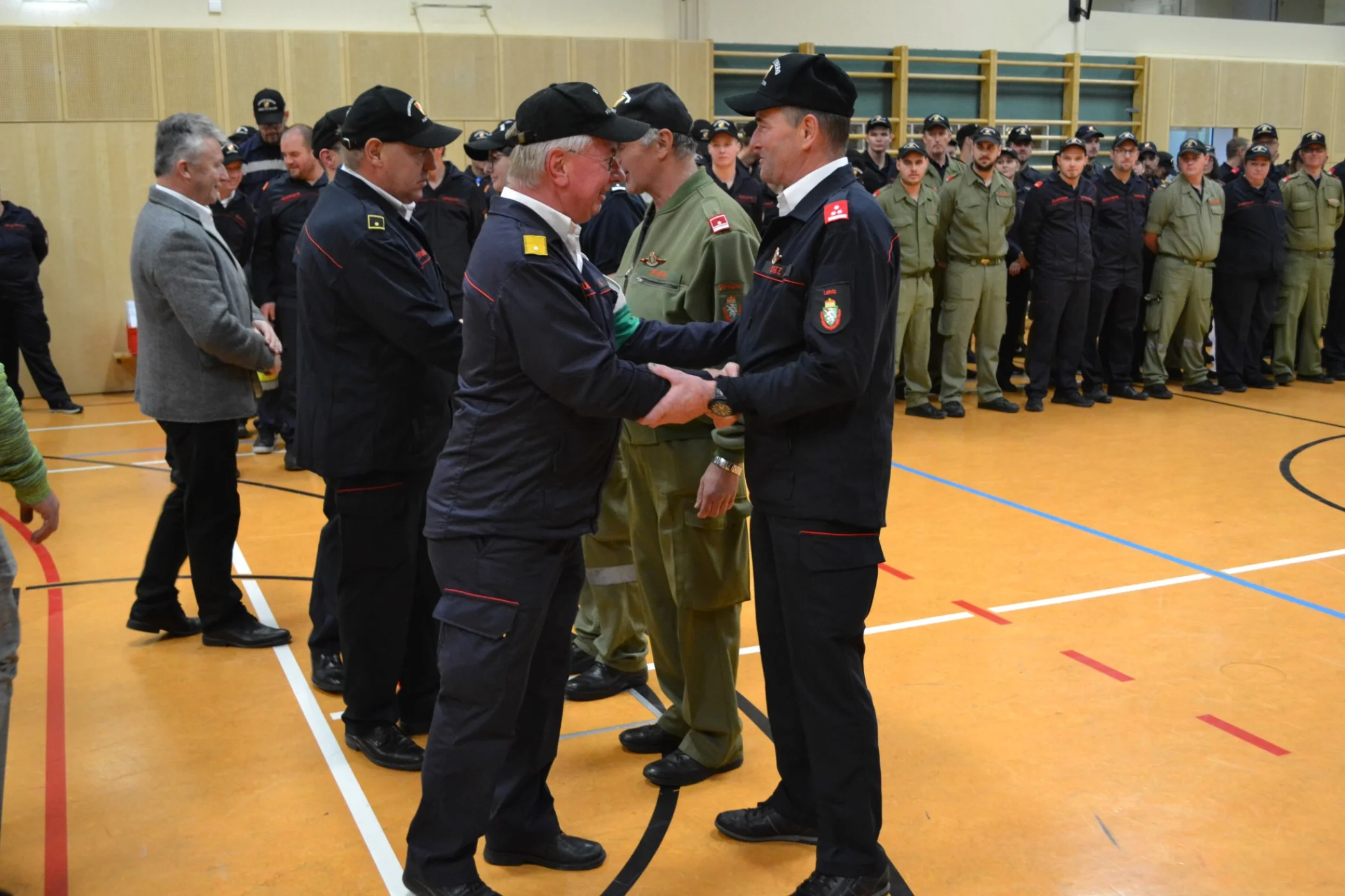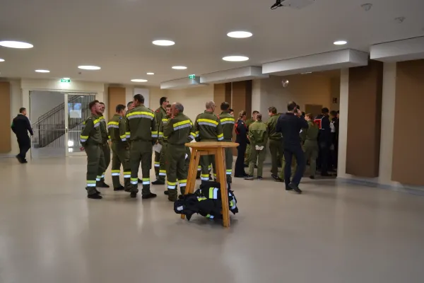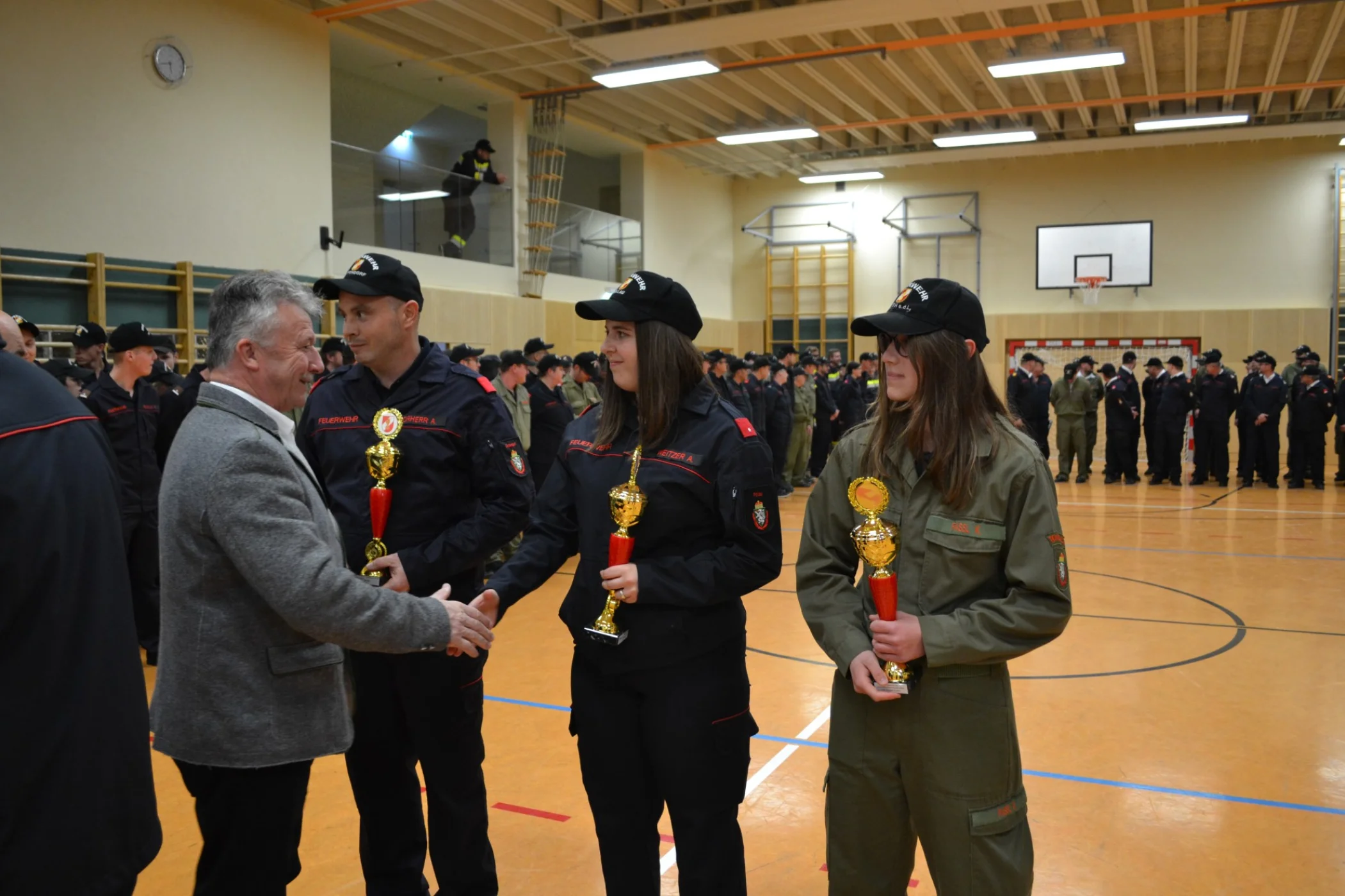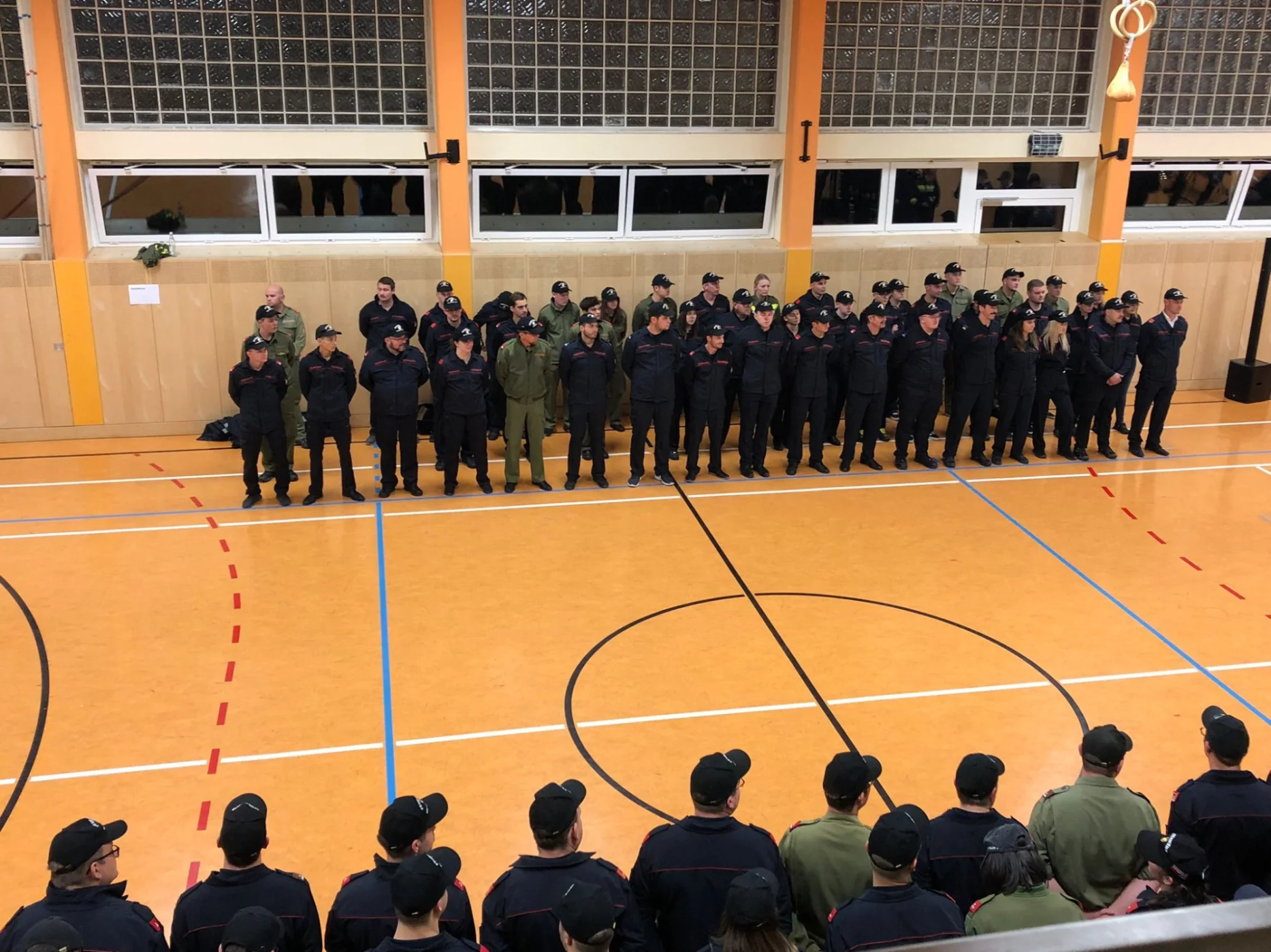 Nachdem alle Teilnehmer den Bewerb beendet hatten, konnten wir um 17:00 Uhr mit der Schlusskundgebung im Turnsaal des Begegnungszentrums anfangen. Die ca. 300 anwesenden Personen wurden von unseren ABI Markus Allmer zum Antreten gebeten. Danach konnte der Funkbeauftragte des BFVs BI d.F. Hannes Haindl die Ehrengäste begrüßen und um ihre Grußworte bitten. Unter den Ehrengästen waren folgende Personen anwesend: