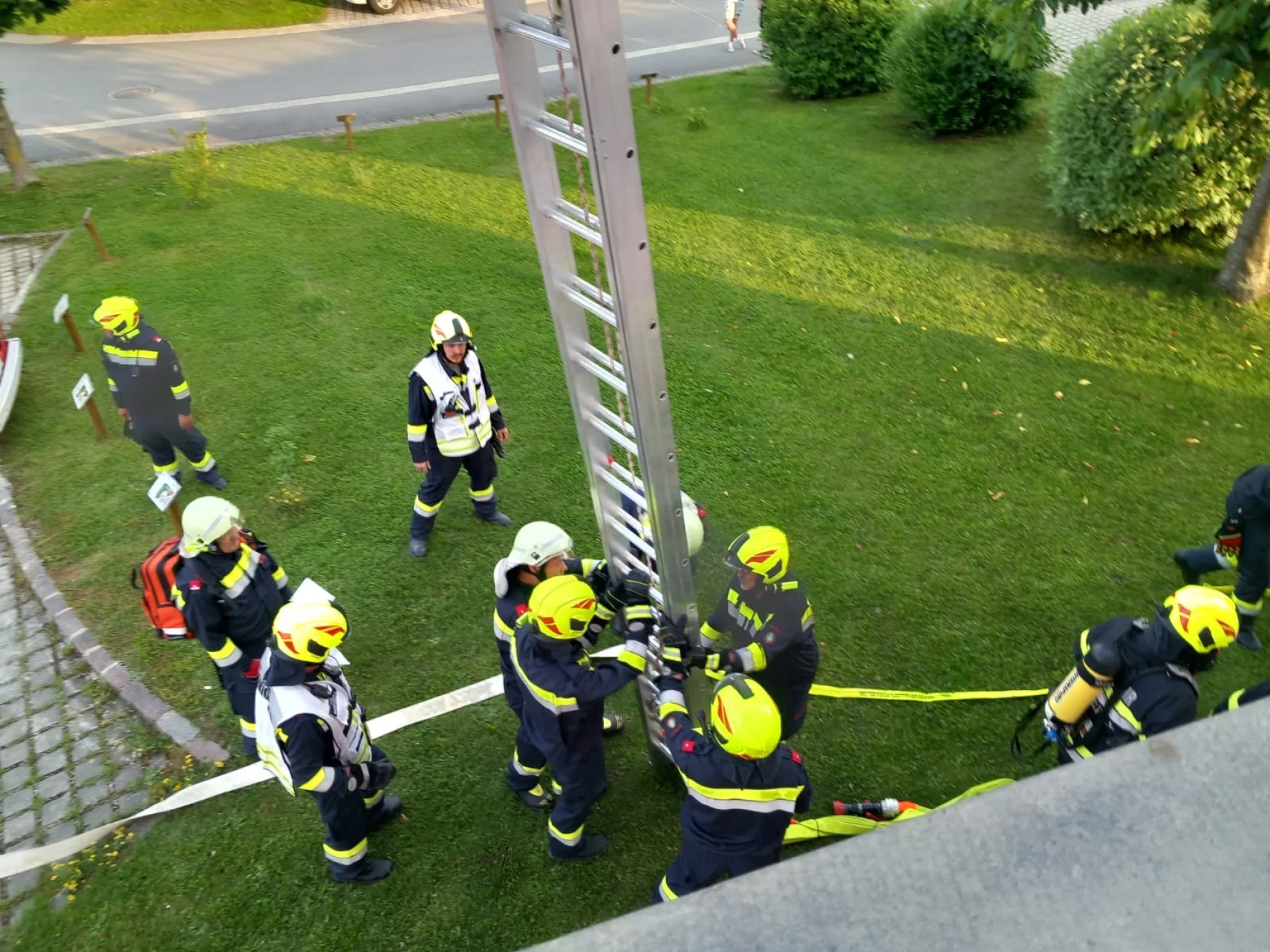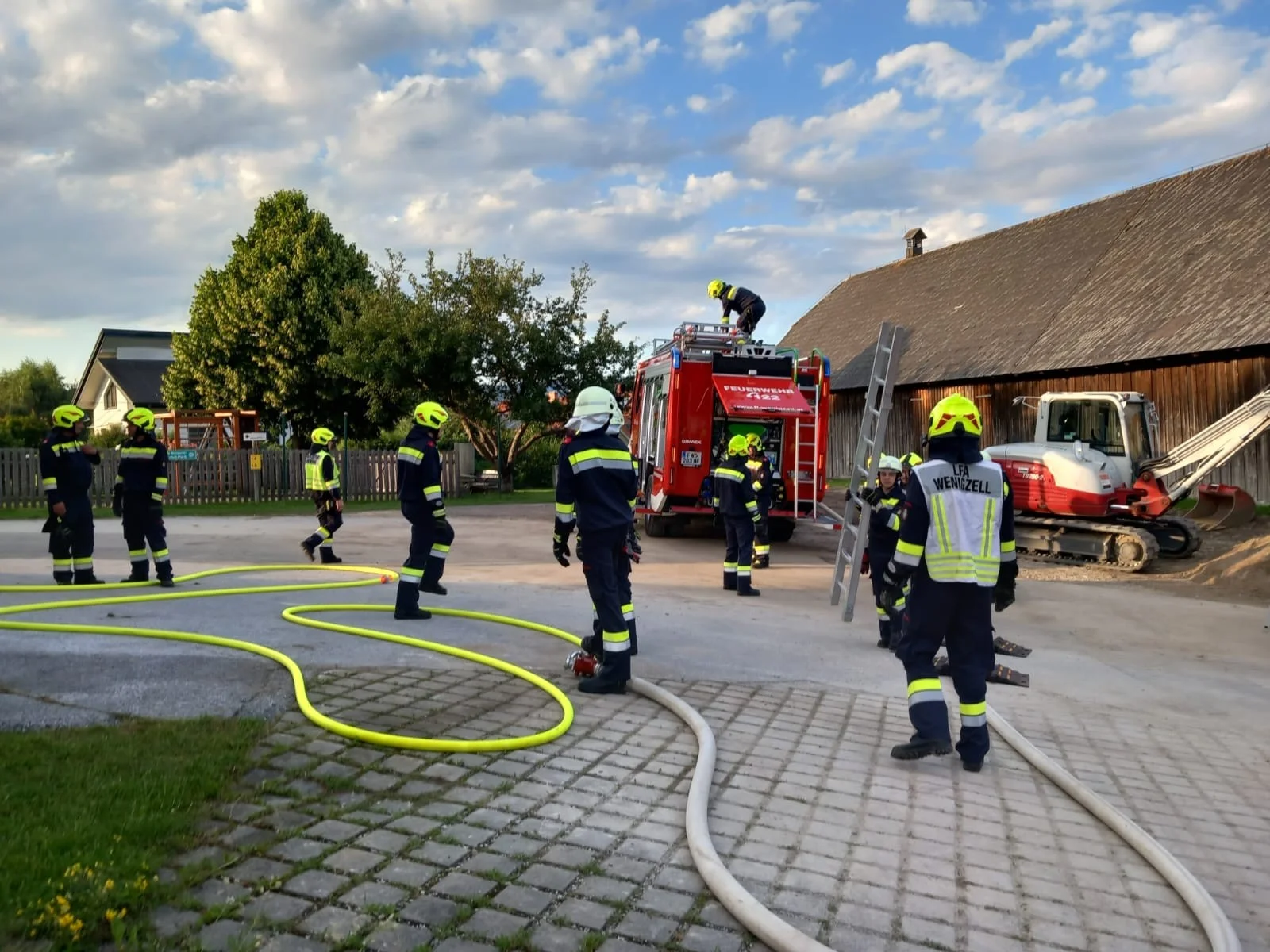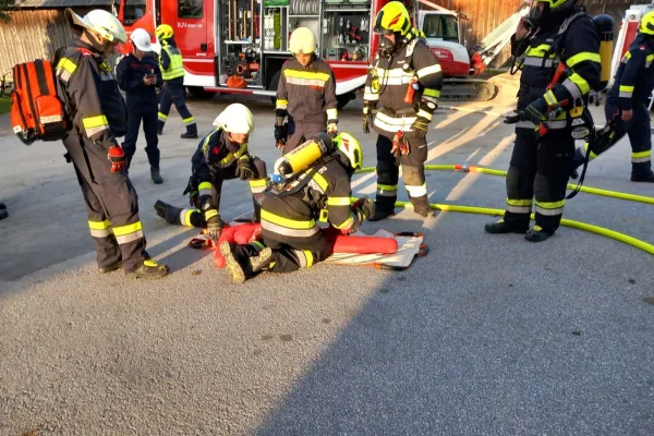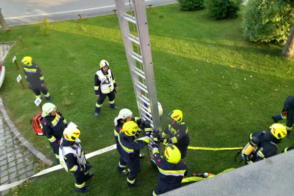 Am Übungsort angekommen, begann sofort die Lageerkundung, bei dieser wurde festgestellt, dass im Bereich des Stiegenhauses ein Brand ausbrach und somit den Fluchtweg für die vermissten Personen versperrte. Dadurch lautete der Einsatzbefehl: Menschenrettung über den Leiterweg. Unverzüglich machte sich die Mannschaft des LFAs an die Arbeit und baute die zweiteilige Schiebeleiter des Fahrzeuges auf und begann mit der Menschenrettung. Zeitgleich machte sich ein Atemschutztrupp des RLFAs auf den Weg um im Inneren des Gebäudes nach der letzten vermissten Person zu suchen. Nachdem diese gerettet war, konnte mit der Schlusskundgebung begonnnen werden. Ein großer Augenmerk wurde bei dieser Übung auf die richtige Verwendung von Leitern gelegt. Nach ca. 2,5 Stunden Übung lud die FF-Wenigzell noch alle teilnehmenden Personen zu einer Jause im Rüsthaus Wenigzell ein.