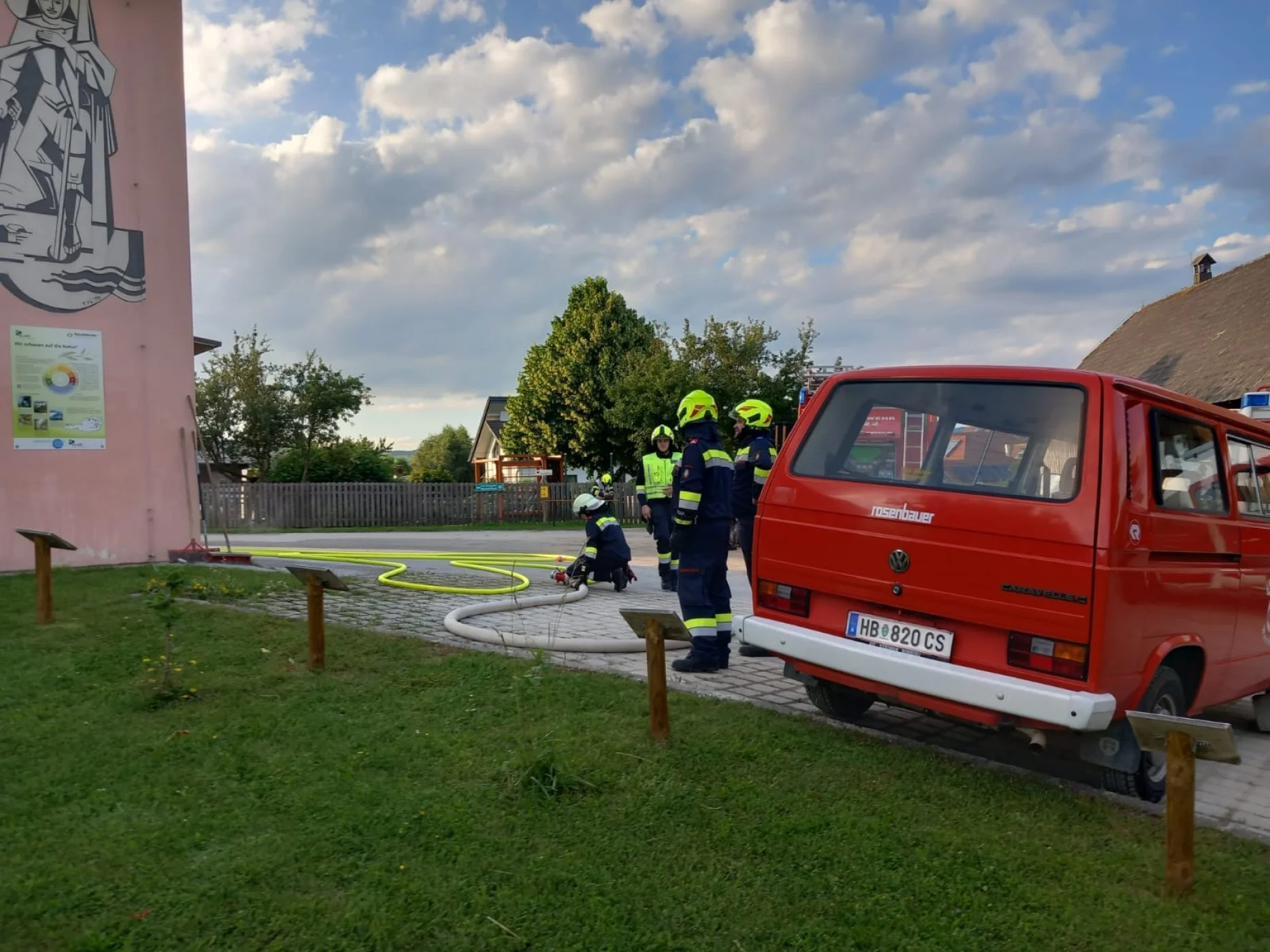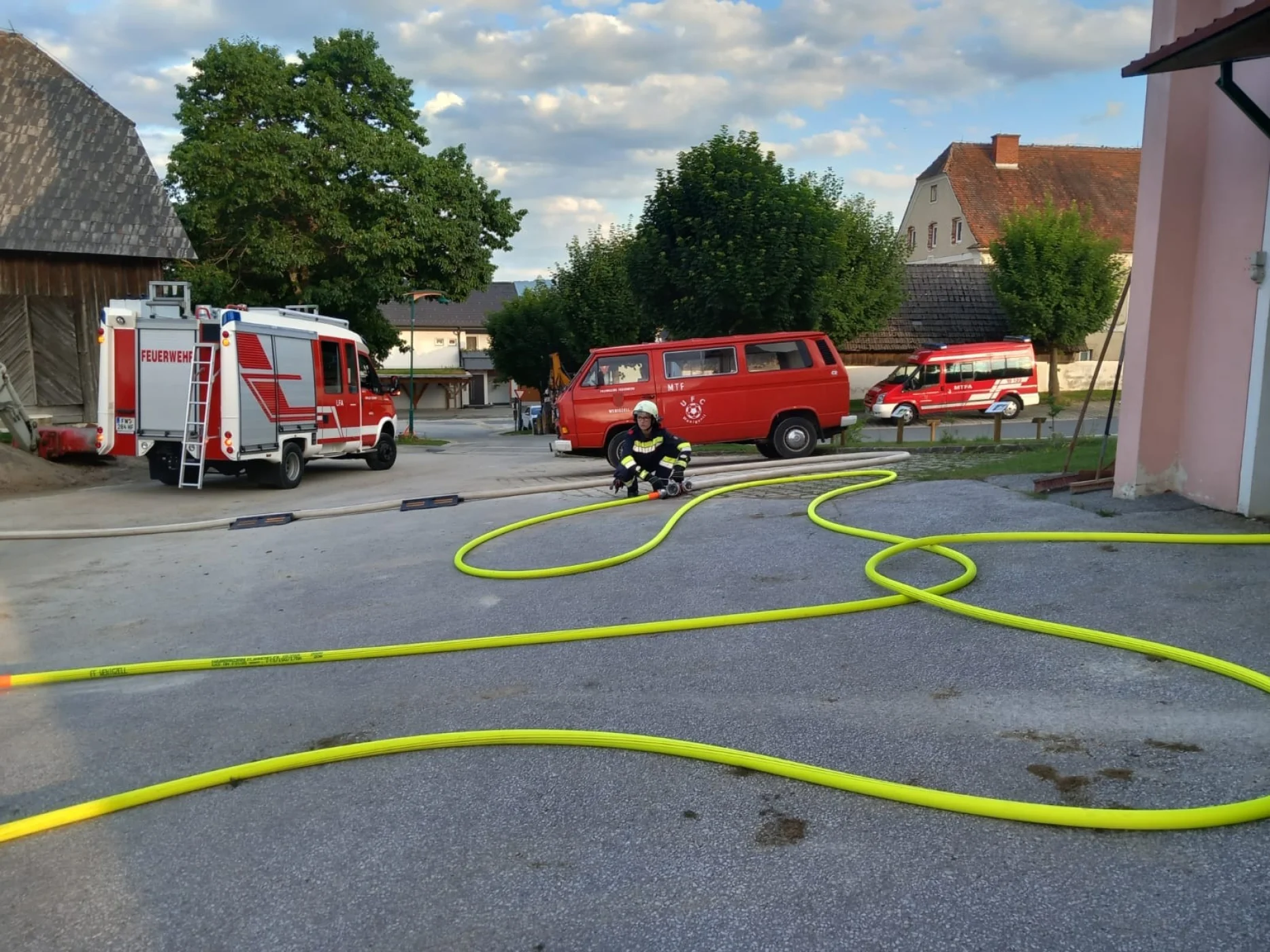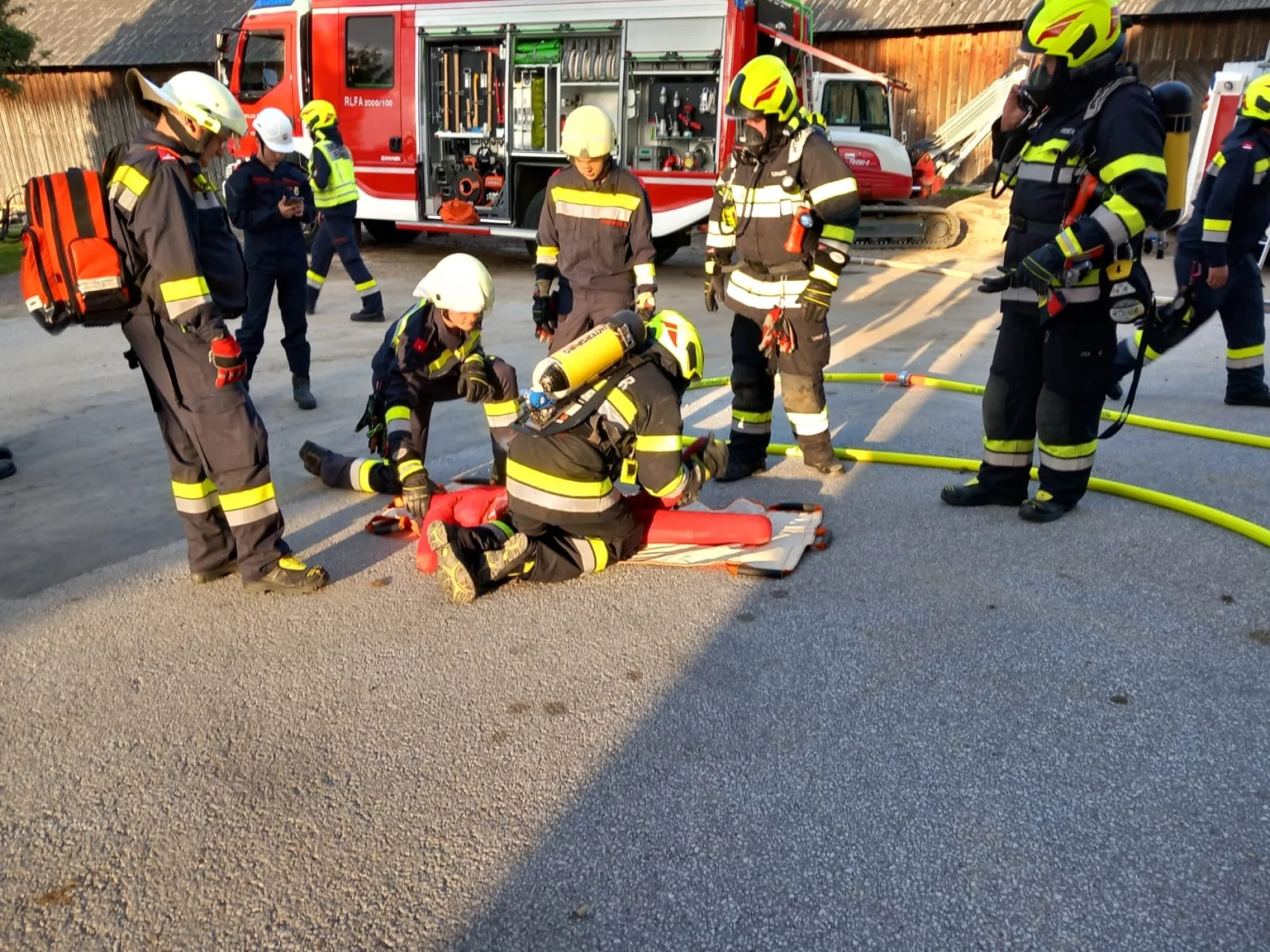 Am Übungsort angekommen, begann sofort die Lageerkundung, bei dieser wurde festgestellt, dass im Bereich des Stiegenhauses ein Brand ausbrach und somit den Fluchtweg für die vermissten Personen versperrte. Dadurch lautete der Einsatzbefehl: Menschenrettung über den Leiterweg. Unverzüglich machte sich die Mannschaft des LFAs an die Arbeit und baute die zweiteilige Schiebeleiter des Fahrzeuges auf und begann mit der Menschenrettung. Zeitgleich machte sich ein Atemschutztrupp des RLFAs auf den Weg um im Inneren des Gebäudes nach der letzten vermissten Person zu suchen. Nachdem diese gerettet war, konnte mit der Schlusskundgebung begonnnen werden. Ein großer Augenmerk wurde bei dieser Übung auf die richtige Verwendung von Leitern gelegt. Nach ca. 2,5 Stunden Übung lud die FF-Wenigzell noch alle teilnehmenden Personen zu einer Jause im Rüsthaus Wenigzell ein.