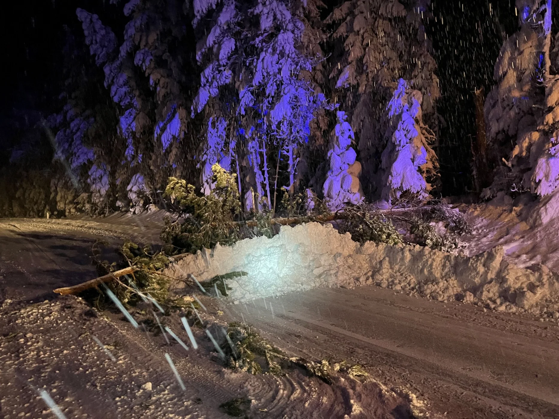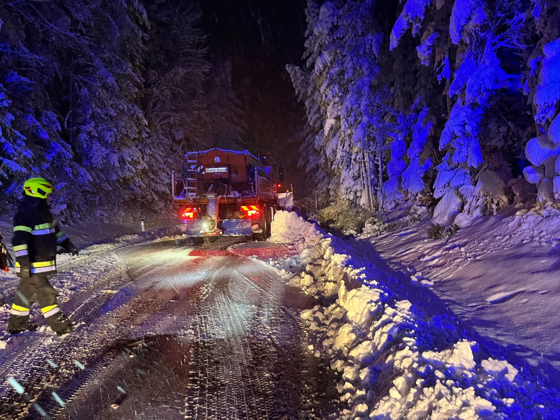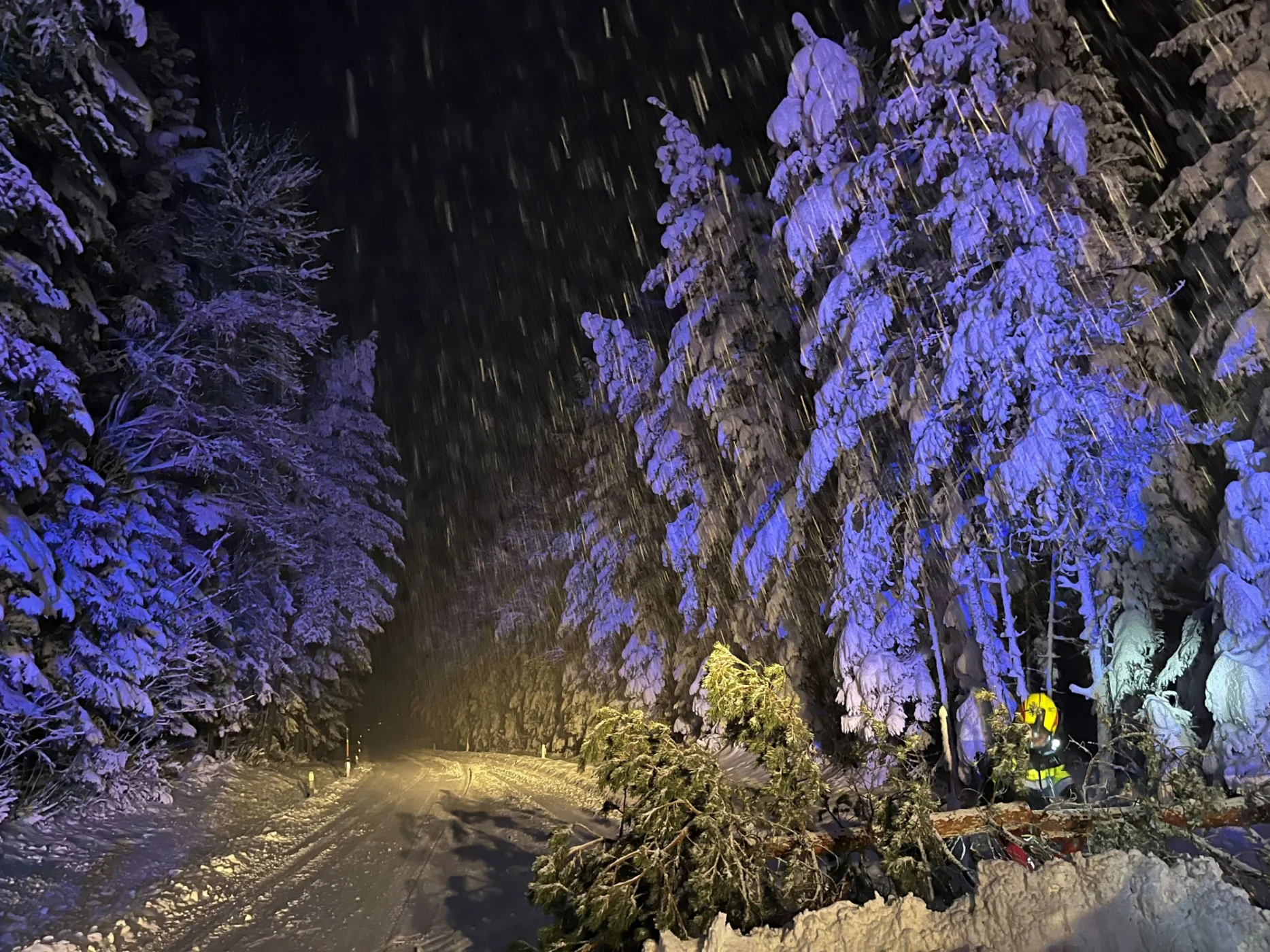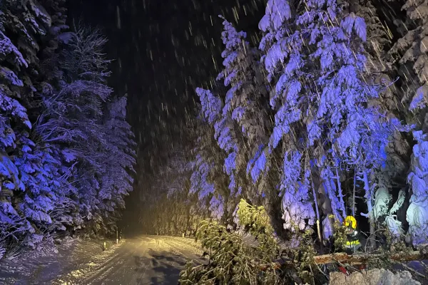 Kurze Zeit später folgte der nächste Einsatz, um 20:20 Uhr wurde die FF-Wenigzell telefonisch zu einer Baumbergung auf die L-408 Höhe Flachbauer gerufen. Unverzüglich rückte das RLFA 2000-100 zum ca. 4 km entfernten Einsatzort aus. Durch die schwere Schneelast ist ein Baum abgebrochen und über die Landesstraße gefallen. Nachdem der Einsatzort abgesichert war, konnte mit der Baumbergung begonnen werden. bei dieser unterstützte die Straßenmeisterei mit einem Räumfahrzeug. Danach konnte um nach einer dreiviertel Stunde wieder eingerückt und die Einsatzbereitschaft hergestellt werden.