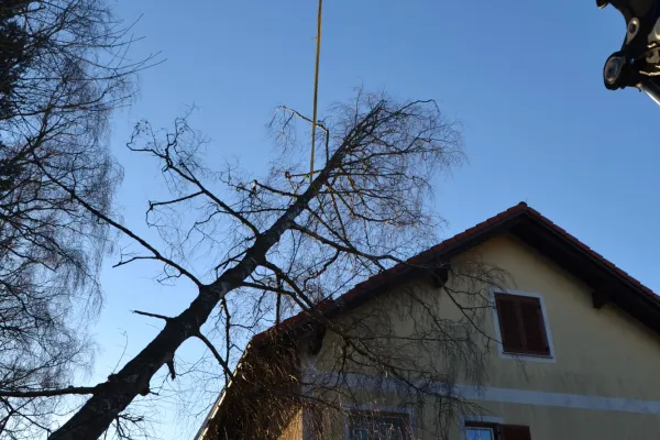 Sofort wurde die Einsatzstelle abgesichert und die Straße für den Verkehr gesperrt. Nach Rücksprache mit der Einsatzleitung wurde ein ortsansässiges Kranunternehmen nachgefordert, welches den Baum mit schwerem Gerät vom Dach weghebte. Gott sei Dank entstand kein Personenschaden und nur ein kleiner Sachschaden - es waren lediglich ein paar Ziegel defekt.