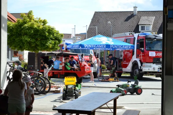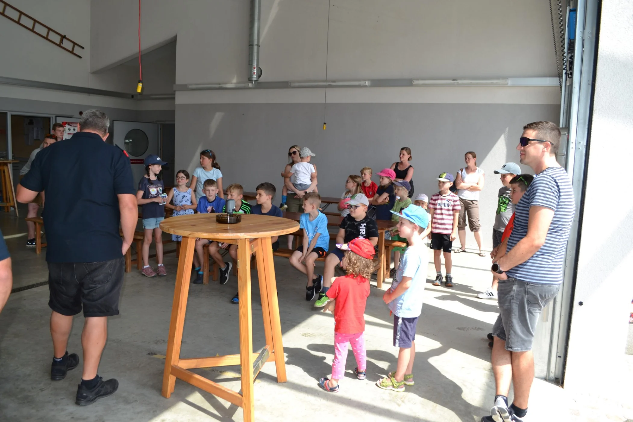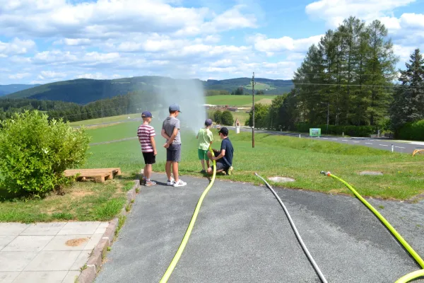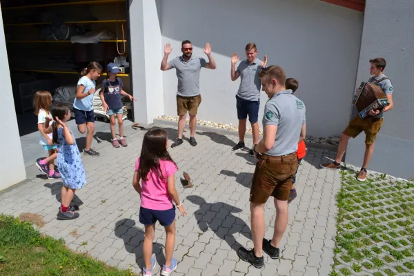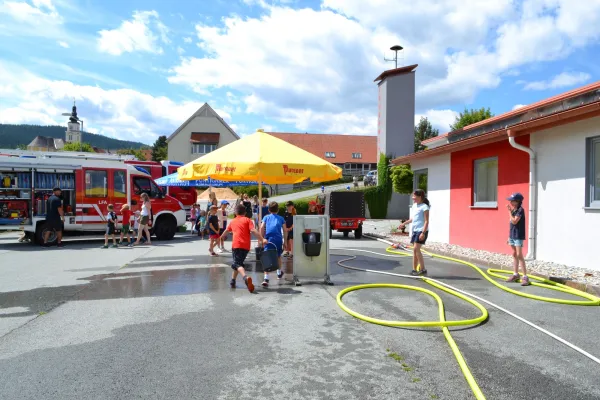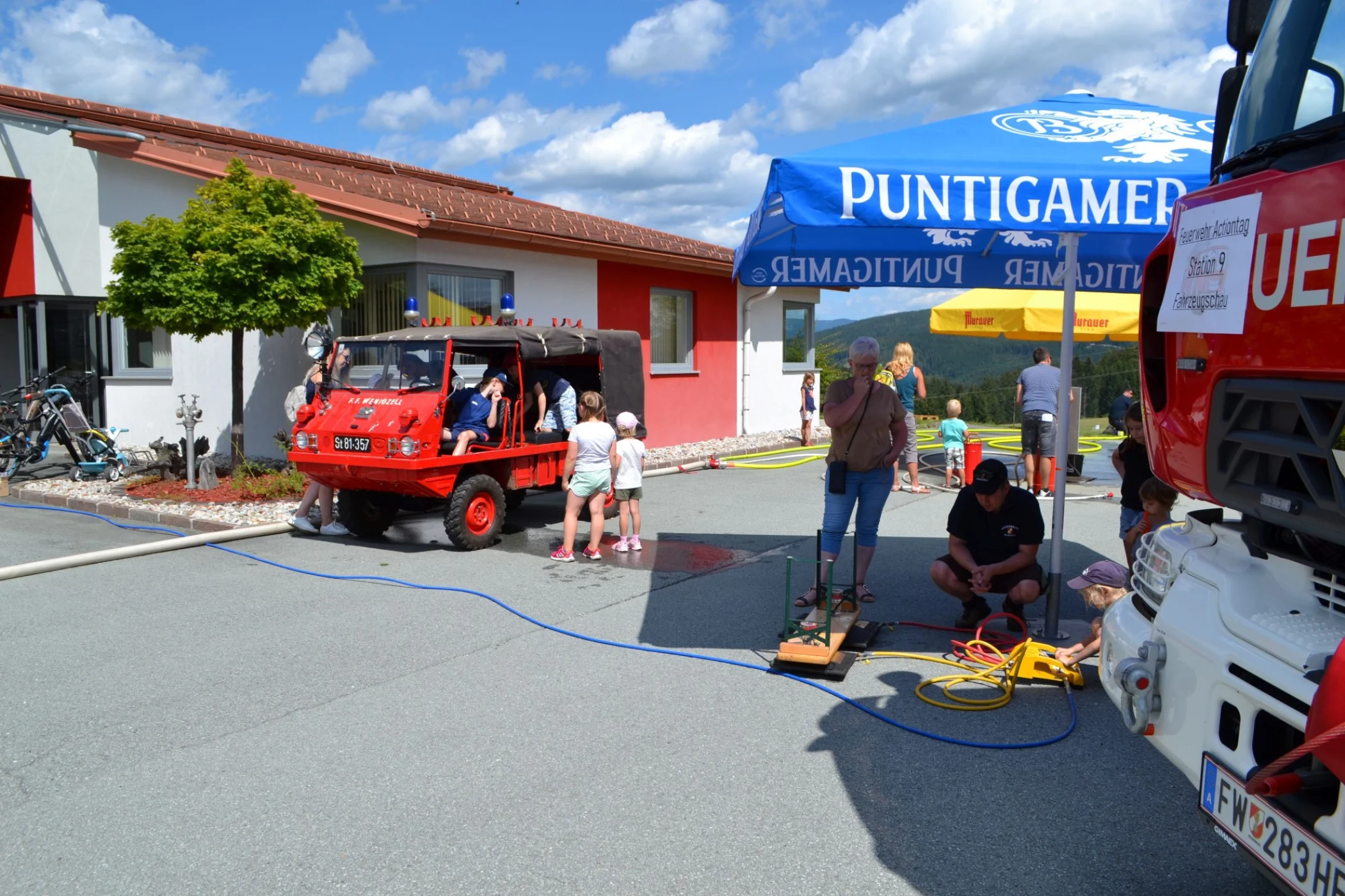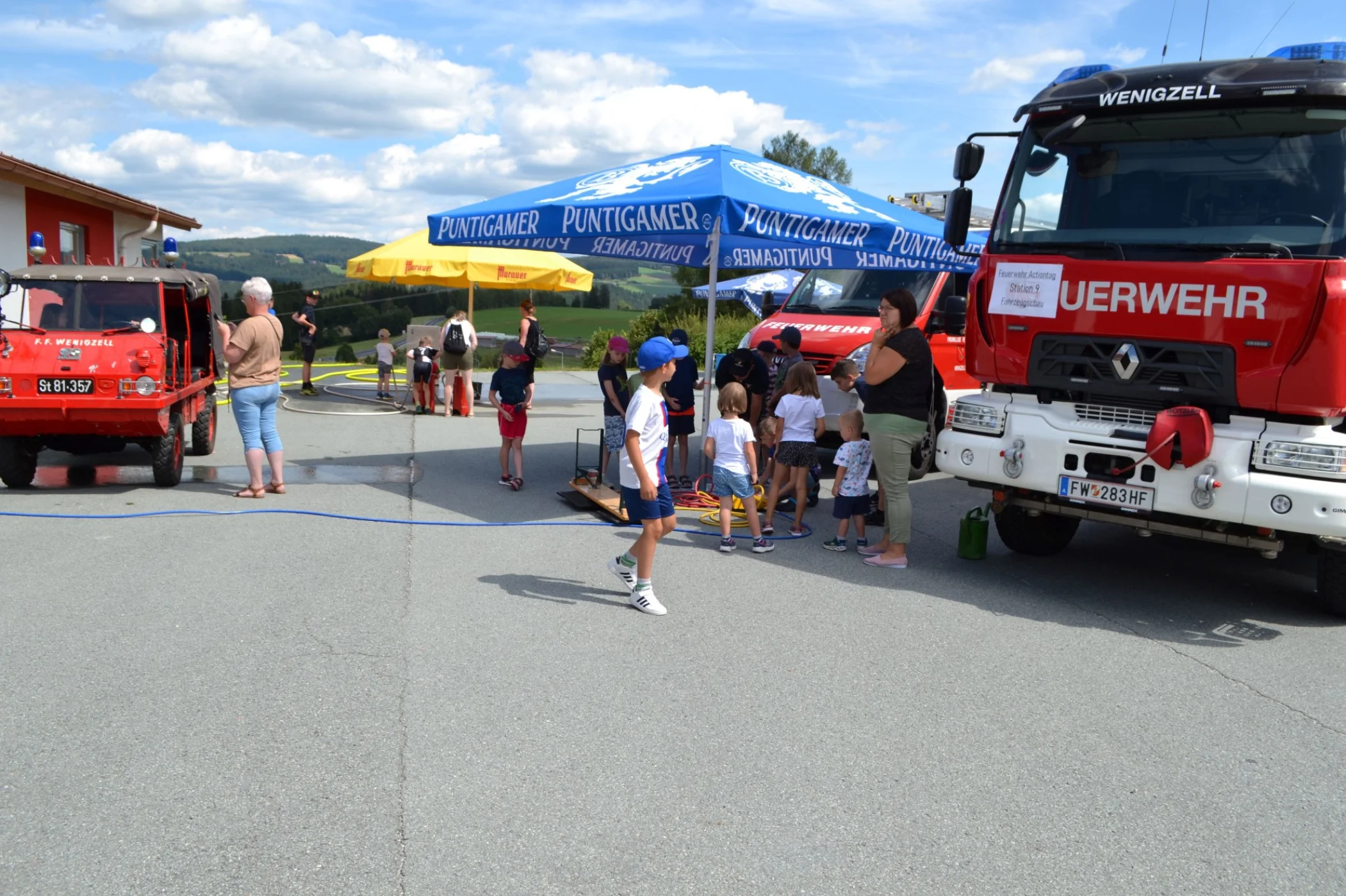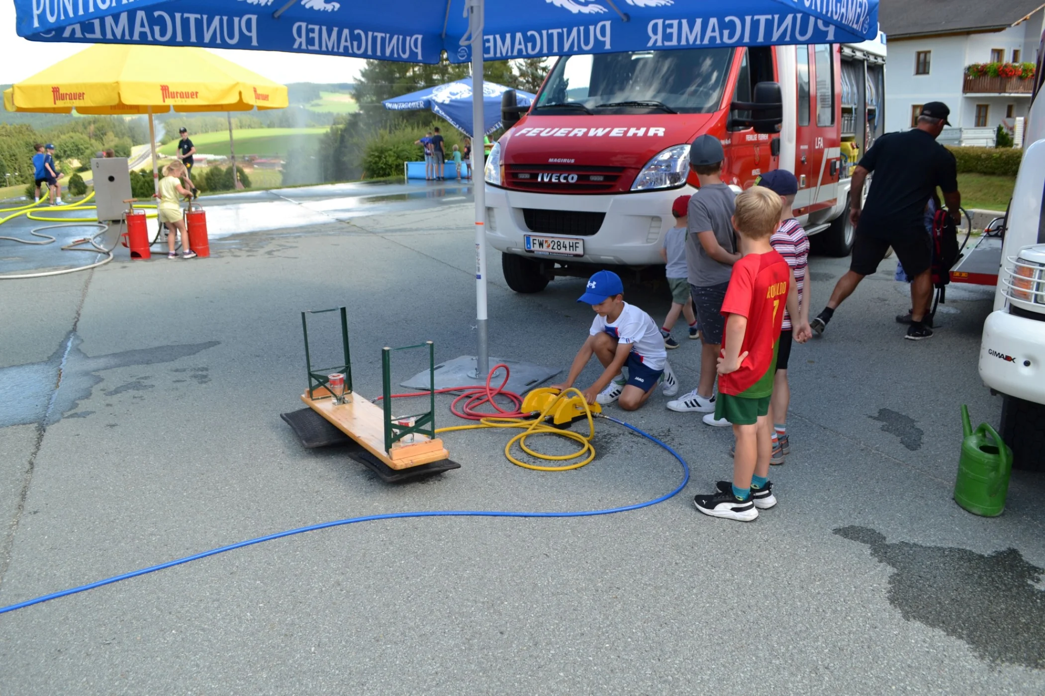 In vielen Stationen konnten die rund 30 Kinder einen spannenden und lustigen Nachmittag erleben. Ein besonderes Highlight war sicher die gesamte Waldbrandausrüstung, mit dieser konnte gefahrlos für die richtige Abkühlung an einen heißen Tag gesorgt werden. Auch die "Entenrettung" aus dem Falttank bereitete den Kindern viel Freude. Doch es gab noch viel mehr zu erleben. So konnte mit den Kübelspritzen aus der Jugendbewerbsbahn geübt, mittels Funkgeräte eine Schnitzeljagd gemacht und alle Fahrzeuge mit Ausrüstung genauestens besichtigt werden. Als kleine Abkühlung zwischendurch wurde für alle etwas Eis ausgeteilt. Bei den Wenigzeller Platlla gab es auch einiges zu entdecken und üben, so wurden mit den Kleinen diverse Schuhplattler probiert und die Grundschritte zum Platteln gelernt. Zum Abschluss gab es für alle eine kleine Jause und Getränke dazu.