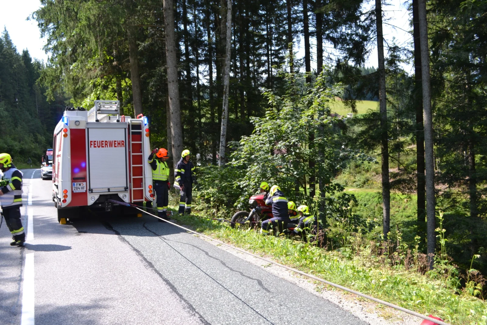 Nach der Ankunft am ca. 3 km entfernten Einsatzort, ergab sich folgende Lage, aus bisher ungeklärter Ursache ist ein Motorrad von der Straße abgekommen und im Straßengraben liegen geblieben. Dabei wurde der Fahrer leicht verletzt. Die Tätigkeit der Feuerwehr bestanden darin die Unfallstelle abzusichern, den Brandschutz aufzubauen und die Feuerwehrsanitäter betreuten den Motorradfahrer bis zum Eintreffen der Rettung. Nachdem die leicht verletzte Person zur Kontrolle in das Krankenhaus transportiert war und die Polizei die Unfallstelle freigegeben hat, konnte mit der Bergung des verunfallten Motorrades begonnen werden. Nachdem die Unfallstelle gereinigt war, konnte nach ca. einer Stunde wieder eingerückt und die Einsatzbereitschaft hergestellt werden.